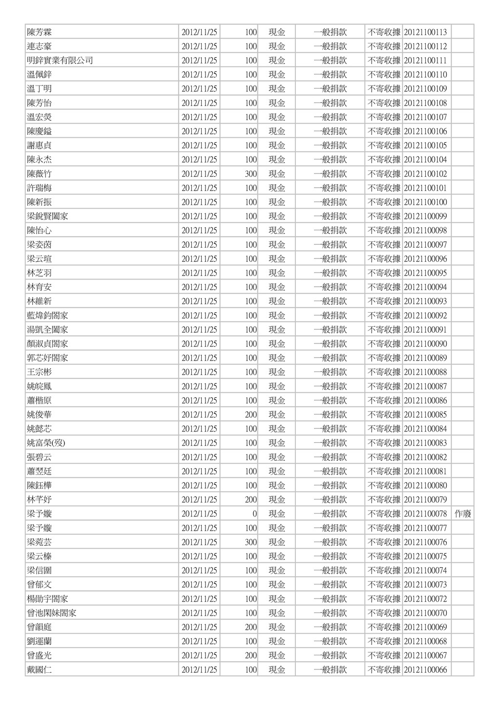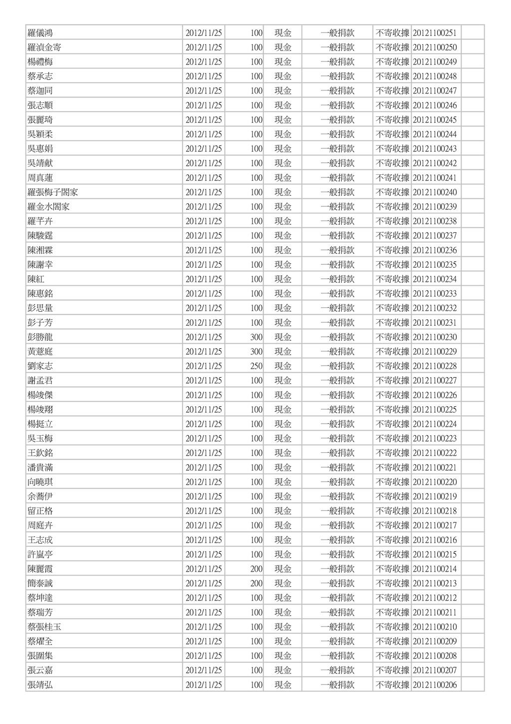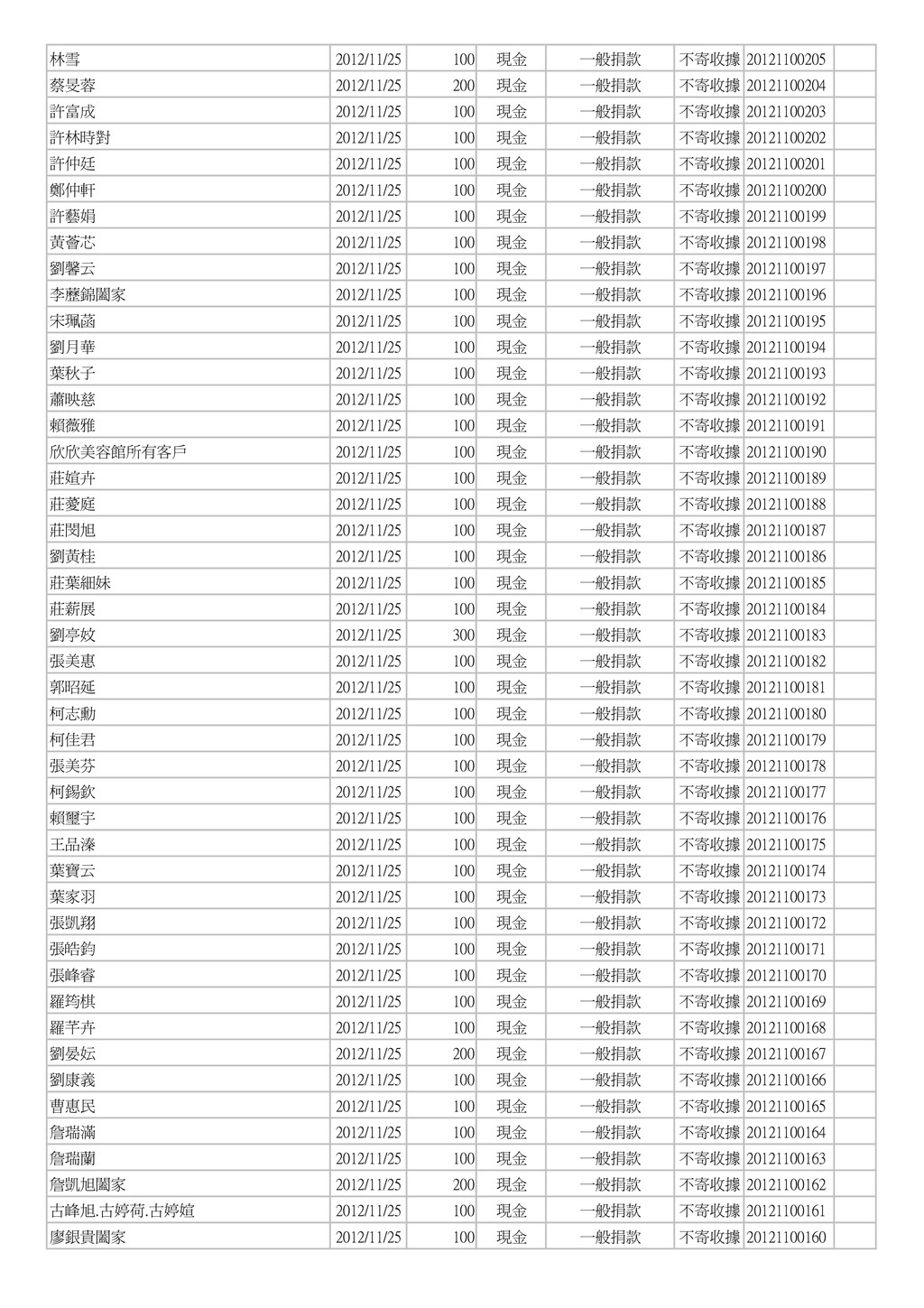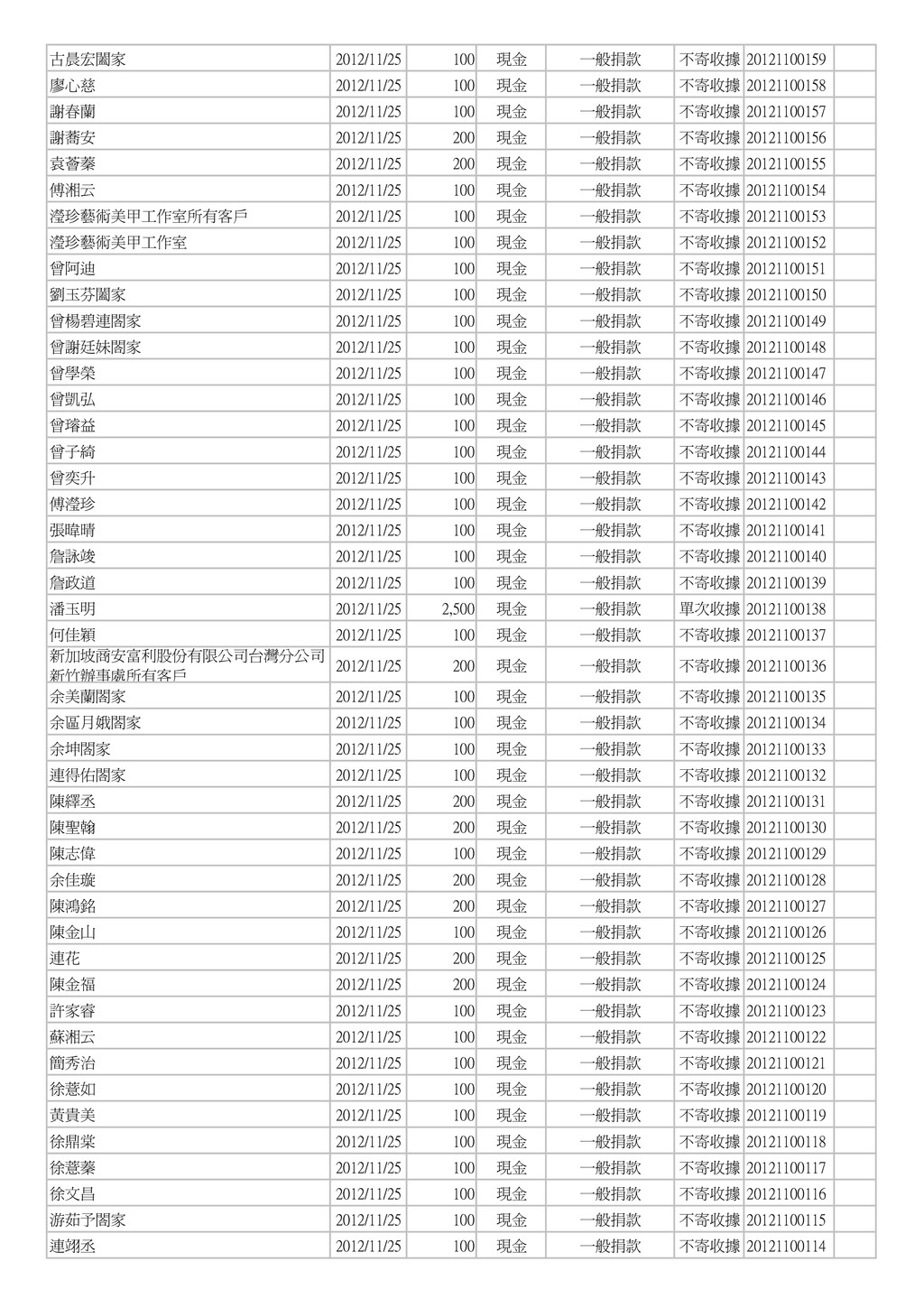 500 郵政劃撥 一般捐款 單次收據 004454 手開 葉春廷 2012/11/12 25 郵政劃撥 一般捐款 單次收據 004453 手開 葉春廷 2012/11/11 25 郵政劃撥 一般捐款 單次收據 004452 手開 康美鳳 2012/11/11 1,000 現金 一般捐款 不寄收據 003073 手開 素食麵家族 2012/11/11 3,000 現金 一般捐款 不寄收據 003072 手開 林育霆 2012/11/11 2,000 現金 一般捐款 不寄收據 003071 手開 蕭榮華 2012/11/11 1,000 現金 一般捐款 不寄收據 003070 手開 葉春廷 2012/11/10 50 郵政劃撥 一般捐款 單次收據 004451 手開 葉春廷 2012/11/09 25 郵政劃撥 一般捐款 單次收據 004450 手開 葉春廷 2012/11/08 25 郵政劃撥 一般捐款 單次收據 004449 手開 樂活鮮瓶 2012/11/08 1,500 現金 一般捐款 不寄收據 003069 手開 台灣圓緣慈善推廣協會 2012/11/08 5,000 現金 一般捐款 單次收據 20121100026 台灣圓緣慈善推廣協會 2012/11/08 5,000 現金 一般捐款 單次收據 20121100025 陳卉蓁 2012/11/07 2,000 郵政劃撥 一般捐款 單次收據 004448 手開 葉治有 2012/11/07 1,000 郵政劃撥 一般捐款 單次收據 004447 手開 葉春廷 2012/11/07 25 郵政劃撥 一般捐款 單次收據 004446 手開 田庚妹 2012/11/07 2,000 現金 一般捐款 不寄收據 003068 手開 賀溫溫 2012/11/07 600 銀行匯款 一般捐款 不寄收據 20121100267 葉春廷 2012/11/06 25 郵政劃撥 一般捐款 單次收據 004445 手開 善心人士 2012/11/06 5,000 現金 一般捐款 單次收據 003067 手開 葉春廷 2012/11/05 25 郵政劃撥 一般捐款 單次收據 004444 手開 楊郭款 2012/11/05 2,000 現金 一般捐款 單次收據 003066 手開 陳錦峰 2012/11/05 500 現金 一般捐款 不寄收據 20121100024 陳佳琪 2012/11/05 500 現金 一般捐款 不寄收據 20121100023 李進豐 2012/11/05 3,000 現金 一般捐款 不寄收據 20121100022 陳華國 2012/11/05 5,000 現金 一般捐款 不寄收據 20121100021 徐火 2012/11/05 1,000 現金 一般捐款 不寄收據 20121100020 鄧秀喜 2012/11/05 3,000 現金 一般捐款 不寄收據 20121100019 黃美芬 2012/11/05 300 現金 一般捐款 不寄收據 20121100018 李哲皓 2012/11/05 1,000 現金 一般捐款 不寄收據 20121100017 黃永輝 2012/11/05 200 現金 一般捐款 不寄收據 20121100016 姜炎 2012/11/05 200 現金 一般捐款 不寄收據 20121100015 進興洗衣店 2012/11/05 200 現金 一般捐款 不寄收據 20121100014 劉恵恵 2012/11/05 500 現金 一般捐款 不寄收據 20121100013 劉鴻展 2012/11/05 500 現金 一般捐款 不寄收據 20121100012 陳美貞 2012/11/05 1,000 現金 一般捐款 不寄收據 20121100011 簡瑞霖 2012/11/05 1,000 現金 一般捐款 不寄收據 20121100010 邱奕生 2012/11/05 1,000 現金 一般捐款 不寄收據 20121100009 黃振昌 2012/11/05 1,000 現金 一般捐款 不寄收據 20121100008 張淑芳 2012/11/05 500 現金 一般捐款 不寄收據 20121100006 郭仁懷 2012/11/05 500 現金 一般捐款 不寄收據 20121100005 傅鑫財 2012/11/05 500 現金 一般捐款 不寄收據 20121100004 黃哲書 2012/11/05 500 現金 一般捐款 不寄收據 20121100003 陳永煥 2012/11/05 1,000 現金 一般捐款 不寄收據 20121100002 葉春廷 2012/11/04 25 郵政劃撥 一般捐款 單次收據 004443 手開