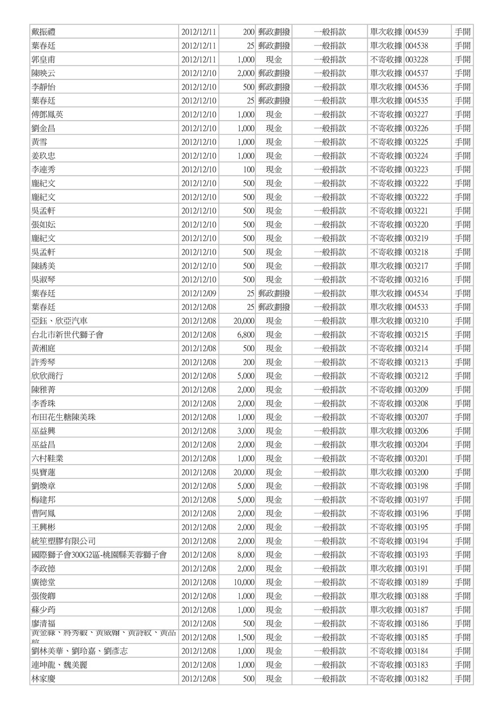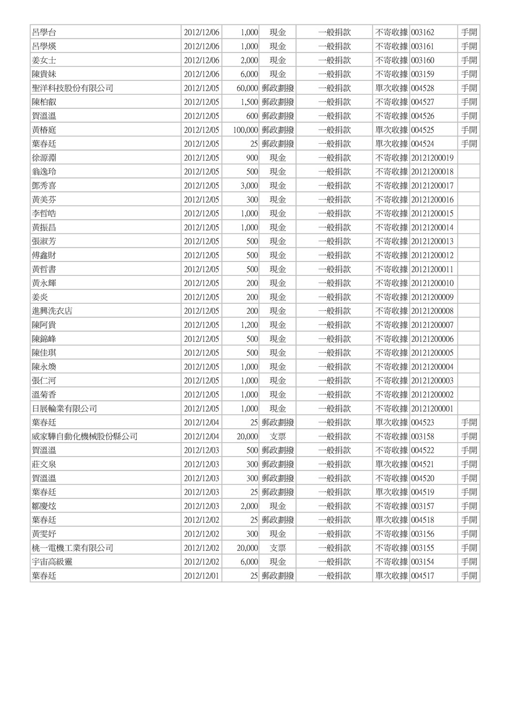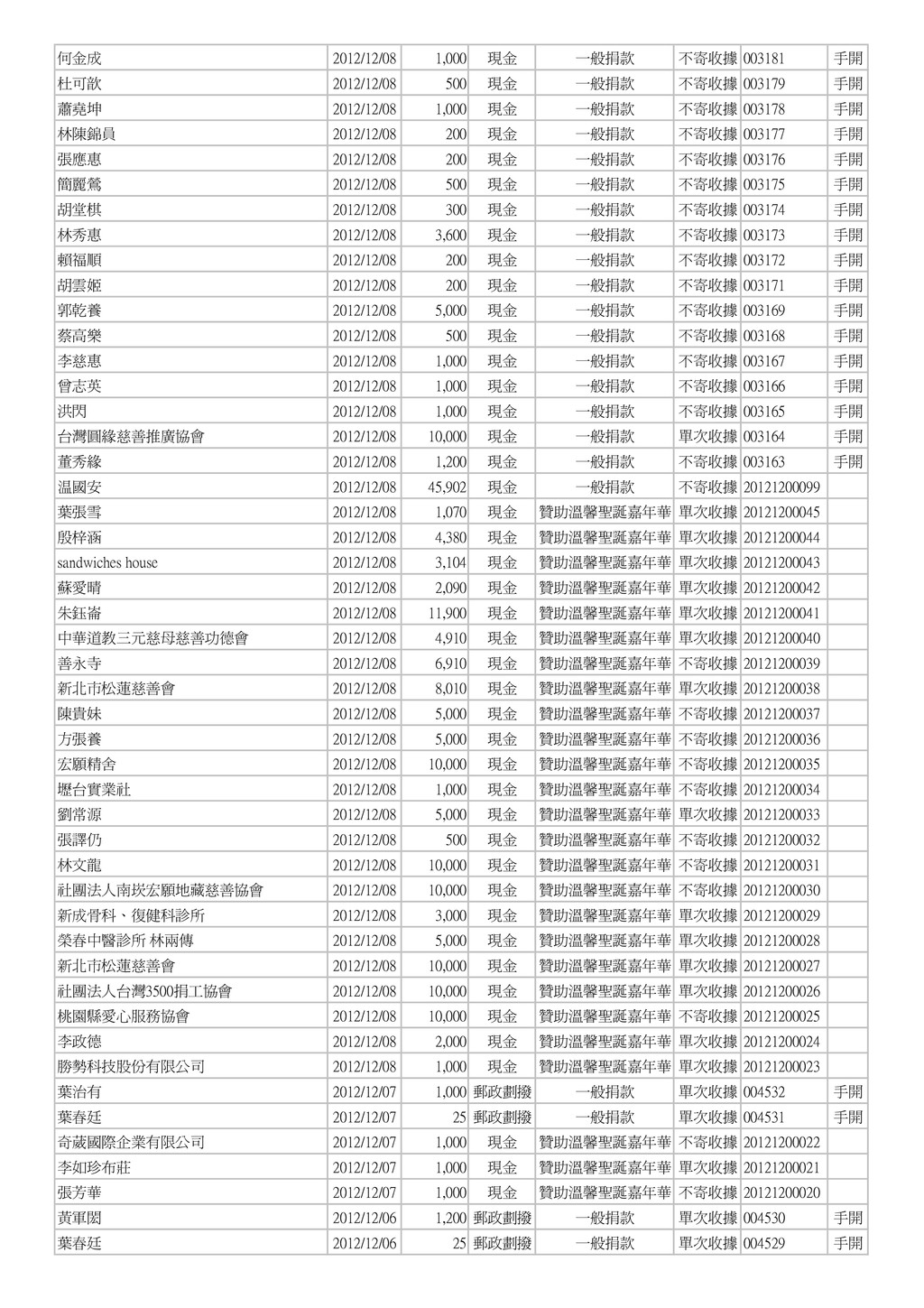 500 現金 一般捐款 不寄收據 003179 手開 蕭堯坤 2012/12/08 1,000 現金 一般捐款 不寄收據 003178 手開 林陳錦員 2012/12/08 200 現金 一般捐款 不寄收據 003177 手開 張應惠 2012/12/08 200 現金 一般捐款 不寄收據 003176 手開 簡麗鶯 2012/12/08 500 現金 一般捐款 不寄收據 003175 手開 胡堂棋 2012/12/08 300 現金 一般捐款 不寄收據 003174 手開 林秀惠 2012/12/08 3,600 現金 一般捐款 不寄收據 003173 手開 賴福順 2012/12/08 200 現金 一般捐款 不寄收據 003172 手開 胡雲姬 2012/12/08 200 現金 一般捐款 不寄收據 003171 手開 郭乾養 2012/12/08 5,000 現金 一般捐款 不寄收據 003169 手開 蔡高樂 2012/12/08 500 現金 一般捐款 不寄收據 003168 手開 李慈惠 2012/12/08 1,000 現金 一般捐款 不寄收據 003167 手開 曾志英 2012/12/08 1,000 現金 一般捐款 不寄收據 003166 手開 洪閃 2012/12/08 1,000 現金 一般捐款 不寄收據 003165 手開 台灣圓緣慈善推廣協會 2012/12/08 10,000 現金 一般捐款 單次收據 003164 手開 董秀緣 2012/12/08 1,200 現金 一般捐款 不寄收據 003163 手開 温國安 2012/12/08 45,902 現金 一般捐款 不寄收據 20121200099 葉張雪 2012/12/08 1,070 現金 贊助溫馨聖誕嘉年華 單次收據 20121200045 殷梓涵 2012/12/08 4,380 現金 贊助溫馨聖誕嘉年華 單次收據 20121200044 sandwiches house 2012/12/08 3,104 現金 贊助溫馨聖誕嘉年華 單次收據 20121200043 蘇愛晴 2012/12/08 2,090 現金 贊助溫馨聖誕嘉年華 單次收據 20121200042 朱鈺崙 2012/12/08 11,900 現金 贊助溫馨聖誕嘉年華 單次收據 20121200041 中華道教三元慈母慈善功德會 2012/12/08 4,910 現金 贊助溫馨聖誕嘉年華 單次收據 20121200040 善永寺 2012/12/08 6,910 現金 贊助溫馨聖誕嘉年華 不寄收據 20121200039 新北市松蓮慈善會 2012/12/08 8,010 現金 贊助溫馨聖誕嘉年華 單次收據 20121200038 陳貴妹 2012/12/08 5,000 現金 贊助溫馨聖誕嘉年華 不寄收據 20121200037 方張養 2012/12/08 5,000 現金 贊助溫馨聖誕嘉年華 不寄收據 20121200036 宏願精舍 2012/12/08 10,000 現金 贊助溫馨聖誕嘉年華 不寄收據 20121200035 壢台實業社 2012/12/08 1,000 現金 贊助溫馨聖誕嘉年華 不寄收據 20121200034 劉常源 2012/12/08 5,000 現金 贊助溫馨聖誕嘉年華 單次收據 20121200033 張譯仍 2012/12/08 500 現金 贊助溫馨聖誕嘉年華 不寄收據 20121200032 林文龍 2012/12/08 10,000 現金 贊助溫馨聖誕嘉年華 不寄收據 20121200031 社團法人南崁宏願地藏慈善協會 2012/12/08 10,000 現金 贊助溫馨聖誕嘉年華 不寄收據 20121200030 新成骨科、復健科診所 2012/12/08 3,000 現金 贊助溫馨聖誕嘉年華 單次收據 20121200029 榮春中醫診所 林兩傳 2012/12/08 5,000 現金 贊助溫馨聖誕嘉年華 單次收據 20121200028 新北市松蓮慈善會 2012/12/08 10,000 現金 贊助溫馨聖誕嘉年華 單次收據 20121200027 社團法人台灣3500捐工協會 2012/12/08 10,000 現金 贊助溫馨聖誕嘉年華 單次收據 20121200026 桃園縣愛心服務協會 2012/12/08 10,000 現金 贊助溫馨聖誕嘉年華 不寄收據 20121200025 李政德 2012/12/08 2,000 現金 贊助溫馨聖誕嘉年華 單次收據 20121200024 勝勢科技股份有限公司 2012/12/08 1,000 現金 贊助溫馨聖誕嘉年華 單次收據 20121200023 葉治有 2012/12/07 1,000 郵政劃撥 一般捐款 單次收據 004532 手開 葉春廷 2012/12/07 25 郵政劃撥 一般捐款 單次收據 004531 手開 奇葳國際企業有限公司 2012/12/07 1,000 現金 贊助溫馨聖誕嘉年華 不寄收據 20121200022 李如珍布莊 2012/12/07 1,000 現金 贊助溫馨聖誕嘉年華 單次收據 20121200021 張芳華 2012/12/07 1,000 現金 贊助溫馨聖誕嘉年華 不寄收據 20121200020 黃軍閎 2012/12/06 1,200 郵政劃撥 一般捐款 單次收據 004530 手開 葉春廷 2012/12/06 25 郵政劃撥 一般捐款 單次收據 004529 手開