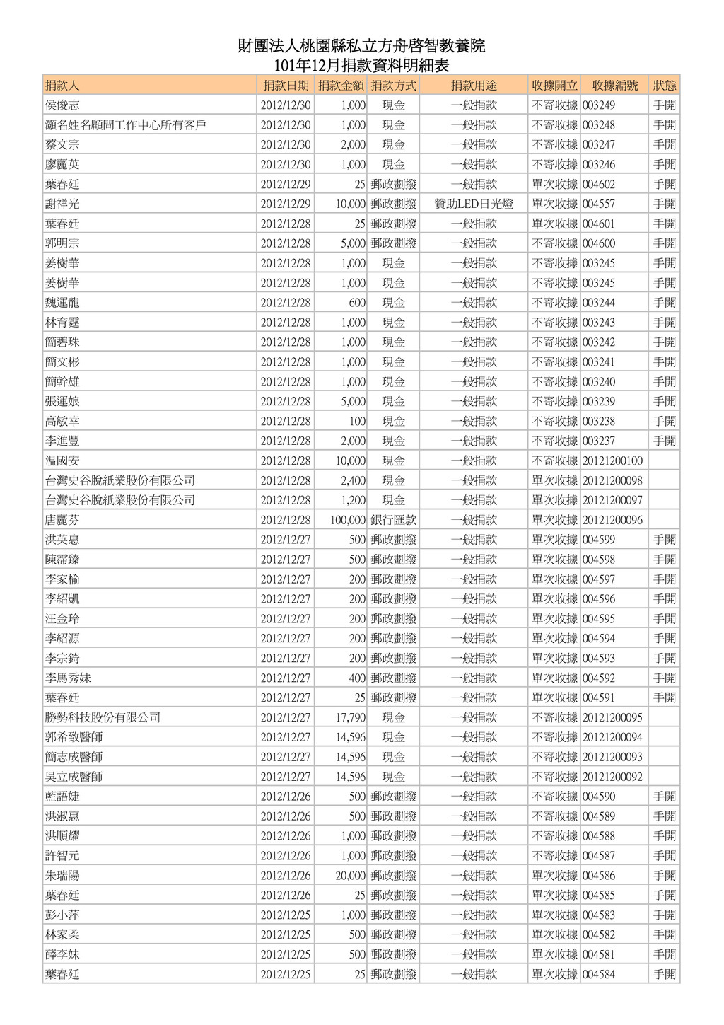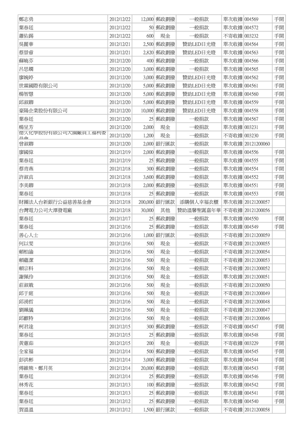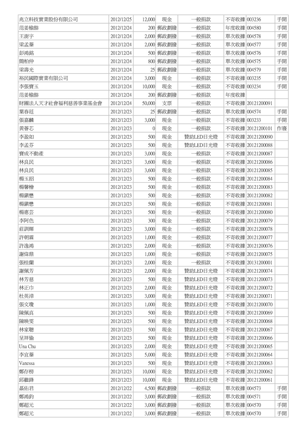 500 現金 一般捐款 不寄收據 003179 手開 蕭堯坤 2012/12/08 1,000 現金 一般捐款 不寄收據 003178 手開 林陳錦員 2012/12/08 200 現金 一般捐款 不寄收據 003177 手開 張應惠 2012/12/08 200 現金 一般捐款 不寄收據 003176 手開 簡麗鶯 2012/12/08 500 現金 一般捐款 不寄收據 003175 手開 胡堂棋 2012/12/08 300 現金 一般捐款 不寄收據 003174 手開 林秀惠 2012/12/08 3,600 現金 一般捐款 不寄收據 003173 手開 賴福順 2012/12/08 200 現金 一般捐款 不寄收據 003172 手開 胡雲姬 2012/12/08 200 現金 一般捐款 不寄收據 003171 手開 郭乾養 2012/12/08 5,000 現金 一般捐款 不寄收據 003169 手開 蔡高樂 2012/12/08 500 現金 一般捐款 不寄收據 003168 手開 李慈惠 2012/12/08 1,000 現金 一般捐款 不寄收據 003167 手開 曾志英 2012/12/08 1,000 現金 一般捐款 不寄收據 003166 手開 洪閃 2012/12/08 1,000 現金 一般捐款 不寄收據 003165 手開 台灣圓緣慈善推廣協會 2012/12/08 10,000 現金 一般捐款 單次收據 003164 手開 董秀緣 2012/12/08 1,200 現金 一般捐款 不寄收據 003163 手開 温國安 2012/12/08 45,902 現金 一般捐款 不寄收據 20121200099 葉張雪 2012/12/08 1,070 現金 贊助溫馨聖誕嘉年華 單次收據 20121200045 殷梓涵 2012/12/08 4,380 現金 贊助溫馨聖誕嘉年華 單次收據 20121200044 sandwiches house 2012/12/08 3,104 現金 贊助溫馨聖誕嘉年華 單次收據 20121200043 蘇愛晴 2012/12/08 2,090 現金 贊助溫馨聖誕嘉年華 單次收據 20121200042 朱鈺崙 2012/12/08 11,900 現金 贊助溫馨聖誕嘉年華 單次收據 20121200041 中華道教三元慈母慈善功德會 2012/12/08 4,910 現金 贊助溫馨聖誕嘉年華 單次收據 20121200040 善永寺 2012/12/08 6,910 現金 贊助溫馨聖誕嘉年華 不寄收據 20121200039 新北市松蓮慈善會 2012/12/08 8,010 現金 贊助溫馨聖誕嘉年華 單次收據 20121200038 陳貴妹 2012/12/08 5,000 現金 贊助溫馨聖誕嘉年華 不寄收據 20121200037 方張養 2012/12/08 5,000 現金 贊助溫馨聖誕嘉年華 不寄收據 20121200036 宏願精舍 2012/12/08 10,000 現金 贊助溫馨聖誕嘉年華 不寄收據 20121200035 壢台實業社 2012/12/08 1,000 現金 贊助溫馨聖誕嘉年華 不寄收據 20121200034 劉常源 2012/12/08 5,000 現金 贊助溫馨聖誕嘉年華 單次收據 20121200033 張譯仍 2012/12/08 500 現金 贊助溫馨聖誕嘉年華 不寄收據 20121200032 林文龍 2012/12/08 10,000 現金 贊助溫馨聖誕嘉年華 不寄收據 20121200031 社團法人南崁宏願地藏慈善協會 2012/12/08 10,000 現金 贊助溫馨聖誕嘉年華 不寄收據 20121200030 新成骨科、復健科診所 2012/12/08 3,000 現金 贊助溫馨聖誕嘉年華 單次收據 20121200029 榮春中醫診所 林兩傳 2012/12/08 5,000 現金 贊助溫馨聖誕嘉年華 單次收據 20121200028 新北市松蓮慈善會 2012/12/08 10,000 現金 贊助溫馨聖誕嘉年華 單次收據 20121200027 社團法人台灣3500捐工協會 2012/12/08 10,000 現金 贊助溫馨聖誕嘉年華 單次收據 20121200026 桃園縣愛心服務協會 2012/12/08 10,000 現金 贊助溫馨聖誕嘉年華 不寄收據 20121200025 李政德 2012/12/08 2,000 現金 贊助溫馨聖誕嘉年華 單次收據 20121200024 勝勢科技股份有限公司 2012/12/08 1,000 現金 贊助溫馨聖誕嘉年華 單次收據 20121200023 葉治有 2012/12/07 1,000 郵政劃撥 一般捐款 單次收據 004532 手開 葉春廷 2012/12/07 25 郵政劃撥 一般捐款 單次收據 004531 手開 奇葳國際企業有限公司 2012/12/07 1,000 現金 贊助溫馨聖誕嘉年華 不寄收據 20121200022 李如珍布莊 2012/12/07 1,000 現金 贊助溫馨聖誕嘉年華 單次收據 20121200021 張芳華 2012/12/07 1,000 現金 贊助溫馨聖誕嘉年華 不寄收據 20121200020 黃軍閎 2012/12/06 1,200 郵政劃撥 一般捐款 單次收據 004530 手開 葉春廷 2012/12/06 25 郵政劃撥 一般捐款 單次收據 004529 手開