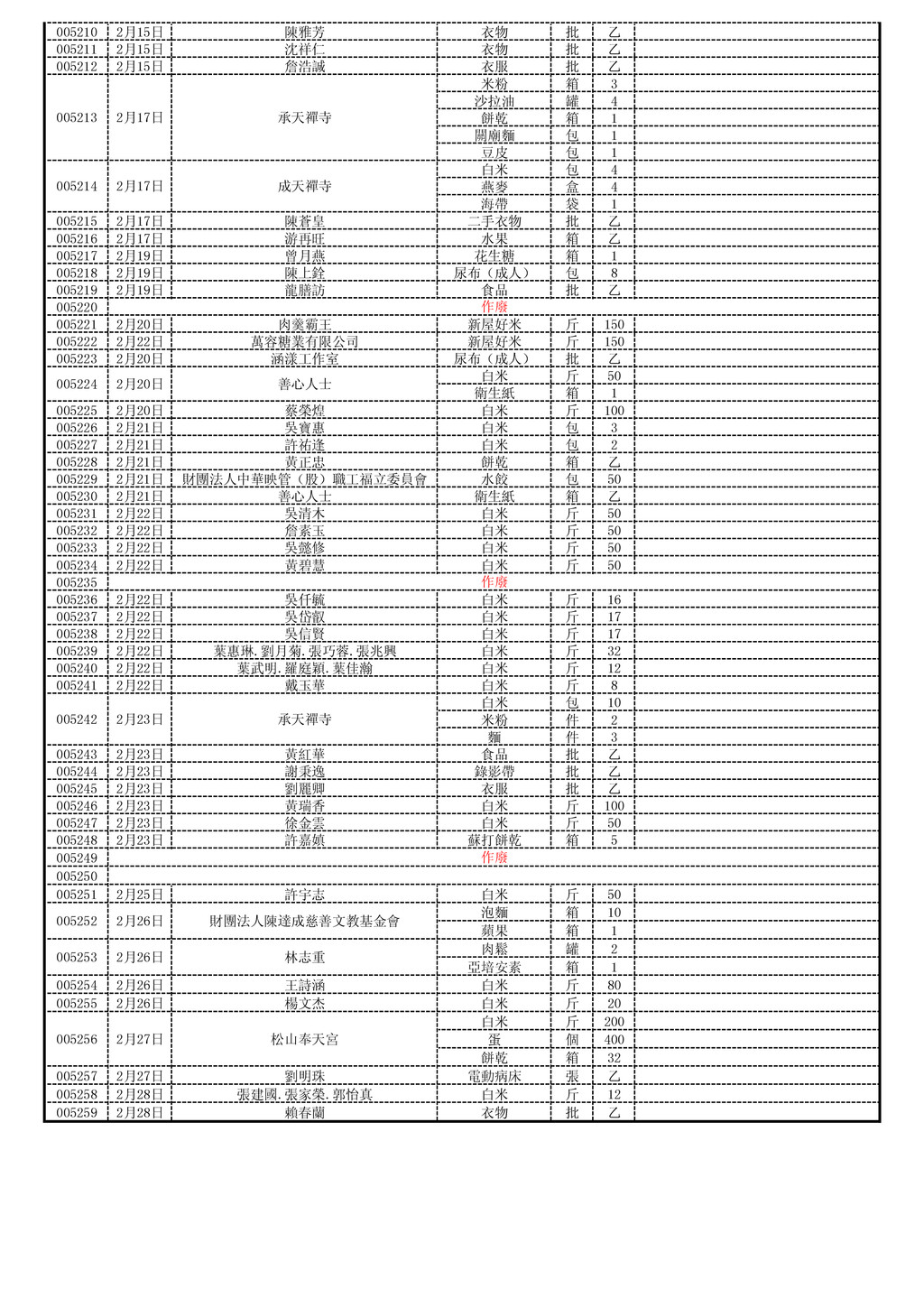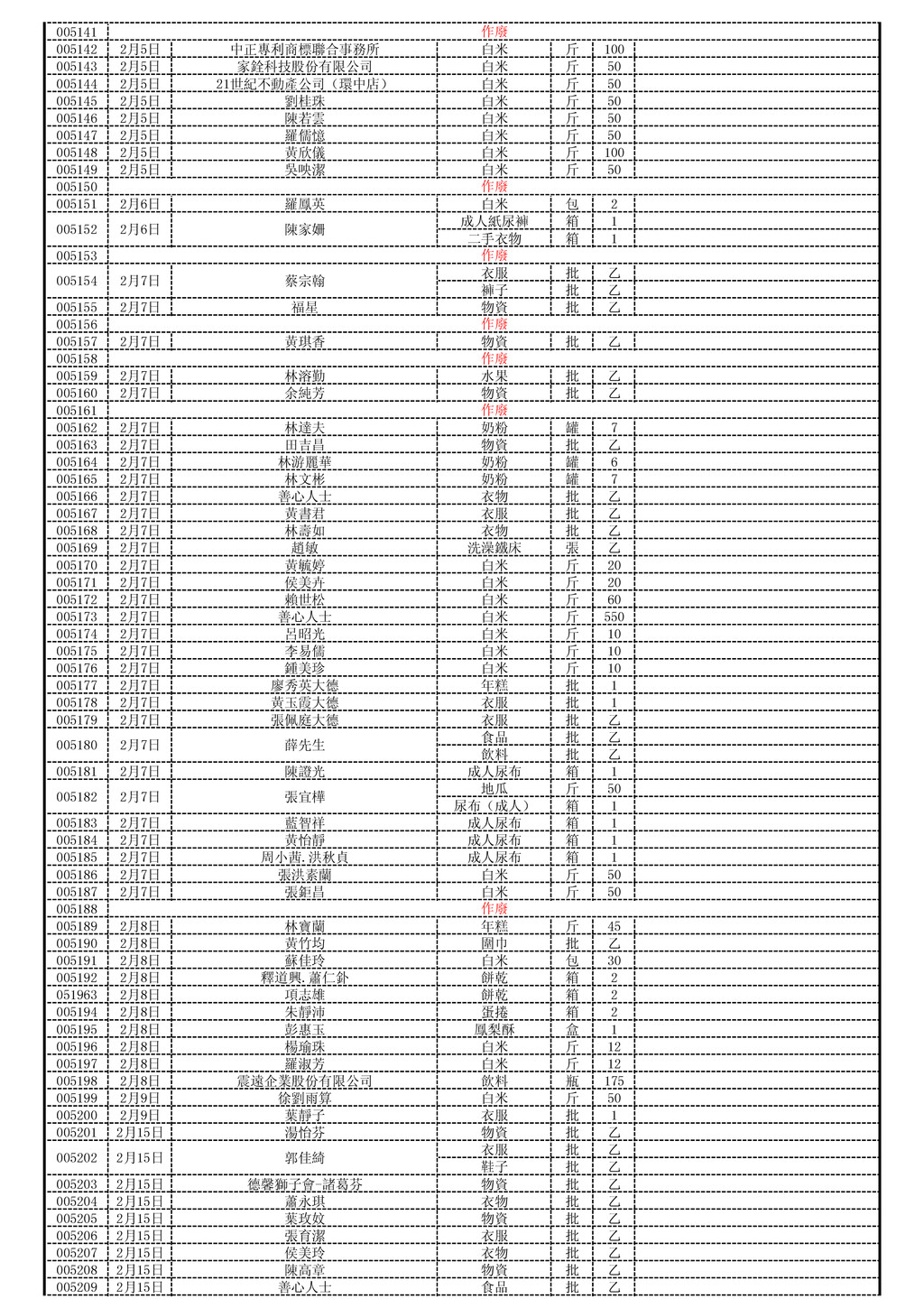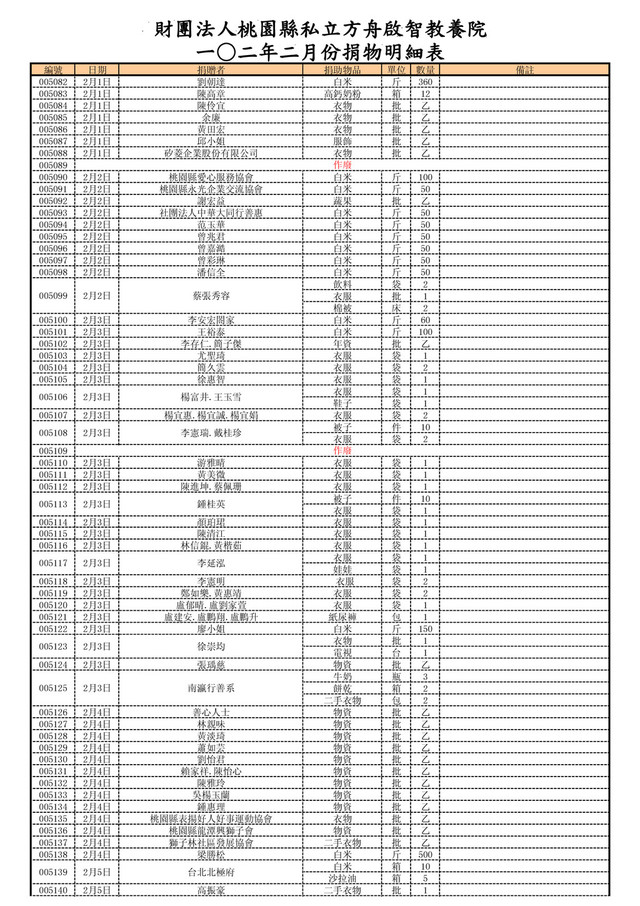 白米 斤 360 005083 2月1日 陳高章 高鈣奶粉 箱 12 005084 2月1日 陳伶宜 衣物 批 乙 005085 2月1日 余廉 衣物 批 乙 005086 2月1日 黃田宏 衣物 批 乙 005087 2月1日 邱小姐 服飾 批 乙 005088 2月1日 矽菱企業股份有限公司 衣物 批 乙 005089 005090 2月2日 桃園縣愛心服務協會 白米 斤 100 005091 2月2日 桃園縣永光企業交流協會 白米 斤 50 005092 2月2日 謝宏益 蔬果 批 乙 005093 2月2日 社團法人中華大同行善惠 白米 斤 50 005094 2月2日 范玉華 白米 斤 50 005095 2月2日 曾兆君 白米 斤 50 005096 2月2日 曾嘉澔 白米 斤 50 005097 2月2日 曾彩琳 白米 斤 50 005098 2月2日 潘信全 白米 斤 50 飲料 袋 2 衣服 批 1 棉被 床 2 005100 2月3日 李安宏閤家 白米 斤 60 005101 2月3日 王裕泰 白米 斤 100 005102 2月3日 李存仁.簡子傑 年資 批 乙 005103 2月3日 尤聖琦 衣服 袋 1 005104 2月3日 簡久雲 衣服 袋 2 005105 2月3日 徐惠智 衣服 袋 1 衣服 袋 1 鞋子 袋 1 005107 2月3日 楊宜惠.楊宜誠.楊宜娟 衣服 袋 2 被子 件 10 衣服 袋 2 005109 005110 2月3日 游雅晴 衣服 袋 1 005111 2月3日 黃美微 衣服 袋 1 005112 2月3日 陳進坤.蔡佩珊 衣服 袋 1 被子 件 10 衣服 袋 1 005114 2月3日 顏珀珺 衣服 袋 1 005115 2月3日 陳清江 衣服 袋 1 005116 2月3日 林信錕.黃楷茹 衣服 袋 1 衣服 袋 1 娃娃 袋 1 005118 2月3日 李憲明 衣服 袋 2 005119 2月3日 鄭如樂.黃惠靖 衣服 袋 2 005120 2月3日 盧郁晴.盧劉家萱 衣服 袋 1 005121 2月3日 盧建安.盧鵬翔.盧鵬升 紙尿褲 包 1 005122 2月3日 廖小姐 白米 斤 150 衣物 批 1 電視 台 1 005124 2月3日 張瑀慈 物資 批 乙 牛奶 瓶 3 餅乾 箱 2 二手衣物 包 2 005126 2月4日 善心人士 物資 批 乙 005127 2月4日 林親味 物資 批 乙 005128 2月4日 黃淡琦 物資 批 乙 005129 2月4日 蕭如芸 物資 批 乙 005130 2月4日 劉怡君 物資 批 乙 005131 2月4日 賴家祥.陳怡心 物資 批 乙 005132 2月4日 陳雅玲 物資 批 乙 005133 2月4日 吳楊玉蘭 物資 批 乙 005134 2月4日 鍾惠理 物資 批 乙 005135 2月4日 桃園縣表揚好人好事運動協會 衣物 批 乙 005136 2月4日 桃園縣龍潭興獅子會 物資 批 乙 005137 2月4日 獅子林社區發展協會 二手衣物 批 乙 005138 2月4日 梁勝松 白米 斤 500 白米 箱 10 沙拉油 箱 5 005140 2月5日 高振豪 二手衣物 批 1 作廢 蔡張秀容 2月2日 005099 作廢 鍾桂英 財團法人桃園縣私立方舟啟智教養院 ㄧ◦二年二月份捐物明細表 楊富井.王玉雪 2月3日 005106 李憲瑞.戴桂珍 2月3日 005108 005113 2月3日 李延泓 2月3日 005117 徐崇均 2月3日 005123 南瀛行善系 2月3日 005125 台北北極府 2月5日 005139