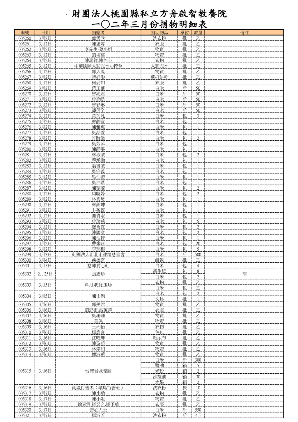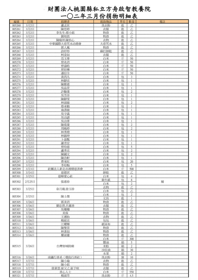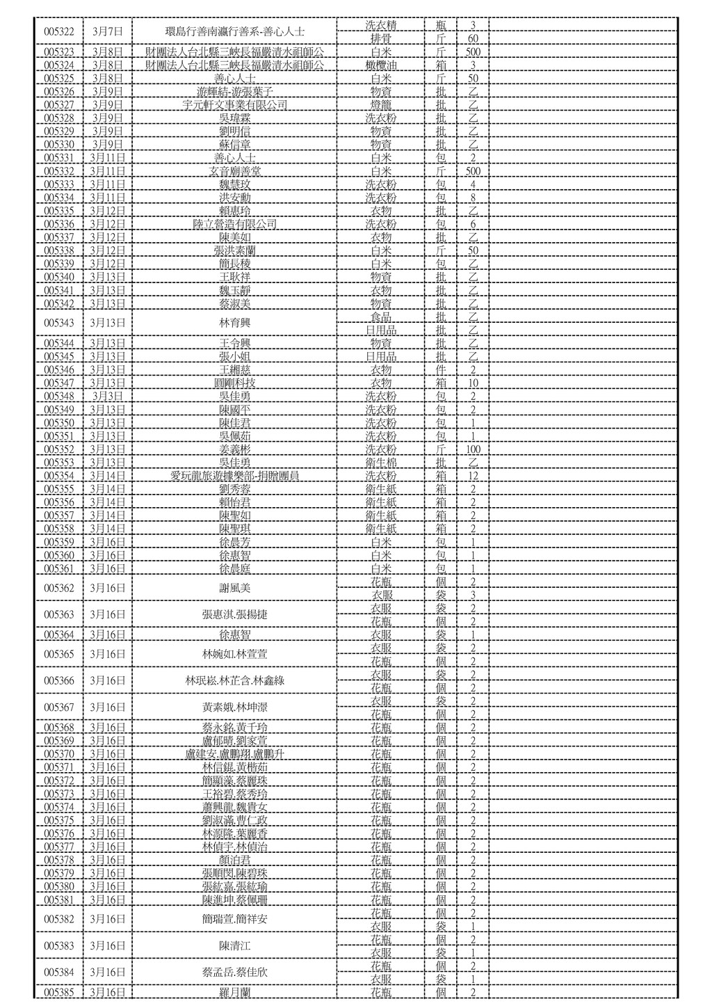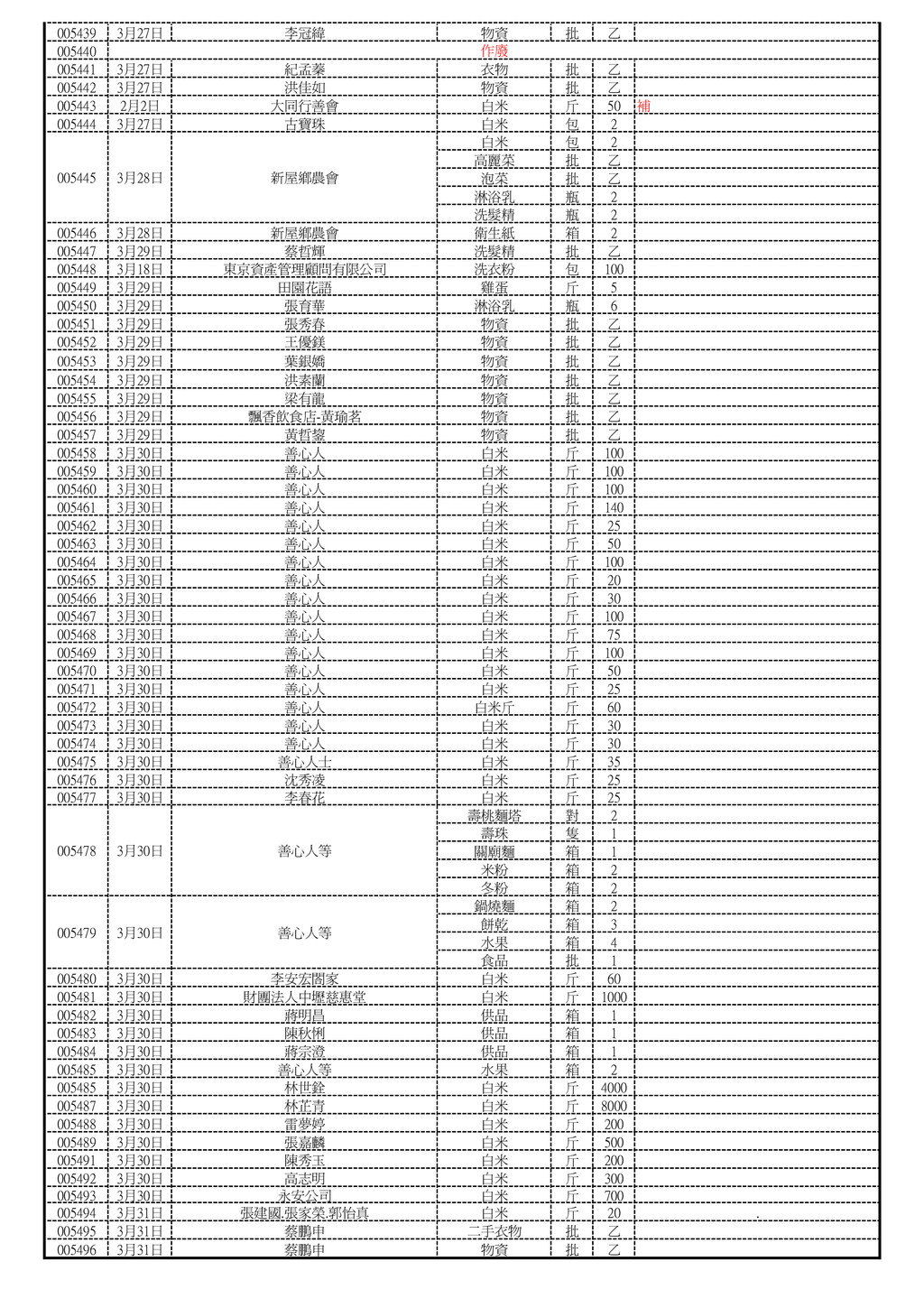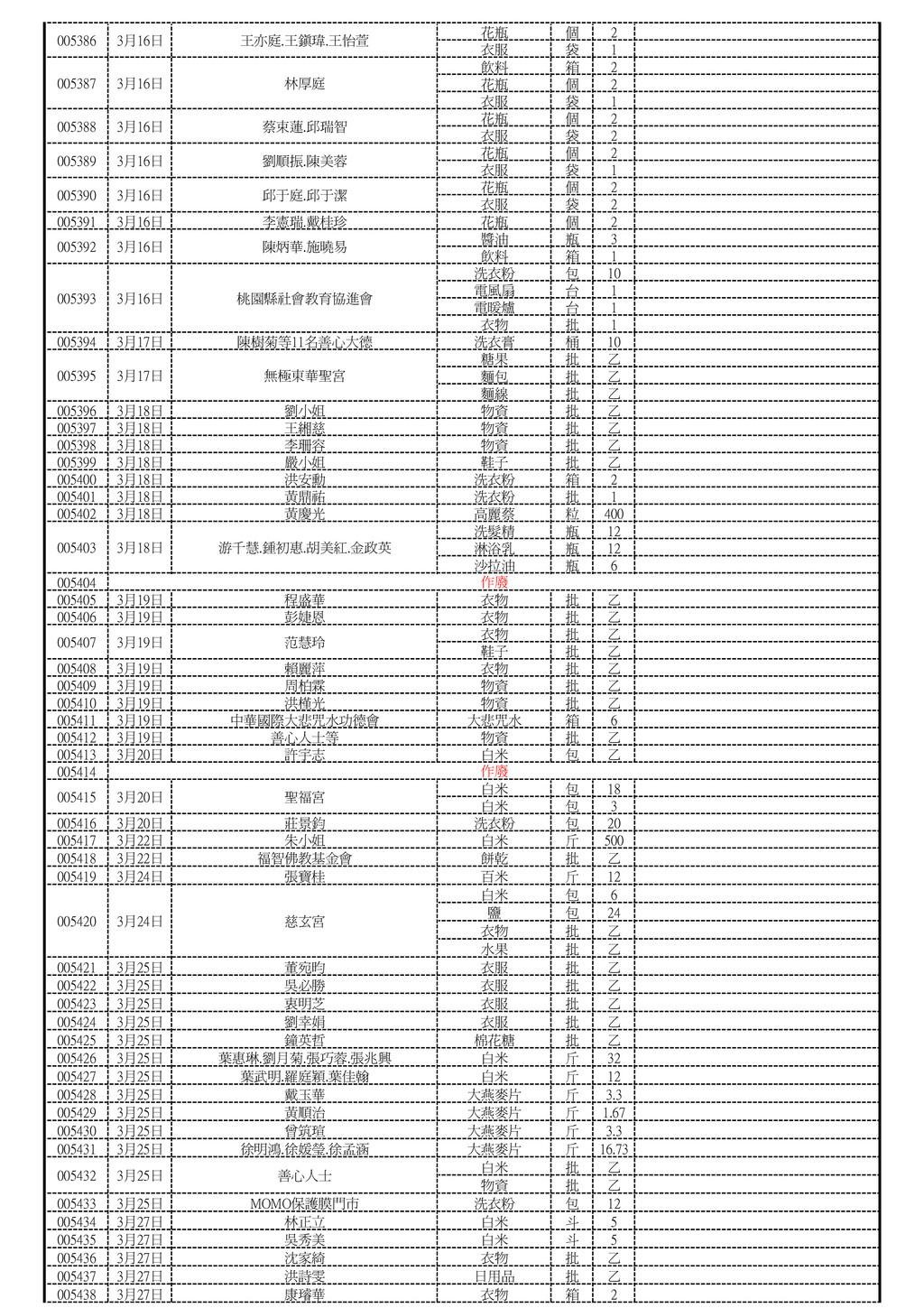 個 2 衣服 袋 1 花瓶 個 2 衣服 袋 2 花瓶 個 2 衣服 袋 1 花瓶 個 2 衣服 袋 2 005391 3月16日 李憲瑞.戴桂珍 花瓶 個 2 醬油 瓶 3 飲料 箱 1 洗衣粉 包 10 電風扇 台 1 電暖爐 台 1 衣物 批 1 005394 3月17日 陳樹菊等11名善心大德 洗衣膏 桶 10 糖果 批 乙 麵包 批 乙 麵線 批 乙 005396 3月18日 劉小姐 物資 批 乙 005397 3月18日 王緗慈 物資 批 乙 005398 3月18日 李珊容 物資 批 乙 005399 3月18日 嚴小姐 鞋子 批 乙 005400 3月18日 洪安勳 洗衣粉 箱 2 005401 3月18日 黃鼎祐 洗衣粉 批 1 005402 3月18日 黃慶光 高麗蔡 粒 400 洗髮精 瓶 12 淋浴乳 瓶 12 沙拉油 瓶 6 005404 005405 3月19日 程盛華 衣物 批 乙 005406 3月19日 彭婕恩 衣物 批 乙 衣物 批 乙 鞋子 批 乙 005408 3月19日 賴麗萍 衣物 批 乙 005409 3月19日 周柏霖 物資 批 乙 005410 3月19日 洪槿光 物資 批 乙 005411 3月19日 中華國際大悲咒水功德會 大悲咒水 箱 6 005412 3月19日 善心人士等 物資 批 乙 005413 3月20日 許宇志 白米 包 乙 005414 白米 包 18 白米 包 3 005416 3月20日 莊景鈞 洗衣粉 包 20 005417 3月22日 朱小姐 白米 斤 500 005418 3月22日 福智佛教基金會 餅乾 批 乙 005419 3月24日 張寶桂 百米 斤 12 白米 包 6 鹽 包 24 衣物 批 乙 水果 批 乙 005421 3月25日 董宛昀 衣服 批 乙 005422 3月25日 吳必勝 衣服 批 乙 005423 3月25日 衷明芝 衣服 批 乙 005424 3月25日 劉幸娟 衣服 批 乙 005425 3月25日 鐘英哲 棉花糖 批 乙 005426 3月25日 葉惠琳.劉月菊.張巧蓉.張兆興 白米 斤 32 005427 3月25日 葉武明.羅庭穎.葉佳翰 白米 斤 12 005428 3月25日 戴玉華 大燕麥片 斤 3.3 005429 3月25日 黃順治 大燕麥片 斤 1.67 005430 3月25日 曾筑瑄 大燕麥片 斤 3.3 005431 3月25日 徐明鴻.徐媛瑩.徐孟涵 大燕麥片 斤 16.73 白米 批 乙 物資 批 乙 005433 3月25日 MOMO保護膜門市 洗衣粉 包 12 005434 3月27日 林正立 白米 斗 5 005435 3月27日 吳秀美 白米 斗 5 005436 3月27日 沈家綺 衣物 批 乙 005437 3月27日 洪詩雯 日用品 批 乙 005438 3月27日 康璿華 衣物 箱 2 作廢 范慧玲 3月19日 005407 王亦庭.王鎮瑋.王怡萱 3月16日 005386 林厚庭 3月16日 005387 蔡束蓮.邱瑞智 3月16日 005388 劉順振.陳美蓉 3月16日 005389 邱于庭.邱于潔 3月16日 005390 陳炳華.施曉易 3月16日 005392 桃園縣社會教育協進會 3月16日 005393 無極東華聖宮 3月17日 005395 游千慧.鍾初惠.胡美紅.金政英 3月18日 005403 作廢 聖福宮 3月20日 005415 慈玄宮 3月24日 005420 善心人士 3月25日 005432