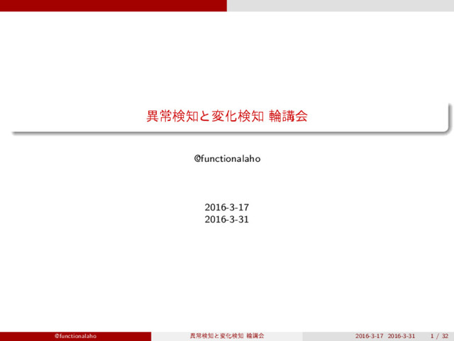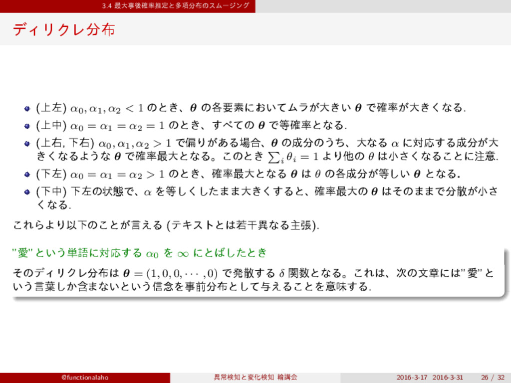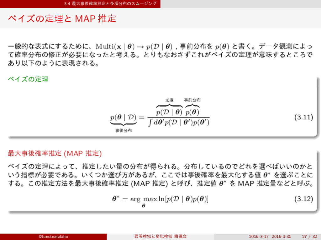 ܇࿅σʔλʹͳ͍୯ޠͷ͕֬θϩͱͳΓܭࢉͰ͖ͳ͍ ରॲ๏ εϜʔδϯά (smoothing) ͱ͍͏ԼବΛཤ͔ͤΔख๏Λ͏ɻ ͨͱ͑ɺN(y) i → N(y) i + γ(γ > 0) (ςΩετޡ২?) ͱஔ͖͑ͯɺ ˆ θy i = Ny i + γ |Dy| + Mγ (3.8) ͨͩ͠, ∑ n x(n) i = Ny i , ∑ i N(y) i = |Dy|. શ୯ޠͰੵ͢ΔͱͪΌΜͱ 1 ʹͳ͍ͬͯΔ. M ∑ i=1 θy i = ∑ i Ny i + Mγ |Dy| + Mγ = |Dy| + Mγ |Dy| + Mγ @functionalaho ҟৗݕͱมԽݕ ྠߨձ 2016-3-17 2016-3-31 21 / 32