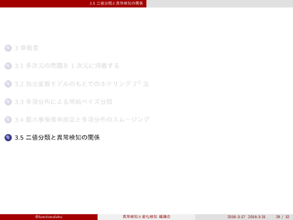 i , y) ͷΑ͏ʹະύϥϝʔλ θy i Ͱ͔͚͍ͯΔͱ͢Δɻθy i ޙड़ͷଟ߲ ͷྫͰ͋Εɺ໎ϝʔϧྨͷ i ൪ͷޠͷग़ݱ֬ʹ૬͢Δɻ ର log ͷதͷੵ͕ͦΕͧΕͷͰॻ͚ͯɺ͞Βʹ n ʹ͍ͭͯ·ͱΊ͋͛ΔͱҎԼʹͳΔɻ L(Θ | D) = N ∑ n=1 M ∑ i=1 ln p(x(n) i | θy(n) i , y(n)) = M ∑ i=1 { ∑ n∈D1 ln p(x(n) i | θ1 i , y = 1) + ∑ n∈D0 ln p(x(n) i | θ0 i , y = 0) } (3.2) ͨͩ͠ɺD0 y(n) = 0 ͱͳΔඪຊͷू߹,D1 y(n) = 1 ͱͳΔඪຊͷू߹. ͜ΕΑΓ θ1 i ͷ࠷ղΛ༩͑Δ݅ҎԼɻ 0 = ∂L ∂θ1 i = ∂ ∂θ1 i ∑ n∈D1 ln p(x(n) i | θ1 i , y = 1) ղऍ ࠷ӈลʹɺมͷఴࣈ i ͱ y = 1 ʹରԠ͢Δ߲͔͠Βͳ͍ɻ ͜Εɺ3.1 ͕Γཱͭͱ͖ʹɺม i ͝ͱ,y ͝ͱʹΓ͚ΒΕͨͱ͍͏͜ͱΛҙຯ͢Δɻ @functionalaho ҟৗݕͱมԽݕ ྠߨձ 2016-3-17 2016-3-31 8 / 32