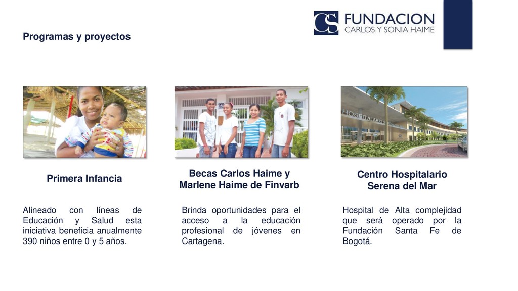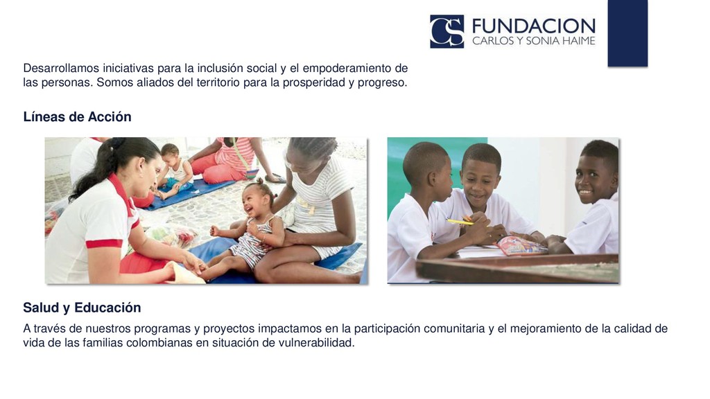 las personas. Somos aliados del territorio para la prosperidad y progreso. Líneas de Acción A través de nuestros programas y proyectos impactamos en la participación comunitaria y el mejoramiento de la calidad de vida de las familias colombianas en situación de vulnerabilidad. Salud y Educación Sonia-Haime, Sonia-Gutt-de-Haime, Sonia-Gutt