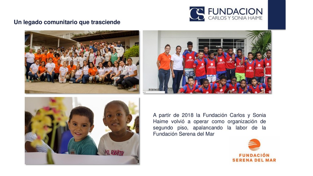 Fundación Carlos y Sonia Haime volvió a operar como organización de segundo piso, apalancando la labor de la Fundación Serena del Mar Sonia-Haime, Sonia-Gutt-de-Haime, Sonia-Gutt