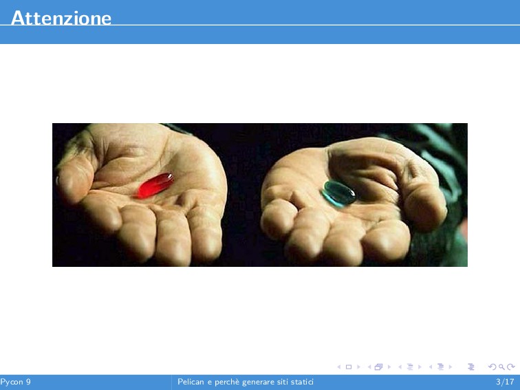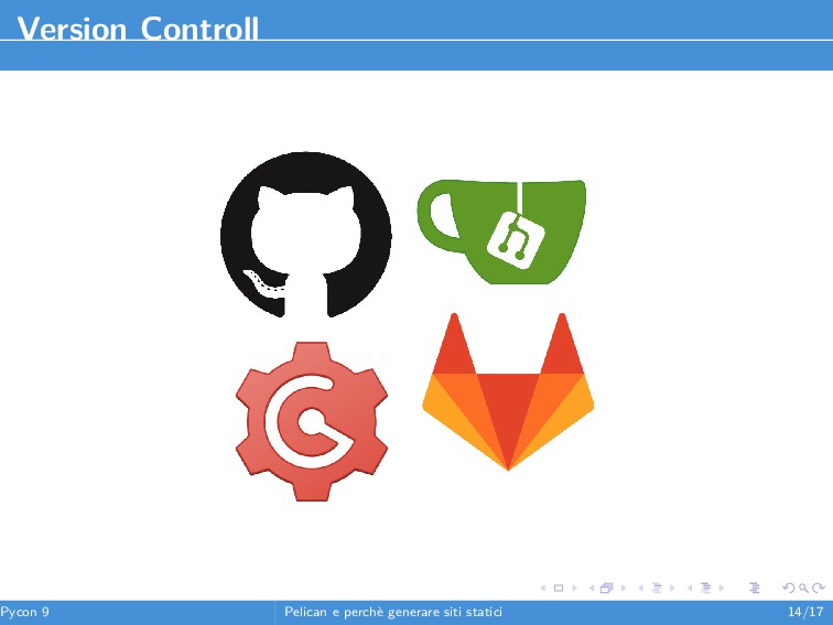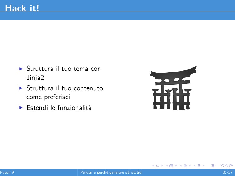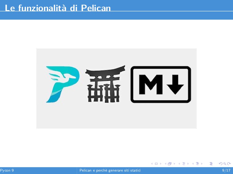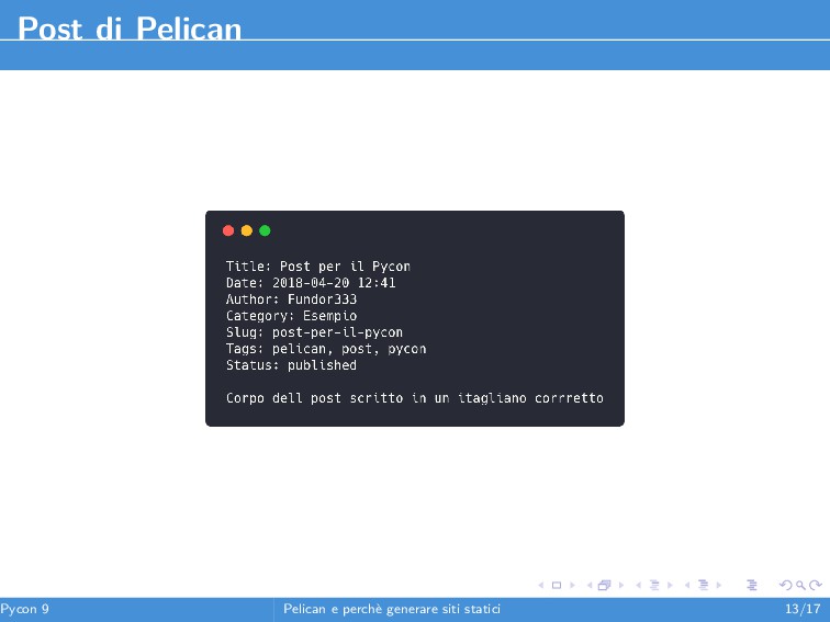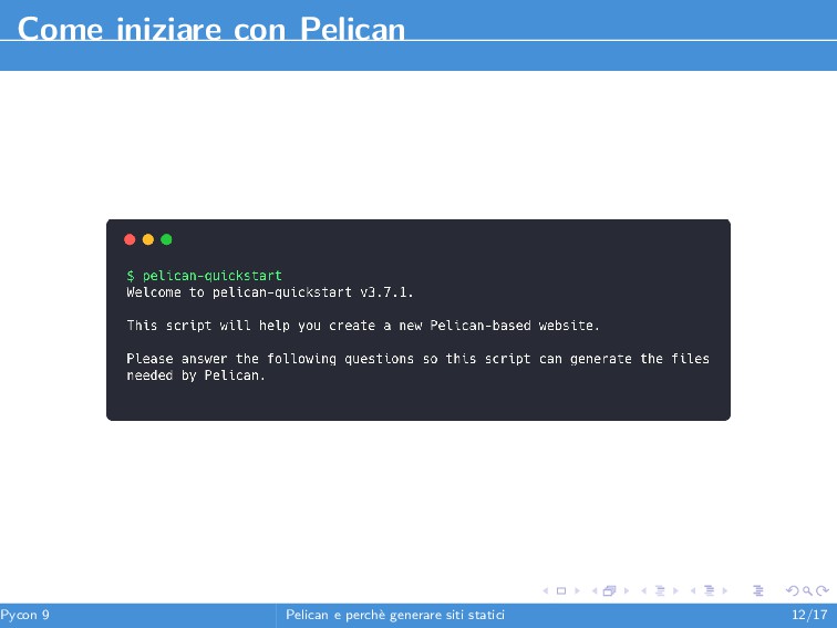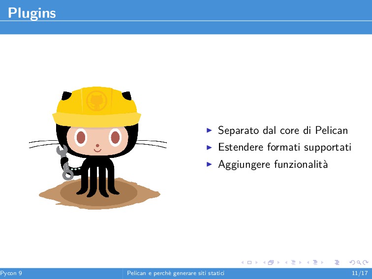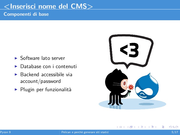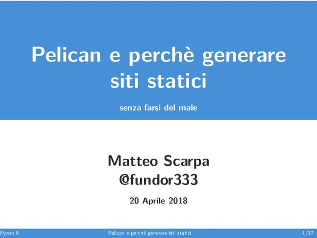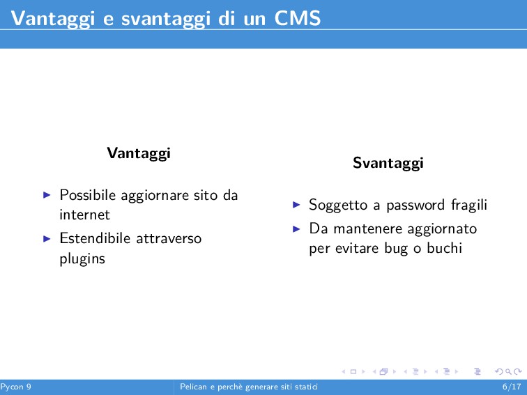 da internet Estendibile attraverso plugins Svantaggi Soggetto a password fragili Da mantenere aggiornato per evitare bug o buchi Pycon 9 Pelican e perchè generare siti statici 6/17