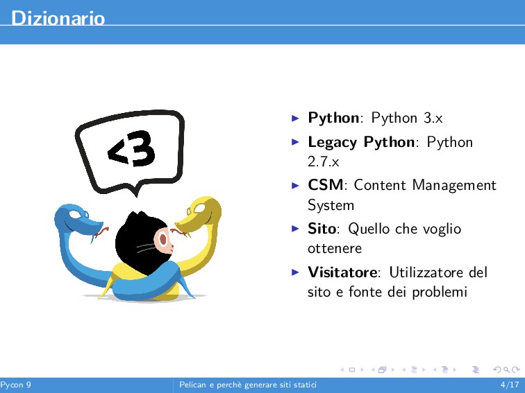 Management System Sito: Quello che voglio ottenere Visitatore: Utilizzatore del sito e fonte dei problemi Pycon 9 Pelican e perchè generare siti statici 4/17