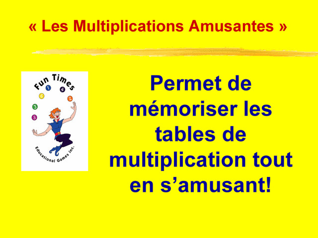 dix enfants, le fait que chaque enfant puisse travailler individuellement sans requérir une surveillance immédiate représente un avantage certain pour les parents, enseignants et tuteurs. En classe, les enfants peuvent apprendre à leur rythme – ceux qui désirent avancer plus rapidement peuvent continuer et ceux qui ont besoin de pratiquer plus peuvent le faire sans pressions extérieures qui les feraient se sentir « lents ». Le jeu « Les Multiplications Amusantes » est plutôt versatile et peut être utilisé par un ou plusieurs étudiants à la fois. Lorsque plusieurs joueurs sont disponibles, ceux-ci peuvent relever des défis et voir qui peut répondre à toutes les questions sans faire d’erreur et dans un minimum de temps. Il peut se jouer à deux : lorsqu’un des joueurs commet une erreur, l’autre prend la relève. L’important est qu’ils apprennent tout en s’amusant… et c’ est exactement ce que le jeu permet d’accomplir.