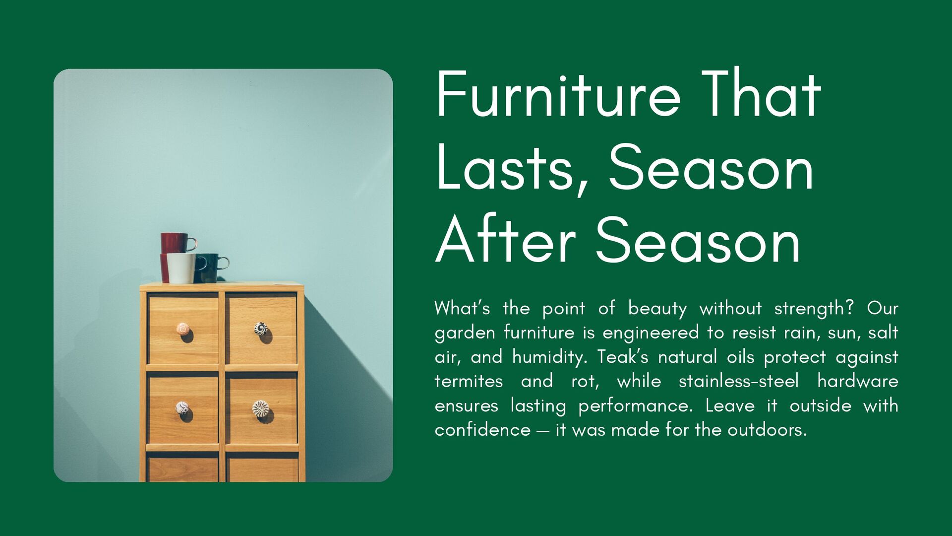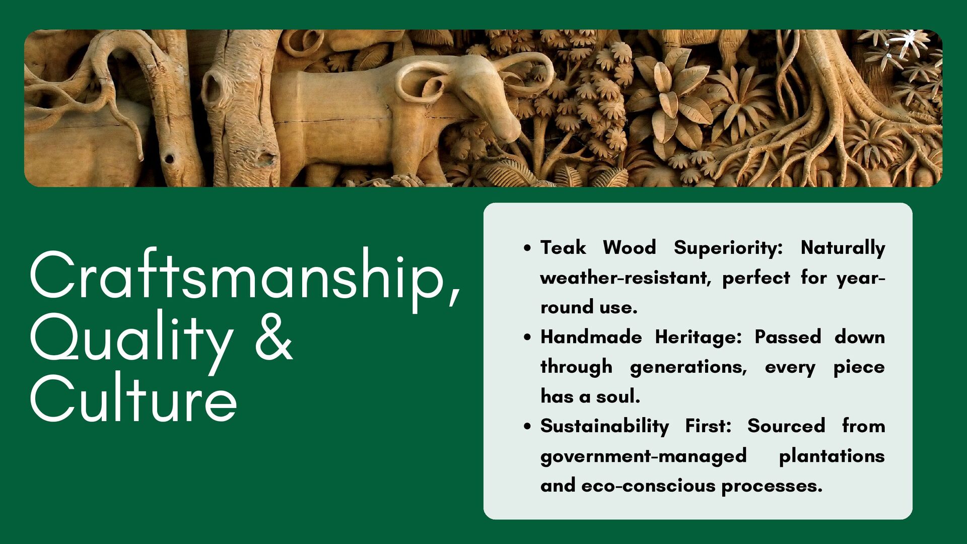 From stunning teak wood lounges to artisan-crafted dining sets, every piece is made with heart in Indonesia’s rich woodworking heritage. Whether you’re furnishing a garden, villa, resort, or terrace, our outdoor collections are designed to withstand the elements and impress for decades.