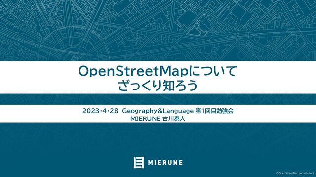 ©OpenStreetMap contributors OpenStreetMapについて ざっく 知 う 2023・4・28 Geography&Language 第1回目勉強会 MIERUNE 古川泰人