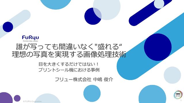 1 © FURYU Corporation. 目を大きくするだけではない! プリントシール機における事例 誰が写っても間違いなく"盛れる“ 理想の写真を実現する画像処理技術 フリュー株式会社 中嶋