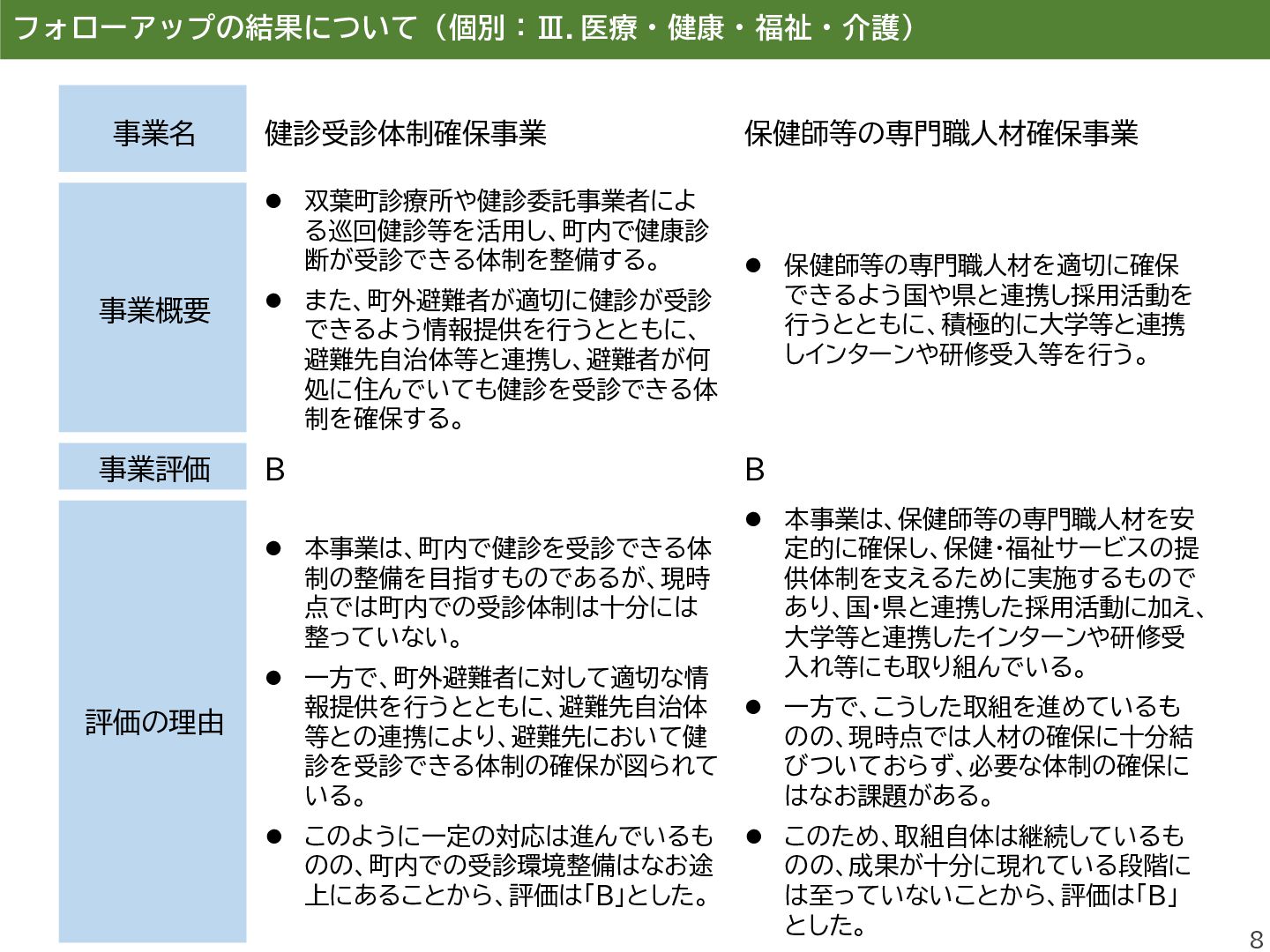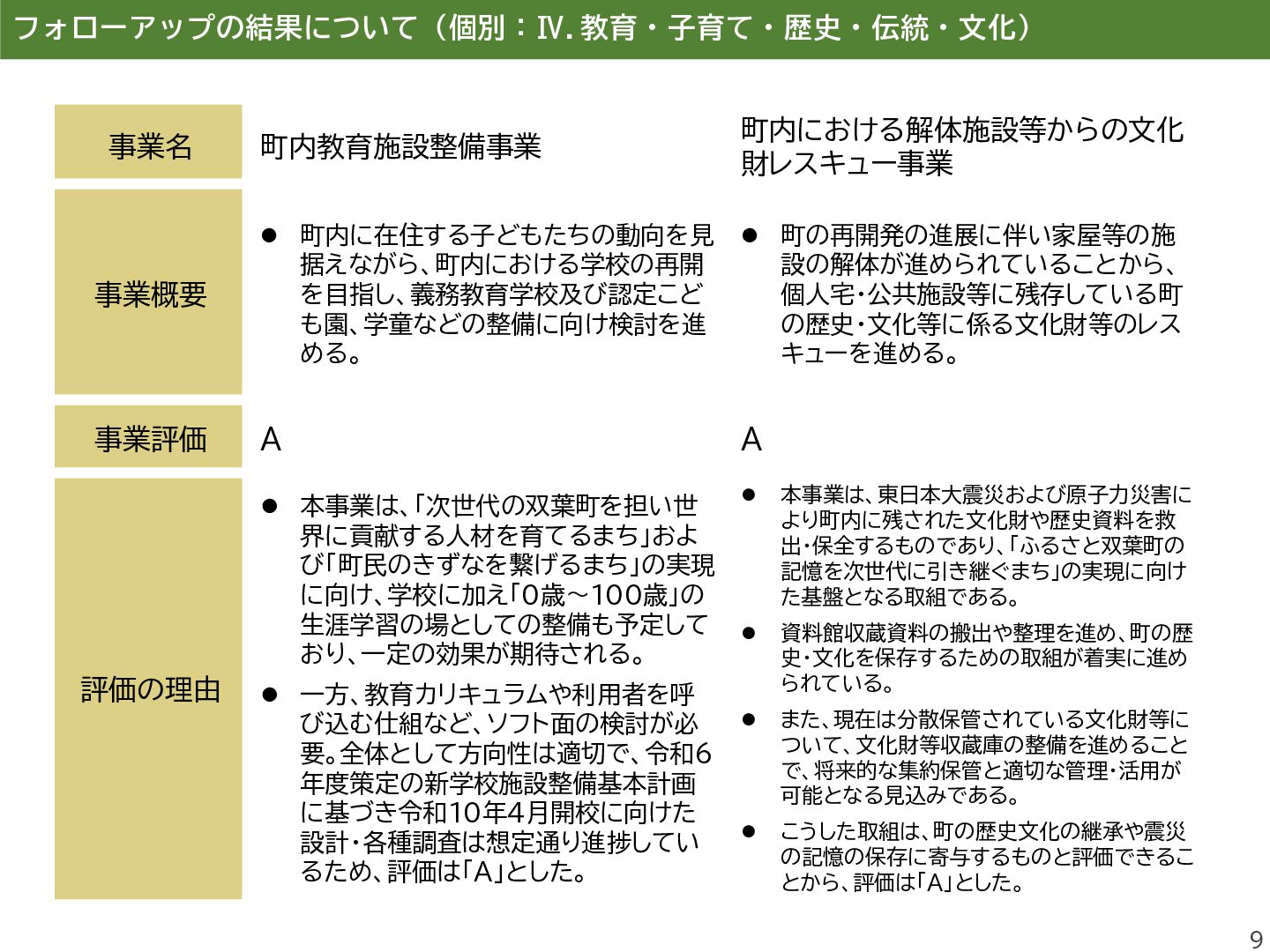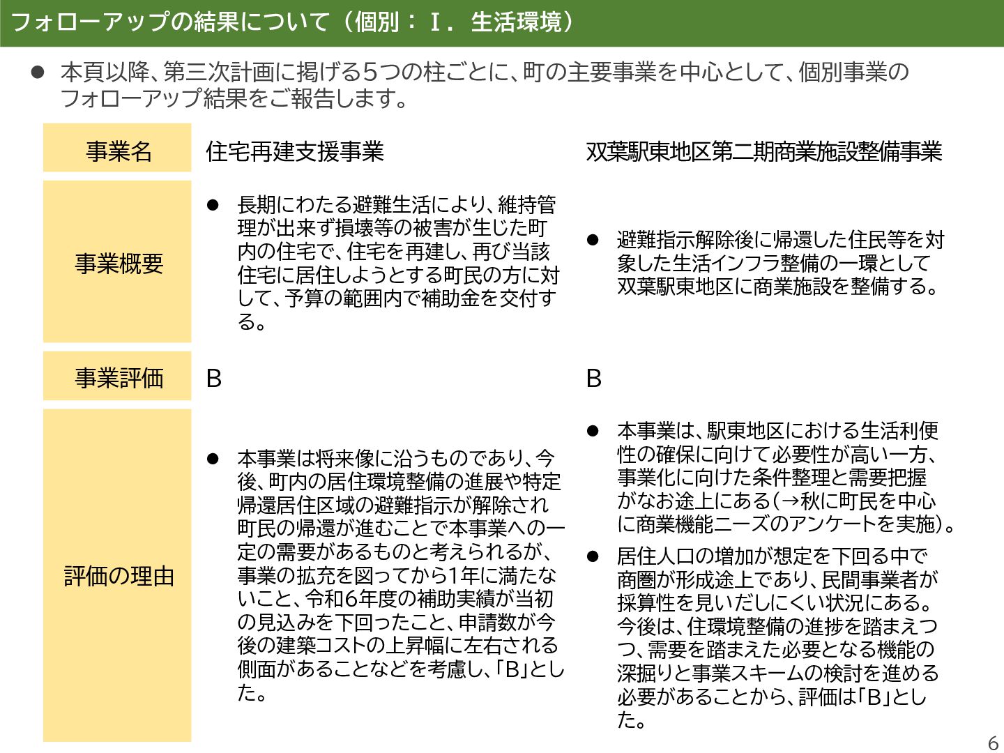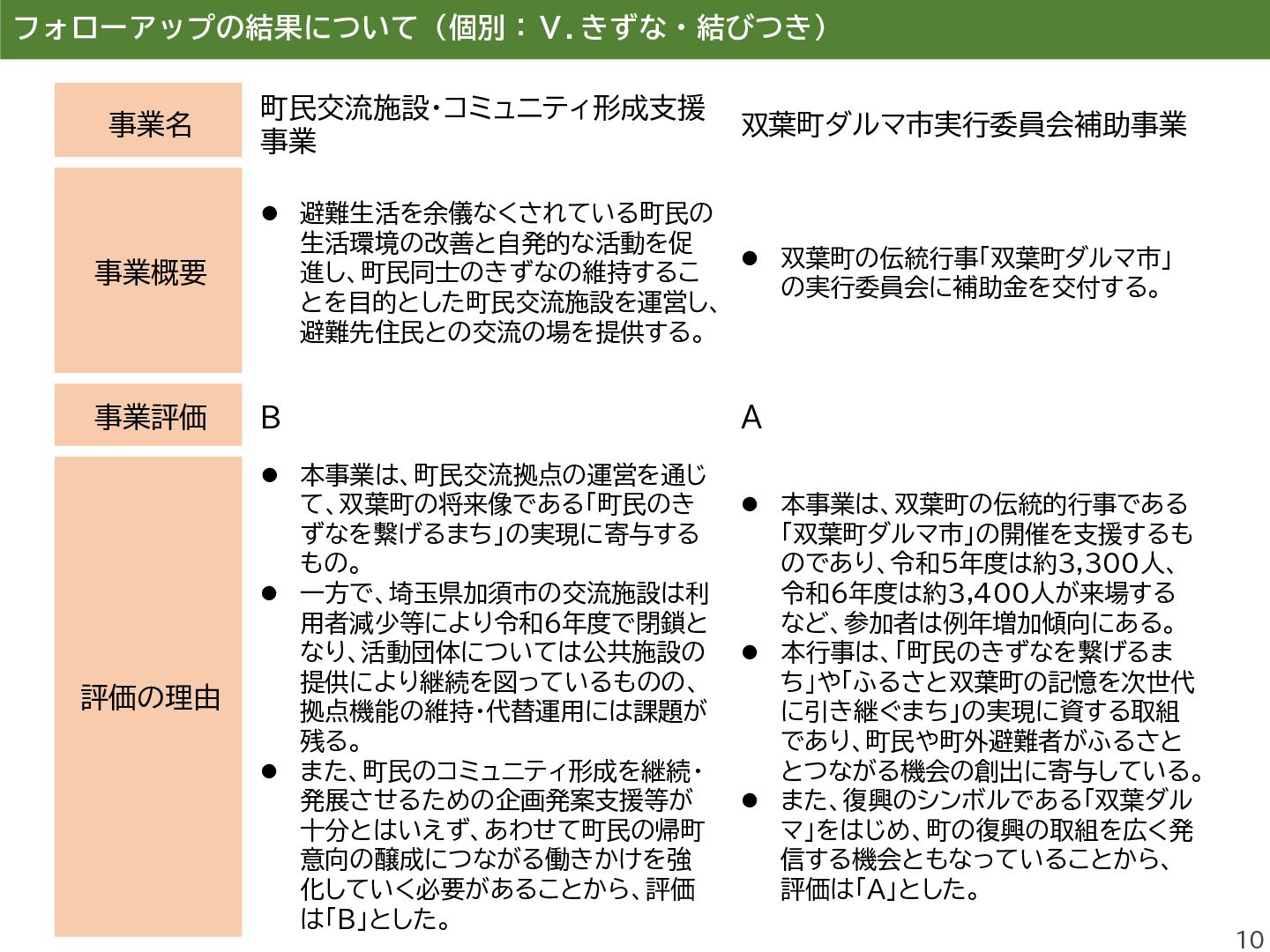 進し、町民同士のきずなの維持するこ とを目的とした町民交流施設を運営し、 避難先住民との交流の場を提供する。 ⚫ 双葉町の伝統行事「双葉町ダルマ市」 の実行委員会に補助金を交付する。 事業評価 B A 評価の理由 ⚫ 本事業は、町民交流拠点の運営を通じ て、双葉町の将来像である「町民のき ずなを繋げるまち」の実現に寄与する もの。 ⚫ 一方で、埼玉県加須市の交流施設は利 用者減少等により令和6年度で閉鎖と なり、活動団体については公共施設の 提供により継続を図っているものの、 拠点機能の維持・代替運用には課題が 残る。 ⚫ また、町民のコミュニティ形成を継続・ 発展させるための企画発案支援等が 十分とはいえず、あわせて町民の帰町 意向の醸成につながる働きかけを強 化していく必要があることから、評価 は「B」とした。 ⚫ 本事業は、双葉町の伝統的行事である 「双葉町ダルマ市」の開催を支援するも のであり、令和5年度は約3,300人、 令和6年度は約3,400人が来場する など、参加者は例年増加傾向にある。 ⚫ 本行事は、「町民のきずなを繋げるま ち」や「ふるさと双葉町の記憶を次世代 に引き継ぐまち」の実現に資する取組 であり、町民や町外避難者がふるさと とつながる機会の創出に寄与している。 ⚫ また、復興のシンボルである「双葉ダル マ」をはじめ、町の復興の取組を広く発 信する機会ともなっていることから、 評価は「A」とした。
