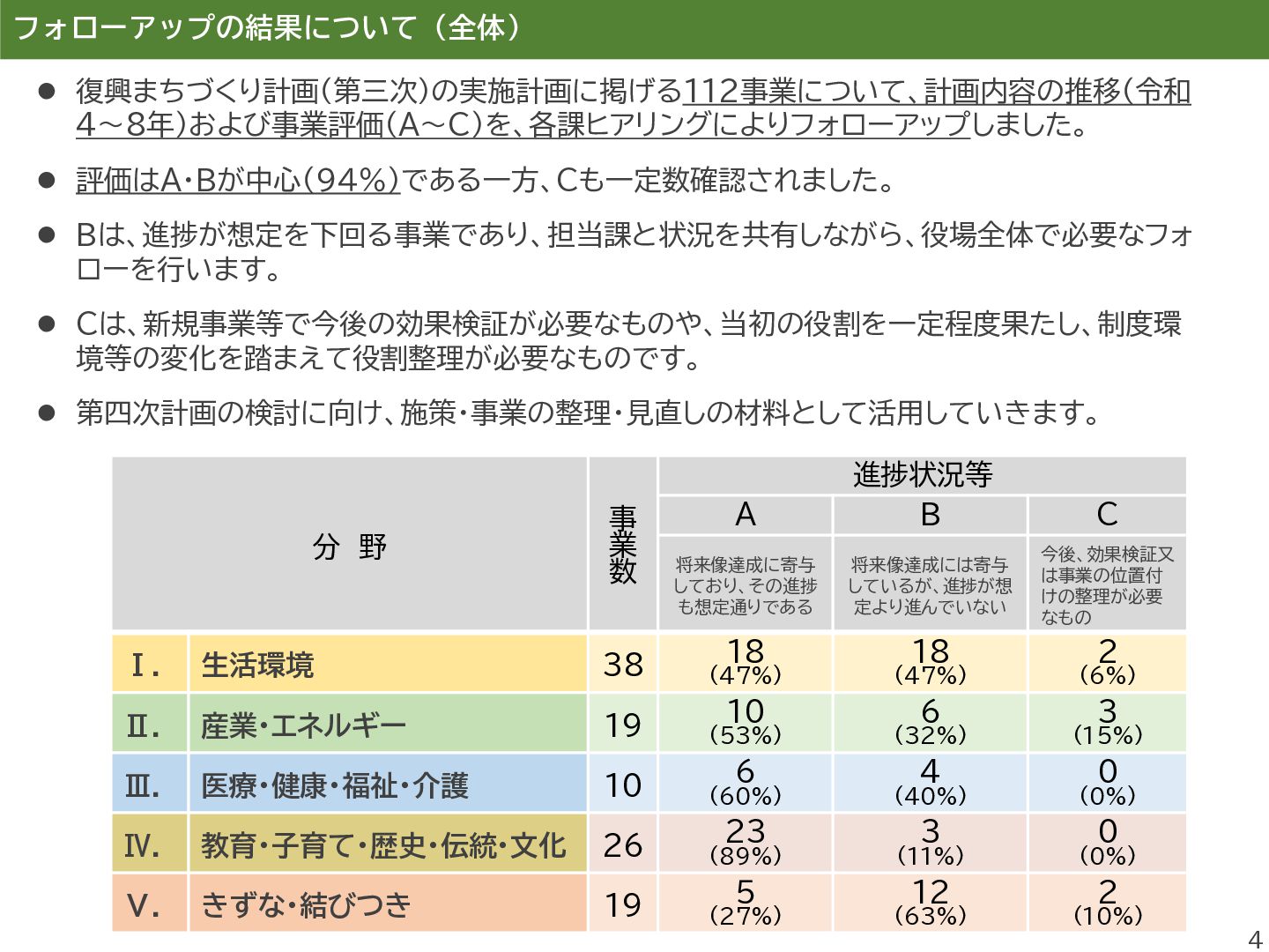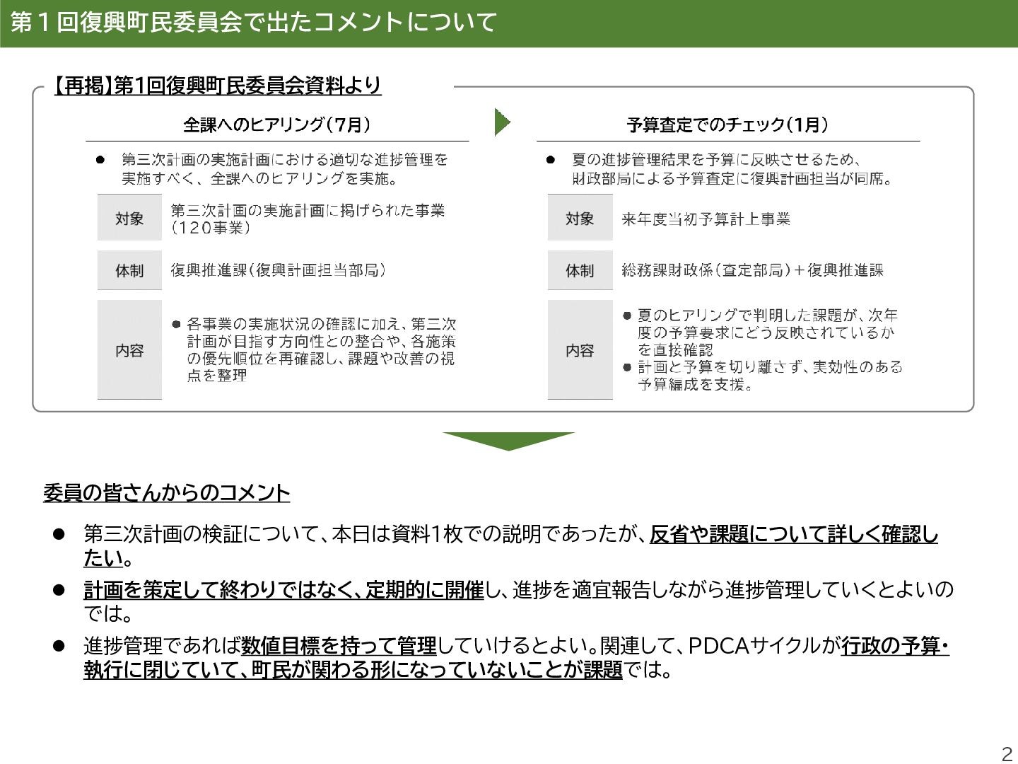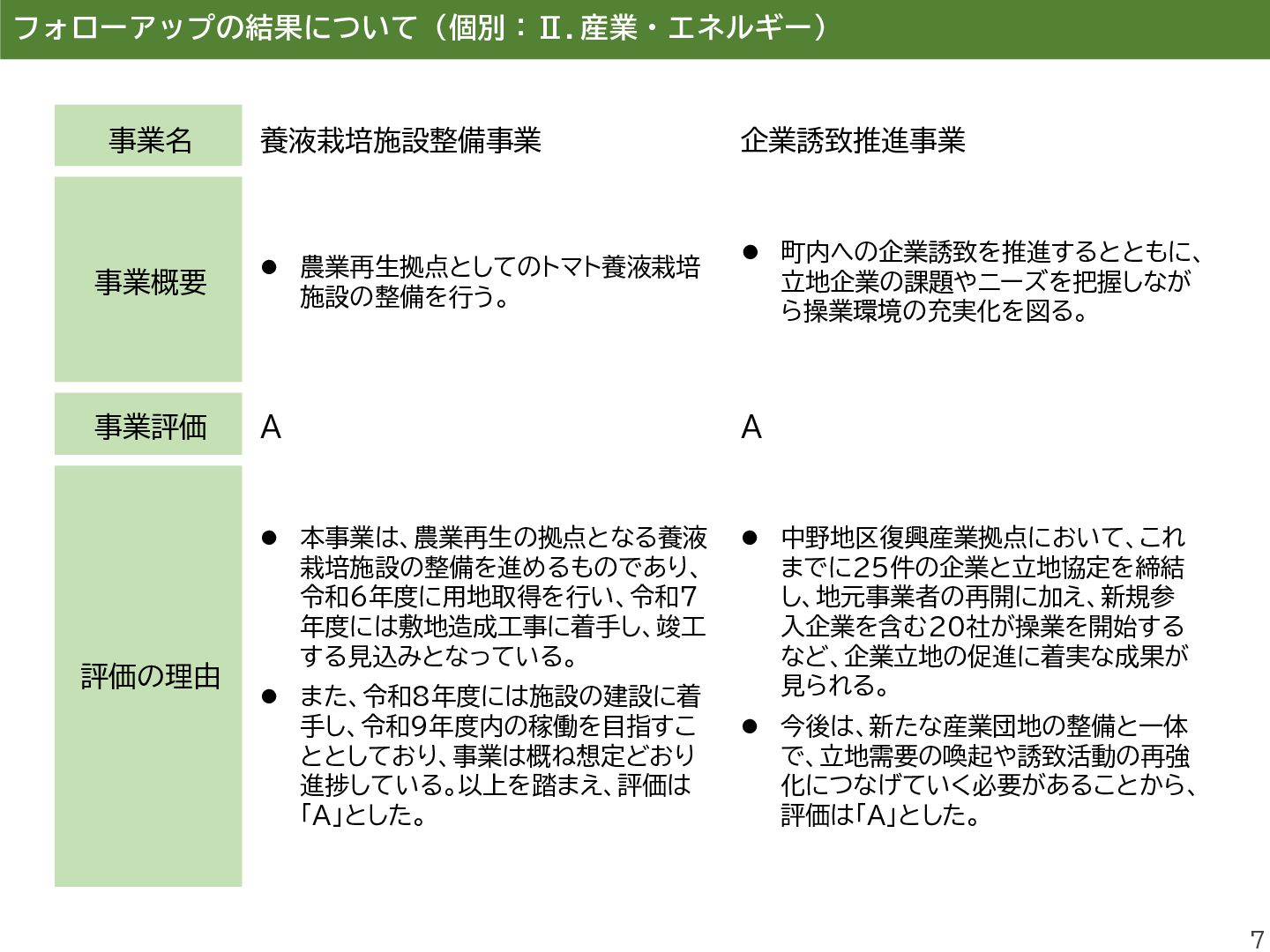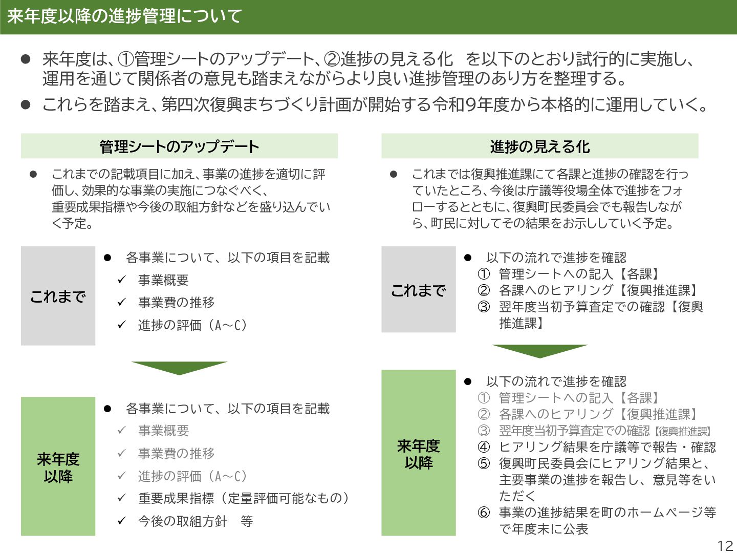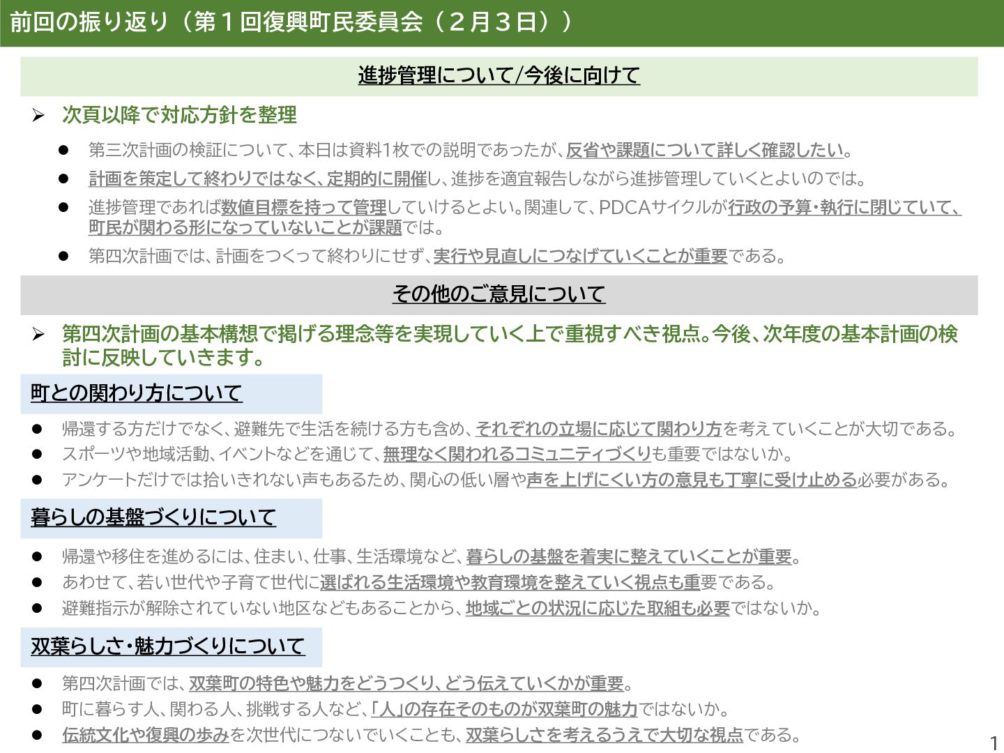 進し、町民同士のきずなの維持するこ とを目的とした町民交流施設を運営し、 避難先住民との交流の場を提供する。 ⚫ 双葉町の伝統行事「双葉町ダルマ市」 の実行委員会に補助金を交付する。 事業評価 B A 評価の理由 ⚫ 本事業は、町民交流拠点の運営を通じ て、双葉町の将来像である「町民のき ずなを繋げるまち」の実現に寄与する もの。 ⚫ 一方で、埼玉県加須市の交流施設は利 用者減少等により令和6年度で閉鎖と なり、活動団体については公共施設の 提供により継続を図っているものの、 拠点機能の維持・代替運用には課題が 残る。 ⚫ また、町民のコミュニティ形成を継続・ 発展させるための企画発案支援等が 十分とはいえず、あわせて町民の帰町 意向の醸成につながる働きかけを強 化していく必要があることから、評価 は「B」とした。 ⚫ 本事業は、双葉町の伝統的行事である 「双葉町ダルマ市」の開催を支援するも のであり、令和5年度は約3,300人、 令和6年度は約3,400人が来場する など、参加者は例年増加傾向にある。 ⚫ 本行事は、「町民のきずなを繋げるま ち」や「ふるさと双葉町の記憶を次世代 に引き継ぐまち」の実現に資する取組 であり、町民や町外避難者がふるさと とつながる機会の創出に寄与している。 ⚫ また、復興のシンボルである「双葉ダル マ」をはじめ、町の復興の取組を広く発 信する機会ともなっていることから、 評価は「A」とした。