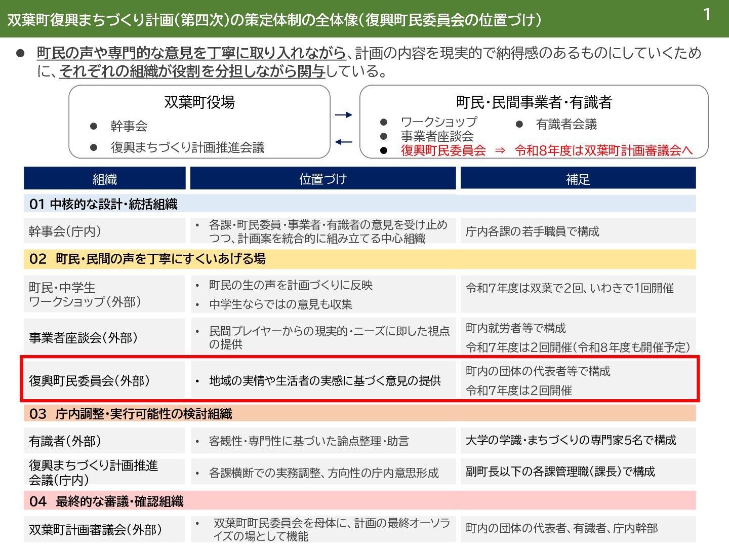 幹事会(庁内) • 各課・町民委員・事業者・有識者の意見を受け止め つつ、計画案を統合的に組み立てる中心組織 庁内各課の若手職員で構成 02 町民・民間の声を丁寧にすくいあげる場 町民・中学生 ワークショップ(外部) • 町民の生の声を計画づくりに反映 • 中学生ならではの意見も収集 令和7年度は双葉で2回、いわきで1回開催 事業者座談会(外部) • 民間プレイヤーからの現実的・ニーズに即した視点 の提供 町内就労者等で構成 令和7年度は2回開催(令和8年度も開催予定) 復興町民委員会(外部) • 地域の実情や生活者の実感に基づく意見の提供 町内の団体の代表者等で構成 令和7年度は2回開催 03 庁内調整・実行可能性の検討組織 有識者(外部) • 客観性・専門性に基づいた論点整理・助言 大学の学識・まちづくりの専門家5名で構成 復興まちづくり計画推進 会議(庁内) • 各課横断での実務調整、方向性の庁内意思形成 副町長以下の各課管理職(課長)で構成 04 最終的な審議・確認組織 双葉町計画審議会(外部) • 双葉町町民委員会を母体に、計画の最終オーソラ イズの場として機能 町内の団体の代表者、有識者、庁内幹部 双葉町役場 ⚫ 幹事会 ⚫ 復興まちづくり計画推進会議 町民・民間事業者・有識者 ⚫ ワークショップ ⚫ 事業者座談会 ⚫ 復興町民委員会 ⇒ 令和8年度は双葉町計画審議会へ ⚫ 有識者会議