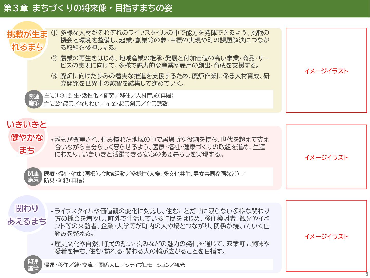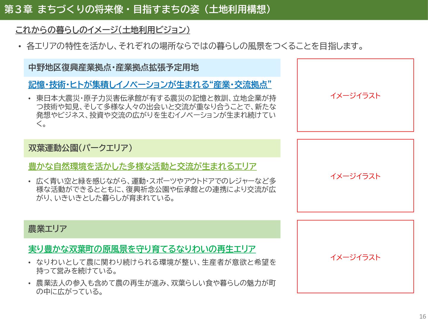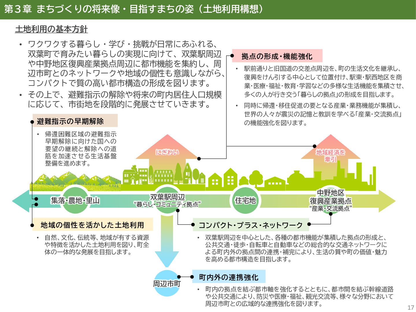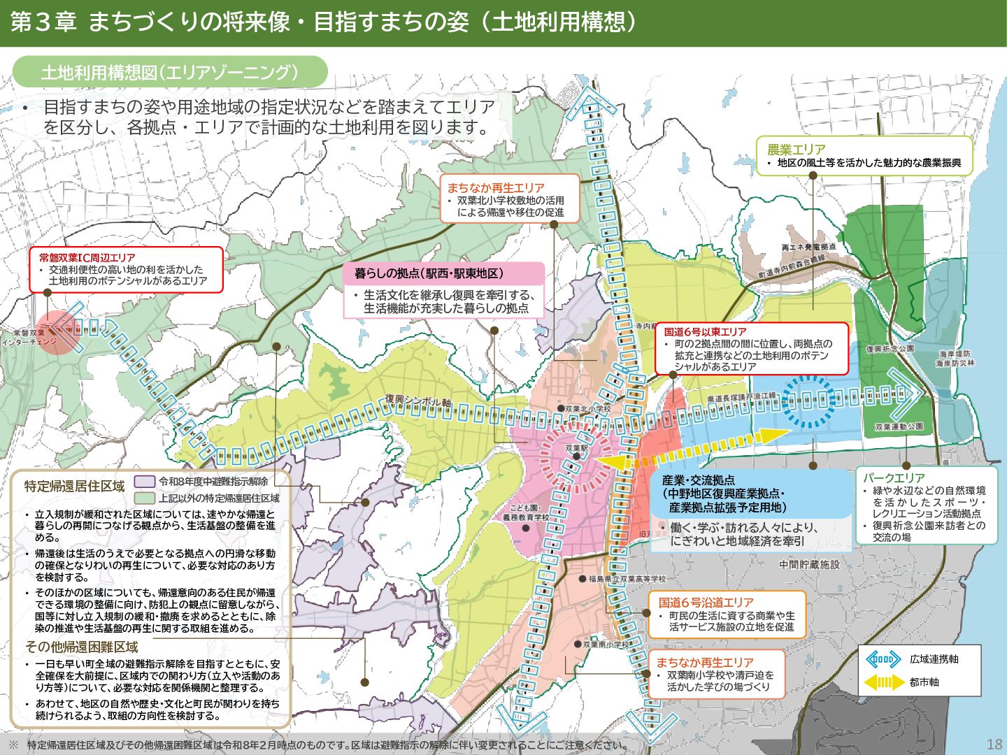 古代には清戸廹横穴や郡衙(郡山地区)が置かれ、近世では中村藩の陣屋(長塚地区)が置かれるなど標葉郡の中心地の 一つ。 • 中村藩では18世紀後半から19世紀初頭にかけて飢饉や自然災害が多発し、人口が大幅に減少。その際、北陸から浄土 真宗門徒の移民受入と、報徳仕法による産業復興と財政再建を図る。 • 1923年に双葉郡初の普通中学校(後の県立双葉高校)が設立。「文教のまち」と呼ばれる。 • 戦前の1941年に整備した磐城陸軍飛行場を戦後は塩田、原子力発電所用地として活用。 • 東日本大震災及び東京電力福島第一原子力発電所の爆発事故により全町避難。2022年に特定復興再生拠点区域全域の 避難指示が解除され住民の帰還が実現。 双葉町の文化 • 相馬藩5郷の1つとして、相馬野馬追の歴史が残る。初發神社の御祭神、妙見大明神は相馬市の氏神。 • ダルマ市はおよそ300年前から続く。七転び八起きの意味をもつダルマは東日本大震災と原発事故の被害を受けた双 葉町の復興のシンボルとなった。 • 前田稲荷神社(農業・商売の神)の御神木として、樹齢1,000年以上の前田の大杉が存在。 • 神楽や盆踊り、じゃんがら念仏踊り、せんだん太鼓など、多くの町民が参加する催しを盛んに開催。 これまでの復興の歩み • 2017年 復興に向けた道すじができる(特定復興再生拠点区域の設定) • 2020年 町へのアクセス手段と拠点施設の整備(常磐双葉IC、JR双葉駅新駅舎、東日本大震災・原子力災害伝承館、 双葉町産業交流センター) • 2022年 帰還開始(特定復興再生拠点区域の避難指示解除、双葉町役場新庁舎の開庁、駅西住宅の整備) • 2023年 生活再建の開始(浅野撚糸・フタバスーパーゼロミル、ファミリーマートの出店) • 2024年 移住定住相談センター(旧三宮堂田中医院)開所、双葉花火大会やふたばフードフェス開催 • 2025年 FUTAHOME、イオン双葉店がオープン