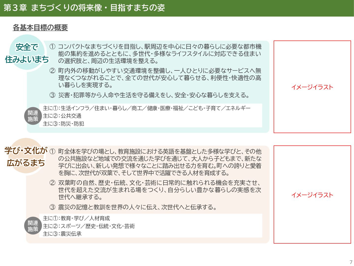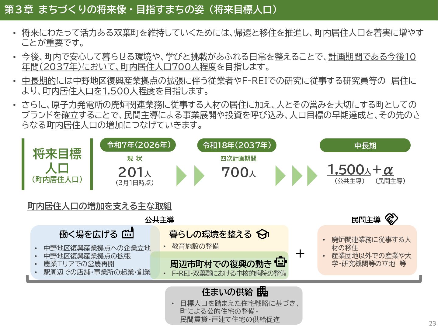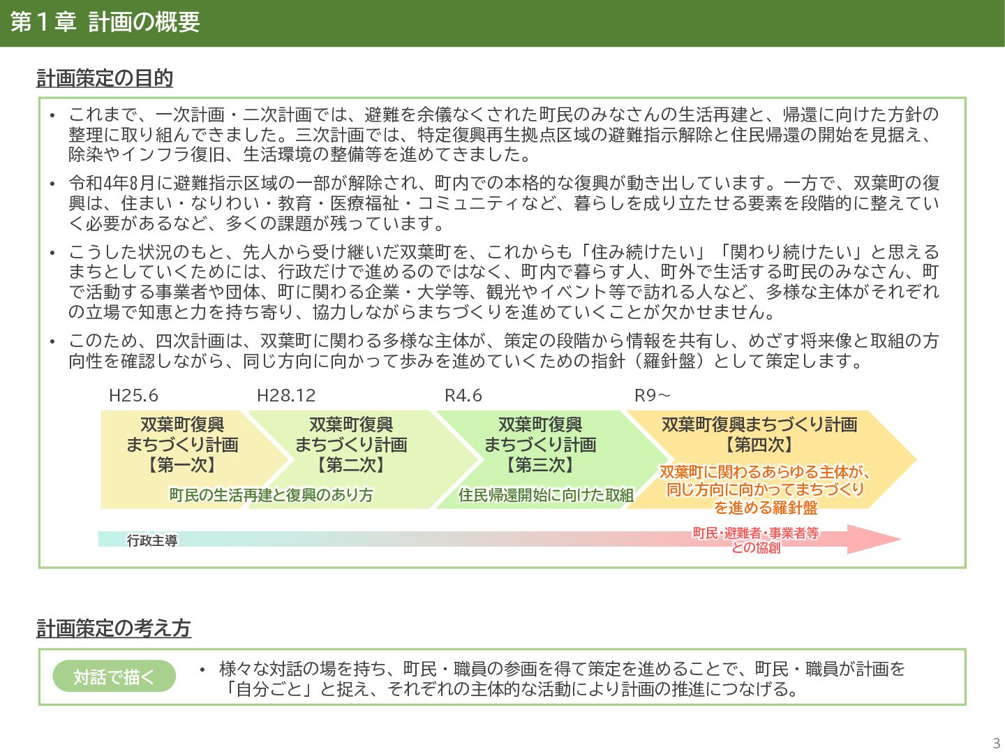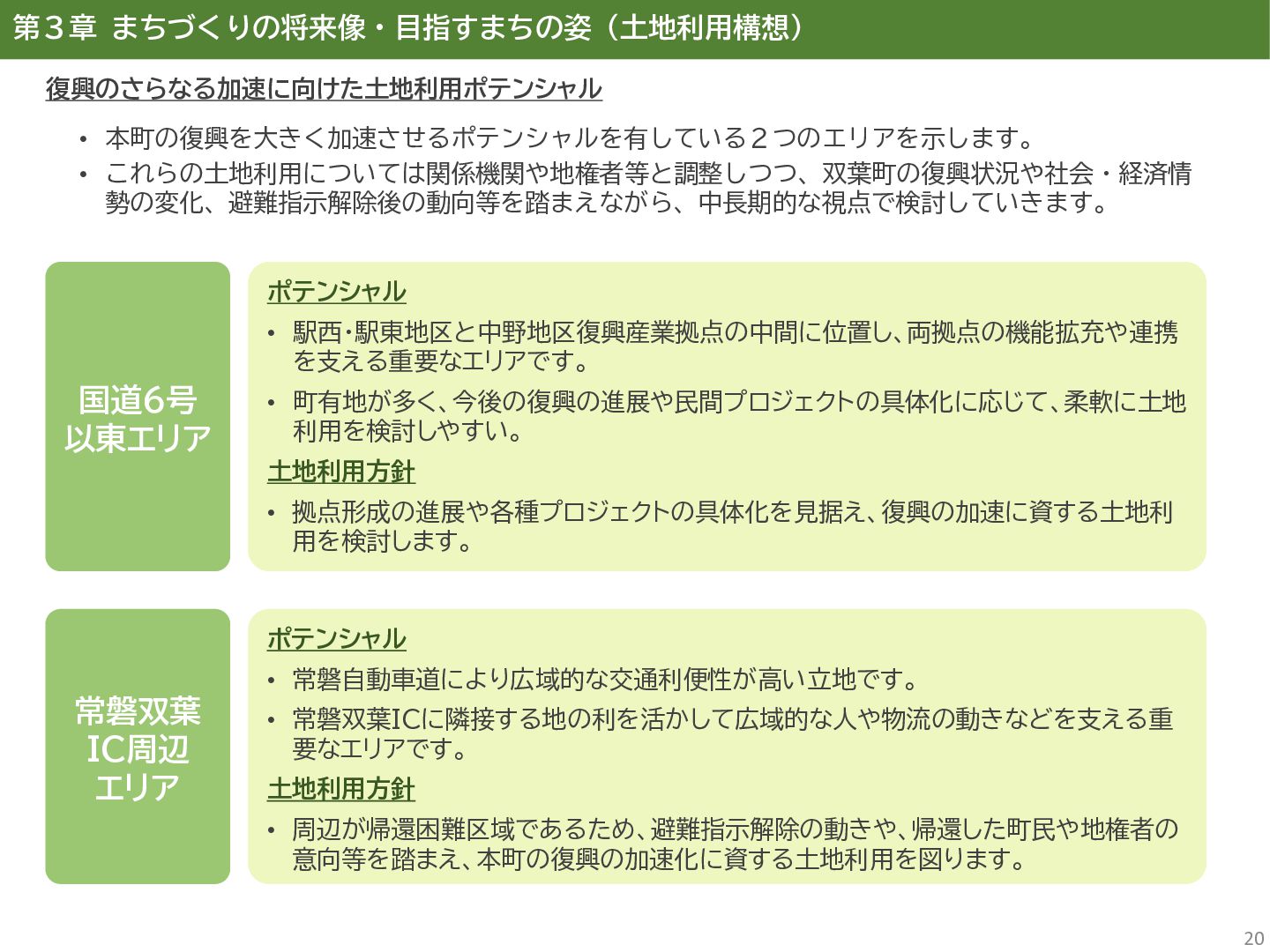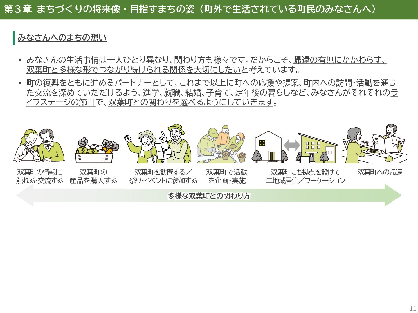 古代には清戸廹横穴や郡衙(郡山地区)が置かれ、近世では中村藩の陣屋(長塚地区)が置かれるなど標葉郡の中心地の 一つ。 • 中村藩では18世紀後半から19世紀初頭にかけて飢饉や自然災害が多発し、人口が大幅に減少。その際、北陸から浄土 真宗門徒の移民受入と、報徳仕法による産業復興と財政再建を図る。 • 1923年に双葉郡初の普通中学校(後の県立双葉高校)が設立。「文教のまち」と呼ばれる。 • 戦前の1941年に整備した磐城陸軍飛行場を戦後は塩田、原子力発電所用地として活用。 • 東日本大震災及び東京電力福島第一原子力発電所の爆発事故により全町避難。2022年に特定復興再生拠点区域全域の 避難指示が解除され住民の帰還が実現。 双葉町の文化 • 相馬藩5郷の1つとして、相馬野馬追の歴史が残る。初發神社の御祭神、妙見大明神は相馬市の氏神。 • ダルマ市はおよそ300年前から続く。七転び八起きの意味をもつダルマは東日本大震災と原発事故の被害を受けた双 葉町の復興のシンボルとなった。 • 前田稲荷神社(農業・商売の神)の御神木として、樹齢1,000年以上の前田の大杉が存在。 • 神楽や盆踊り、じゃんがら念仏踊り、せんだん太鼓など、多くの町民が参加する催しを盛んに開催。 これまでの復興の歩み • 2017年 復興に向けた道すじができる(特定復興再生拠点区域の設定) • 2020年 町へのアクセス手段と拠点施設の整備(常磐双葉IC、JR双葉駅新駅舎、東日本大震災・原子力災害伝承館、 双葉町産業交流センター) • 2022年 帰還開始(特定復興再生拠点区域の避難指示解除、双葉町役場新庁舎の開庁、駅西住宅の整備) • 2023年 生活再建の開始(浅野撚糸・フタバスーパーゼロミル、ファミリーマートの出店) • 2024年 移住定住相談センター(旧三宮堂田中医院)開所、双葉花火大会やふたばフードフェス開催 • 2025年 FUTAHOME、イオン双葉店がオープン