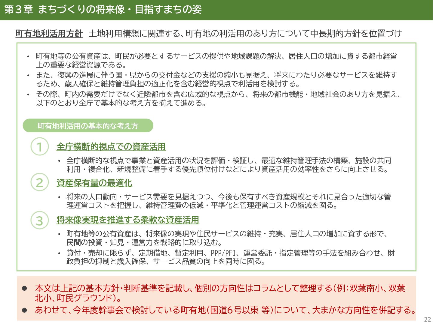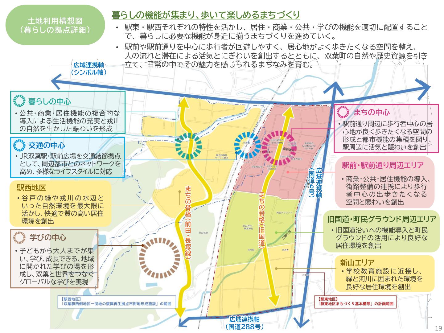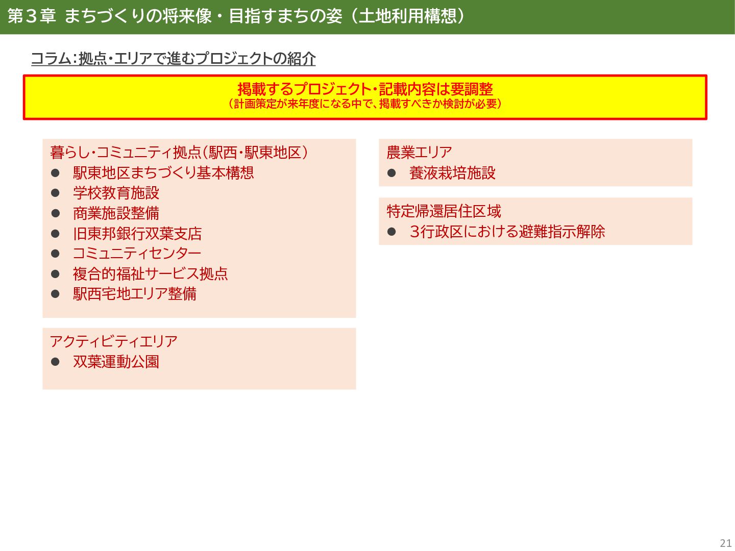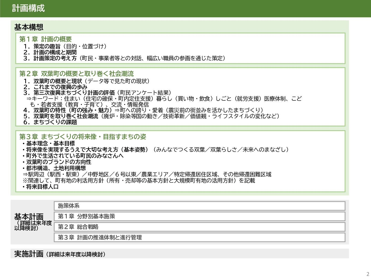 古代には清戸廹横穴や郡衙(郡山地区)が置かれ、近世では中村藩の陣屋(長塚地区)が置かれるなど標葉郡の中心地の 一つ。 • 中村藩では18世紀後半から19世紀初頭にかけて飢饉や自然災害が多発し、人口が大幅に減少。その際、北陸から浄土 真宗門徒の移民受入と、報徳仕法による産業復興と財政再建を図る。 • 1923年に双葉郡初の普通中学校(後の県立双葉高校)が設立。「文教のまち」と呼ばれる。 • 戦前の1941年に整備した磐城陸軍飛行場を戦後は塩田、原子力発電所用地として活用。 • 東日本大震災及び東京電力福島第一原子力発電所の爆発事故により全町避難。2022年に特定復興再生拠点区域全域の 避難指示が解除され住民の帰還が実現。 双葉町の文化 • 相馬藩5郷の1つとして、相馬野馬追の歴史が残る。初發神社の御祭神、妙見大明神は相馬市の氏神。 • ダルマ市はおよそ300年前から続く。七転び八起きの意味をもつダルマは東日本大震災と原発事故の被害を受けた双 葉町の復興のシンボルとなった。 • 前田稲荷神社(農業・商売の神)の御神木として、樹齢1,000年以上の前田の大杉が存在。 • 神楽や盆踊り、じゃんがら念仏踊り、せんだん太鼓など、多くの町民が参加する催しを盛んに開催。 これまでの復興の歩み • 2017年 復興に向けた道すじができる(特定復興再生拠点区域の設定) • 2020年 町へのアクセス手段と拠点施設の整備(常磐双葉IC、JR双葉駅新駅舎、東日本大震災・原子力災害伝承館、 双葉町産業交流センター) • 2022年 帰還開始(特定復興再生拠点区域の避難指示解除、双葉町役場新庁舎の開庁、駅西住宅の整備) • 2023年 生活再建の開始(浅野撚糸・フタバスーパーゼロミル、ファミリーマートの出店) • 2024年 移住定住相談センター(旧三宮堂田中医院)開所、双葉花火大会やふたばフードフェス開催 • 2025年 FUTAHOME、イオン双葉店がオープン