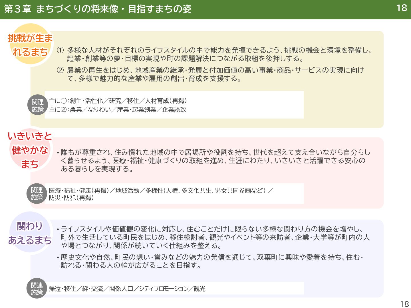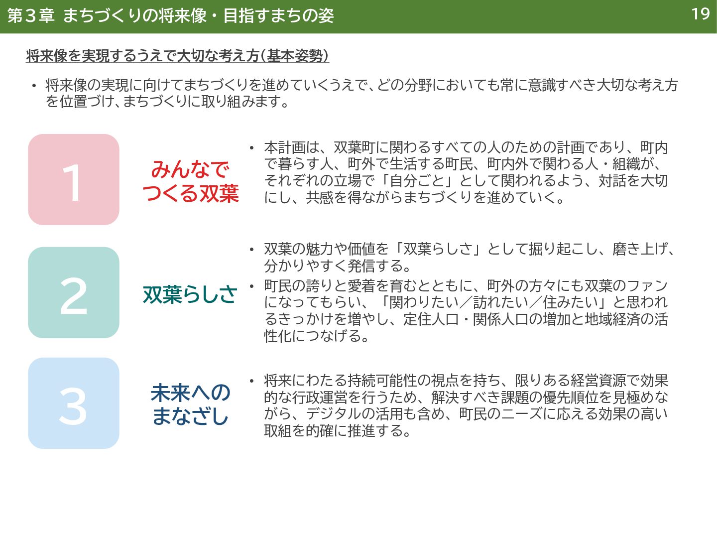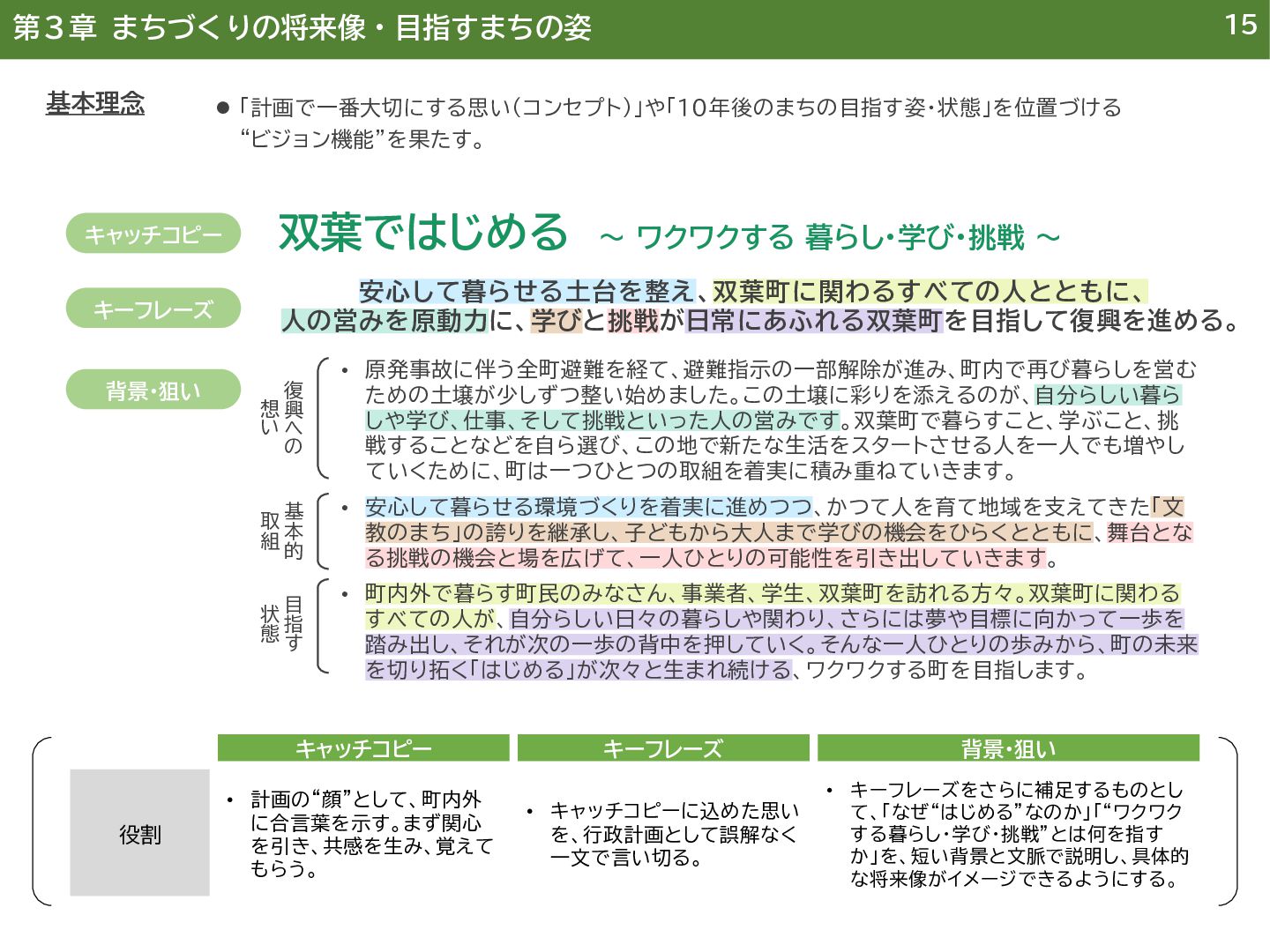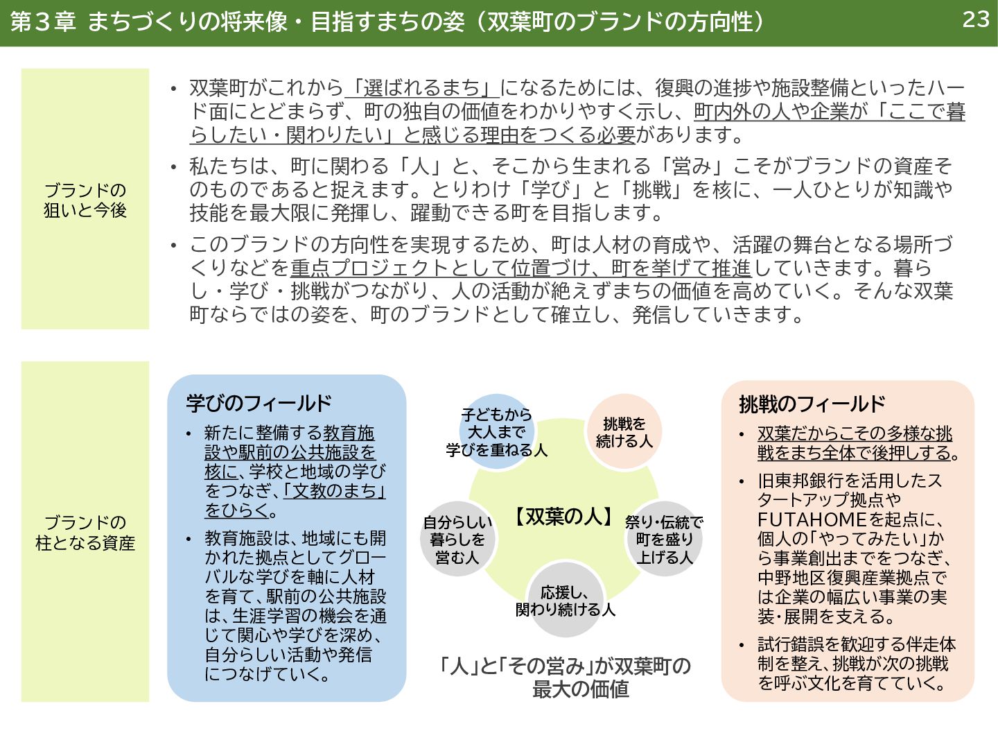 リティある取組 • 伝統・文化を残しつつ新しいまち • チャンスがあると集まる面白い人材 への支援 町 民 アンケート 今後重要度の高いまちづくり • 生活基盤整備(医療・福祉 /出産・子育て/ウェル ビーイング/生活利便性 /安全・安心) • 人への投資(コミュニティ /教育・人材育成/情報 発信・交流) • 持続可能な都市経営 ワークショップ (コミュニティ・つながり) • 価値観の近い人との出会い • 活動の発信 • 帰還に向けた支援(避難者 の視点が大事) • 移住者の定着支援 • 飲んで食べる社交場 • ご近所での支え合い • 学校を活かしたコミュニティ づくり(大人もこどもも) (起業・創業) • 個性ある様々な業種の商店を増 やし商店街を復活 • 双葉にあった事業を承継 • 個人事業主への支援 (モビリティ) • 未成年が徒歩・自転車で移動できる • 免許を返納しても移動できる (周辺自治体との連携) • 町の規模を冷静にみた連携 (歴史・文化) • 震災前の文化の継承 • 震災・原子力災害の伝承 (運動・生涯学習) • 運動・発表できる場所 (誇 り) • 自慢できる産業・産品 • 文教のまちの復活(双葉高 校の復活、F-REI家族の受 け皿、町民全員が学ぶ) 中学生 • おいしいものが食べられる(駄菓子、スイーツ、カフェ、 外国の料理、パン屋、ラーメンなど) • 楽しめる(SNS映えするデートスポット、双葉花火、異文 化交流、郡のみんなが集まれる大きな公園・体育館、こ どもの遊び場、バラ園、ペットショップ、ライブ会場、展 示場、サーキット、映画館、ショッピングモール、遊園地、 水族館、キャンプ場、温泉、ホテル) • 町民みんなで管理する花壇 • 美容(美容室、エステ、コスメショップ、エステサロン) • 教育(双葉高校の復活、大学、図書館) • 買い物(やっちゃば、本屋、花屋、雑貨店、服屋) • 町のシンボルとなるものをつくる • 大学があれば住んでいると思う • 双葉にもっと行きやすくしてほしい 事業者 町 長 • 帰還・移住しやすい環境整備 • 町外避難者への情報発信とお試し 居住・二地域居住等柔軟な施策 • 帰還者・移住者の協力 • 若手職員の活躍(アイデアの施策化) 職 員(幹事会) 社会潮流 • ふたばではじめる!~みんなで創り育てる ワクワクする未来を双葉から~ • ゼロイチタウン~みんなで創る未来~ • 町民主役のまちづくり(自分らしさ・自分ごと) • 0から1、1から10へ • 幸せな日常 • 選ばれるまち • 持続的な都市経営 • 震災・原発事故に対して最後に全町 避難指示が解除 • 震災前の街並み・建物を活かした復 興 • 双葉郡の学びの中心であった「文教 のまち」 • 清戸廹横穴、神楽等の歴史・文化 • だるま市、じゃんがら念仏祭り等の ふるさとの祭り • 海・山・川の恵まれた自然 • AI・ロボット・ドローン等の新技術・デ ジタル技術の発展 • 不安定な国際情勢、物価高を受けた 食料品、資源・エネルギーなどの経 済安全保障の重要性の高まり • インフラ老朽化に備えた持続可能な 維持管理の実現などより広範な防 災・国土強靭化 • 成長をけん引する人材育成とスター トアップの推進 • 地域資源に対する海外からの高い 評価 • 人口減少を受け止めた対応(新たな サービスや地域づくりによる豊かな 生活環境、若者や女性にも選ばれる 地方の実現) 安心な暮らし 不可欠なサービスの提供 /持続可能な都市経営 挑戦と活躍 楽しく・幸せな日常、起業・創業、新技術に挑戦 挑戦・活躍を支える教育・人材育成 双葉らしさ 自然・歴史・文化・街並みを 活かす • 教育で差別化(英語、プログラミング、 町内仕事学習、通学用モビリティなど) • VR・AI,F-REIなど軸となる産業 • 自由な働き方(小商い、兼業・副業) • スタートアップしやすい • 双葉町で循環する産業づくり • こどもで賑わう • 歩くことが楽しい町 • 言葉を交わし合う町 • 中長期間滞在できる • 震災・原発のまちとの ギャップ(安全・楽しさ) • 家族旅行の行き先になる • 住まなくても関われる • 住民・プレイヤーがまち づくりに参加できる • 企業・個人がチャレンジ できる • 小さいチャレンジ • みんなで話し合える • 双葉の資源(ストック、人) の活用 • 双葉らしいお土産 • 休める町・癒される町 • 外から来る理由のある町 • 映えるスポット • 海に気軽に行ける 14