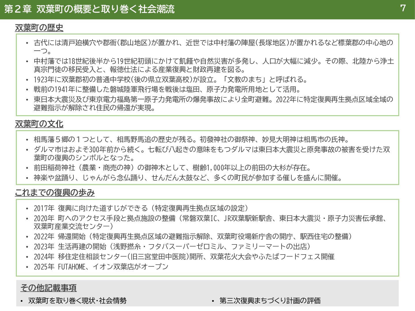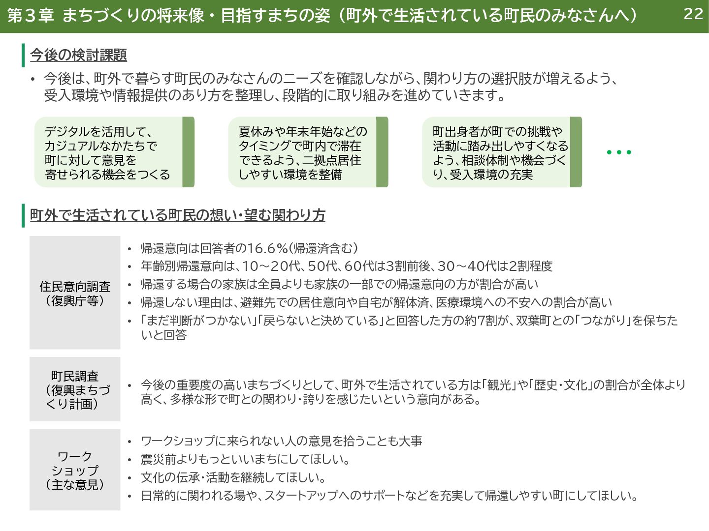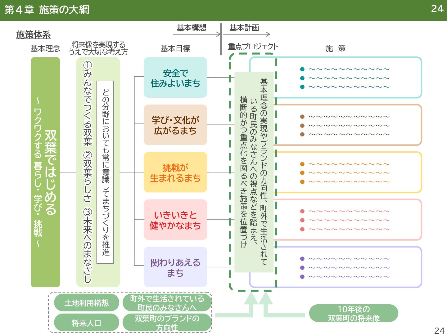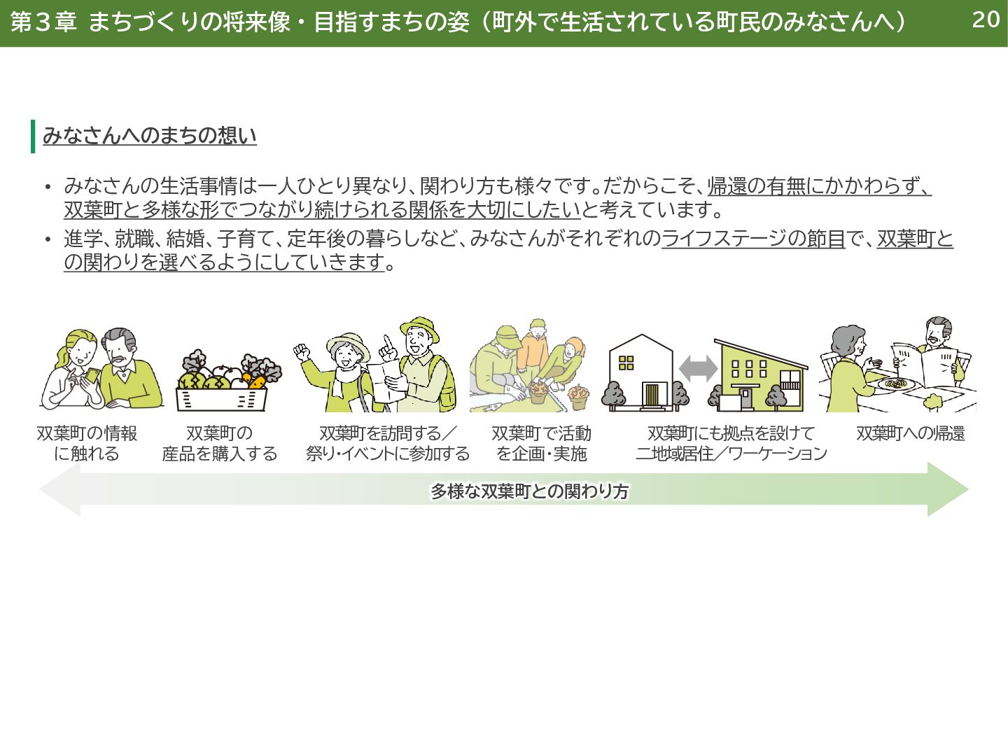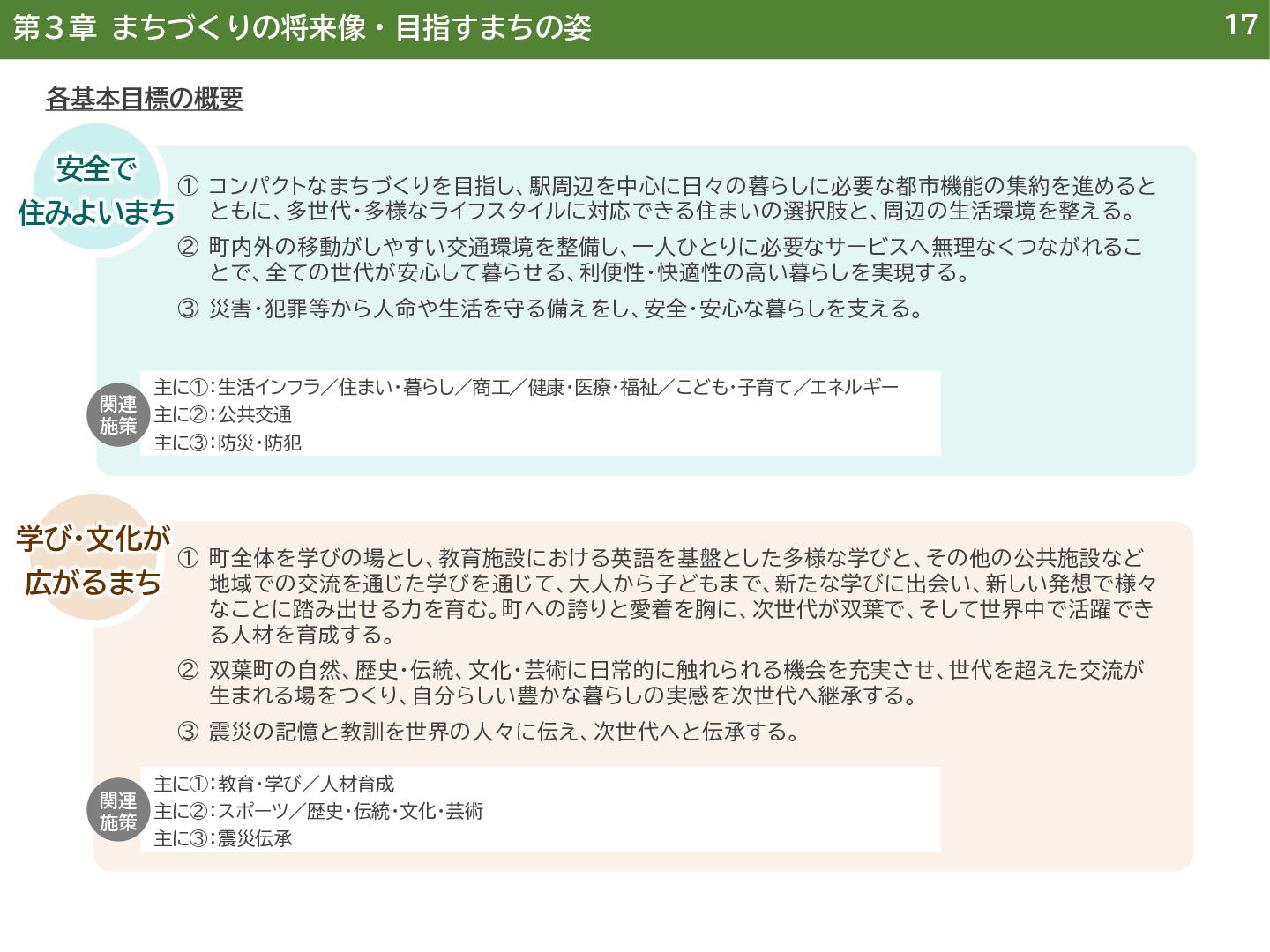 リティある取組 • 伝統・文化を残しつつ新しいまち • チャンスがあると集まる面白い人材 への支援 町 民 アンケート 今後重要度の高いまちづくり • 生活基盤整備(医療・福祉 /出産・子育て/ウェル ビーイング/生活利便性 /安全・安心) • 人への投資(コミュニティ /教育・人材育成/情報 発信・交流) • 持続可能な都市経営 ワークショップ (コミュニティ・つながり) • 価値観の近い人との出会い • 活動の発信 • 帰還に向けた支援(避難者 の視点が大事) • 移住者の定着支援 • 飲んで食べる社交場 • ご近所での支え合い • 学校を活かしたコミュニティ づくり(大人もこどもも) (起業・創業) • 個性ある様々な業種の商店を増 やし商店街を復活 • 双葉にあった事業を承継 • 個人事業主への支援 (モビリティ) • 未成年が徒歩・自転車で移動できる • 免許を返納しても移動できる (周辺自治体との連携) • 町の規模を冷静にみた連携 (歴史・文化) • 震災前の文化の継承 • 震災・原子力災害の伝承 (運動・生涯学習) • 運動・発表できる場所 (誇 り) • 自慢できる産業・産品 • 文教のまちの復活(双葉高 校の復活、F-REI家族の受 け皿、町民全員が学ぶ) 中学生 • おいしいものが食べられる(駄菓子、スイーツ、カフェ、 外国の料理、パン屋、ラーメンなど) • 楽しめる(SNS映えするデートスポット、双葉花火、異文 化交流、郡のみんなが集まれる大きな公園・体育館、こ どもの遊び場、バラ園、ペットショップ、ライブ会場、展 示場、サーキット、映画館、ショッピングモール、遊園地、 水族館、キャンプ場、温泉、ホテル) • 町民みんなで管理する花壇 • 美容(美容室、エステ、コスメショップ、エステサロン) • 教育(双葉高校の復活、大学、図書館) • 買い物(やっちゃば、本屋、花屋、雑貨店、服屋) • 町のシンボルとなるものをつくる • 大学があれば住んでいると思う • 双葉にもっと行きやすくしてほしい 事業者 町 長 • 帰還・移住しやすい環境整備 • 町外避難者への情報発信とお試し 居住・二地域居住等柔軟な施策 • 帰還者・移住者の協力 • 若手職員の活躍(アイデアの施策化) 職 員(幹事会) 社会潮流 • ふたばではじめる!~みんなで創り育てる ワクワクする未来を双葉から~ • ゼロイチタウン~みんなで創る未来~ • 町民主役のまちづくり(自分らしさ・自分ごと) • 0から1、1から10へ • 幸せな日常 • 選ばれるまち • 持続的な都市経営 • 震災・原発事故に対して最後に全町 避難指示が解除 • 震災前の街並み・建物を活かした復 興 • 双葉郡の学びの中心であった「文教 のまち」 • 清戸廹横穴、神楽等の歴史・文化 • だるま市、じゃんがら念仏祭り等の ふるさとの祭り • 海・山・川の恵まれた自然 • AI・ロボット・ドローン等の新技術・デ ジタル技術の発展 • 不安定な国際情勢、物価高を受けた 食料品、資源・エネルギーなどの経 済安全保障の重要性の高まり • インフラ老朽化に備えた持続可能な 維持管理の実現などより広範な防 災・国土強靭化 • 成長をけん引する人材育成とスター トアップの推進 • 地域資源に対する海外からの高い 評価 • 人口減少を受け止めた対応(新たな サービスや地域づくりによる豊かな 生活環境、若者や女性にも選ばれる 地方の実現) 安心な暮らし 不可欠なサービスの提供 /持続可能な都市経営 挑戦と活躍 楽しく・幸せな日常、起業・創業、新技術に挑戦 挑戦・活躍を支える教育・人材育成 双葉らしさ 自然・歴史・文化・街並みを 活かす • 教育で差別化(英語、プログラミング、 町内仕事学習、通学用モビリティなど) • VR・AI,F-REIなど軸となる産業 • 自由な働き方(小商い、兼業・副業) • スタートアップしやすい • 双葉町で循環する産業づくり • こどもで賑わう • 歩くことが楽しい町 • 言葉を交わし合う町 • 中長期間滞在できる • 震災・原発のまちとの ギャップ(安全・楽しさ) • 家族旅行の行き先になる • 住まなくても関われる • 住民・プレイヤーがまち づくりに参加できる • 企業・個人がチャレンジ できる • 小さいチャレンジ • みんなで話し合える • 双葉の資源(ストック、人) の活用 • 双葉らしいお土産 • 休める町・癒される町 • 外から来る理由のある町 • 映えるスポット • 海に気軽に行ける 14