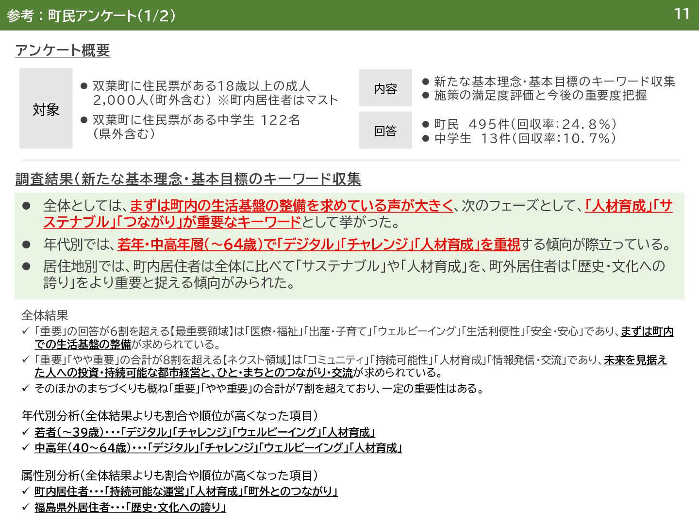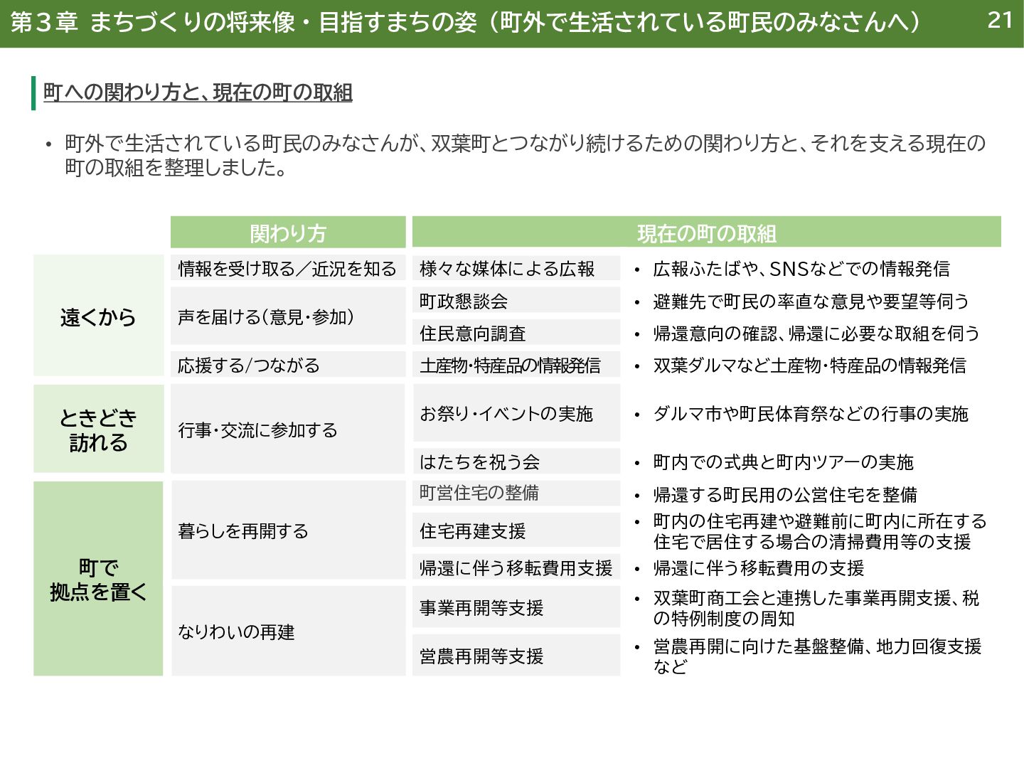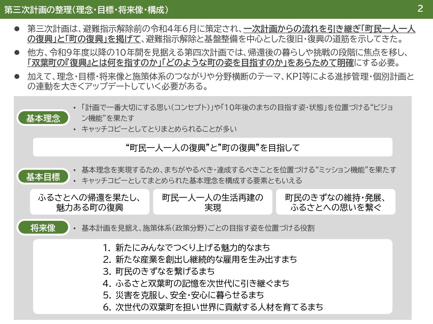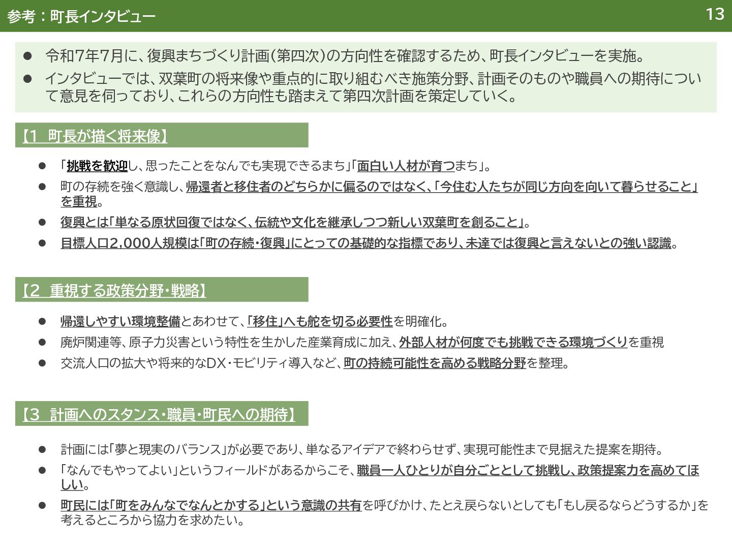 リティある取組 • 伝統・文化を残しつつ新しいまち • チャンスがあると集まる面白い人材 への支援 町 民 アンケート 今後重要度の高いまちづくり • 生活基盤整備(医療・福祉 /出産・子育て/ウェル ビーイング/生活利便性 /安全・安心) • 人への投資(コミュニティ /教育・人材育成/情報 発信・交流) • 持続可能な都市経営 ワークショップ (コミュニティ・つながり) • 価値観の近い人との出会い • 活動の発信 • 帰還に向けた支援(避難者 の視点が大事) • 移住者の定着支援 • 飲んで食べる社交場 • ご近所での支え合い • 学校を活かしたコミュニティ づくり(大人もこどもも) (起業・創業) • 個性ある様々な業種の商店を増 やし商店街を復活 • 双葉にあった事業を承継 • 個人事業主への支援 (モビリティ) • 未成年が徒歩・自転車で移動できる • 免許を返納しても移動できる (周辺自治体との連携) • 町の規模を冷静にみた連携 (歴史・文化) • 震災前の文化の継承 • 震災・原子力災害の伝承 (運動・生涯学習) • 運動・発表できる場所 (誇 り) • 自慢できる産業・産品 • 文教のまちの復活(双葉高 校の復活、F-REI家族の受 け皿、町民全員が学ぶ) 中学生 • おいしいものが食べられる(駄菓子、スイーツ、カフェ、 外国の料理、パン屋、ラーメンなど) • 楽しめる(SNS映えするデートスポット、双葉花火、異文 化交流、郡のみんなが集まれる大きな公園・体育館、こ どもの遊び場、バラ園、ペットショップ、ライブ会場、展 示場、サーキット、映画館、ショッピングモール、遊園地、 水族館、キャンプ場、温泉、ホテル) • 町民みんなで管理する花壇 • 美容(美容室、エステ、コスメショップ、エステサロン) • 教育(双葉高校の復活、大学、図書館) • 買い物(やっちゃば、本屋、花屋、雑貨店、服屋) • 町のシンボルとなるものをつくる • 大学があれば住んでいると思う • 双葉にもっと行きやすくしてほしい 事業者 町 長 • 帰還・移住しやすい環境整備 • 町外避難者への情報発信とお試し 居住・二地域居住等柔軟な施策 • 帰還者・移住者の協力 • 若手職員の活躍(アイデアの施策化) 職 員(幹事会) 社会潮流 • ふたばではじめる!~みんなで創り育てる ワクワクする未来を双葉から~ • ゼロイチタウン~みんなで創る未来~ • 町民主役のまちづくり(自分らしさ・自分ごと) • 0から1、1から10へ • 幸せな日常 • 選ばれるまち • 持続的な都市経営 • 震災・原発事故に対して最後に全町 避難指示が解除 • 震災前の街並み・建物を活かした復 興 • 双葉郡の学びの中心であった「文教 のまち」 • 清戸廹横穴、神楽等の歴史・文化 • だるま市、じゃんがら念仏祭り等の ふるさとの祭り • 海・山・川の恵まれた自然 • AI・ロボット・ドローン等の新技術・デ ジタル技術の発展 • 不安定な国際情勢、物価高を受けた 食料品、資源・エネルギーなどの経 済安全保障の重要性の高まり • インフラ老朽化に備えた持続可能な 維持管理の実現などより広範な防 災・国土強靭化 • 成長をけん引する人材育成とスター トアップの推進 • 地域資源に対する海外からの高い 評価 • 人口減少を受け止めた対応(新たな サービスや地域づくりによる豊かな 生活環境、若者や女性にも選ばれる 地方の実現) 安心な暮らし 不可欠なサービスの提供 /持続可能な都市経営 挑戦と活躍 楽しく・幸せな日常、起業・創業、新技術に挑戦 挑戦・活躍を支える教育・人材育成 双葉らしさ 自然・歴史・文化・街並みを 活かす • 教育で差別化(英語、プログラミング、 町内仕事学習、通学用モビリティなど) • VR・AI,F-REIなど軸となる産業 • 自由な働き方(小商い、兼業・副業) • スタートアップしやすい • 双葉町で循環する産業づくり • こどもで賑わう • 歩くことが楽しい町 • 言葉を交わし合う町 • 中長期間滞在できる • 震災・原発のまちとの ギャップ(安全・楽しさ) • 家族旅行の行き先になる • 住まなくても関われる • 住民・プレイヤーがまち づくりに参加できる • 企業・個人がチャレンジ できる • 小さいチャレンジ • みんなで話し合える • 双葉の資源(ストック、人) の活用 • 双葉らしいお土産 • 休める町・癒される町 • 外から来る理由のある町 • 映えるスポット • 海に気軽に行ける 14