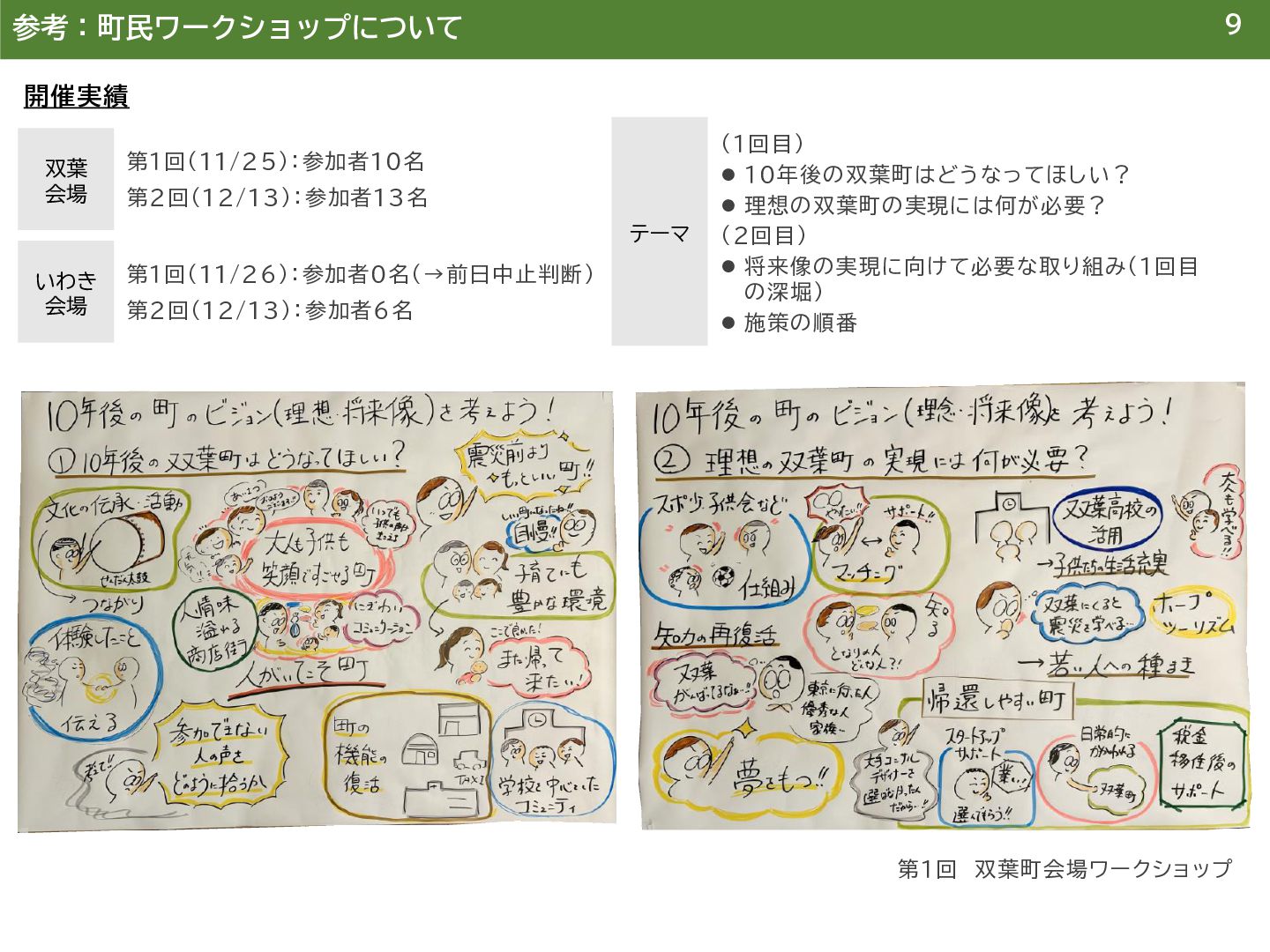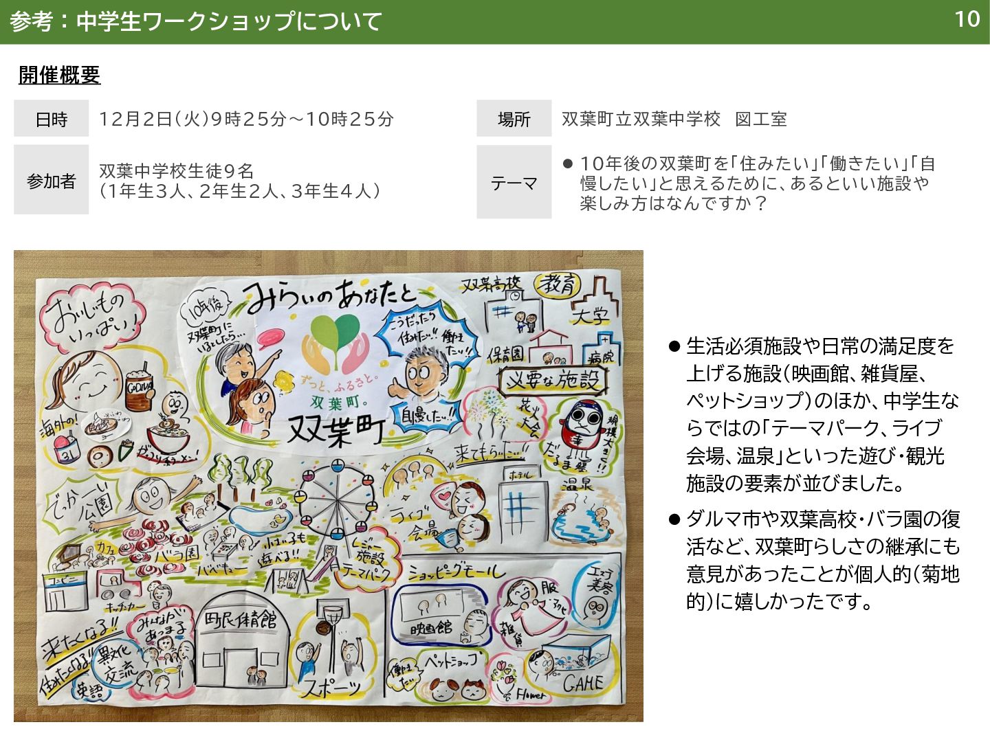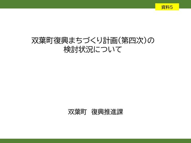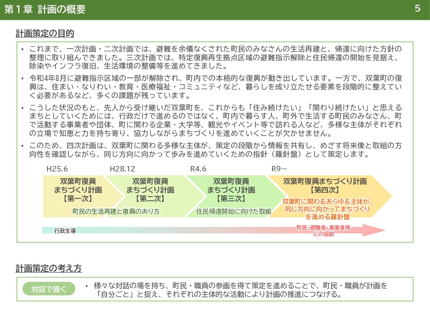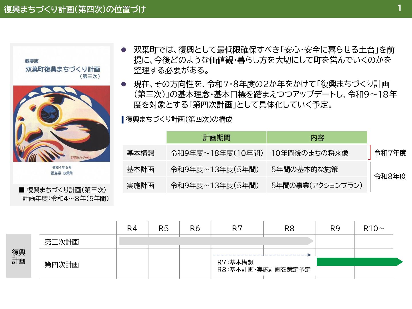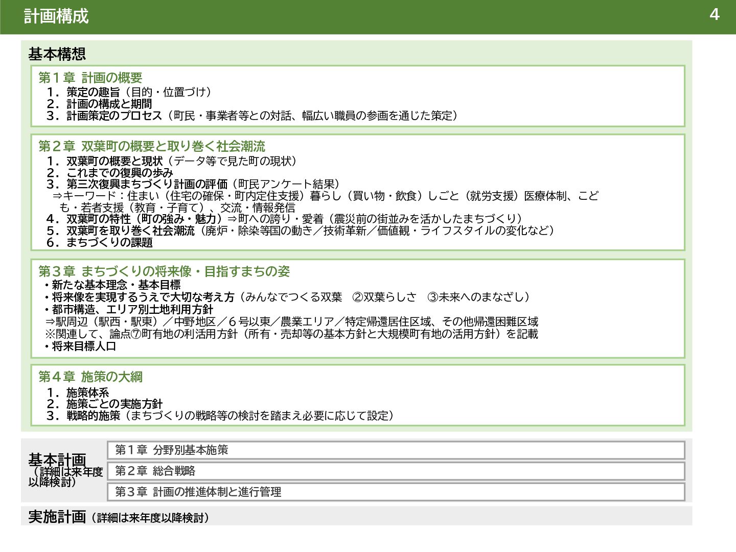 リティある取組 • 伝統・文化を残しつつ新しいまち • チャンスがあると集まる面白い人材 への支援 町 民 アンケート 今後重要度の高いまちづくり • 生活基盤整備(医療・福祉 /出産・子育て/ウェル ビーイング/生活利便性 /安全・安心) • 人への投資(コミュニティ /教育・人材育成/情報 発信・交流) • 持続可能な都市経営 ワークショップ (コミュニティ・つながり) • 価値観の近い人との出会い • 活動の発信 • 帰還に向けた支援(避難者 の視点が大事) • 移住者の定着支援 • 飲んで食べる社交場 • ご近所での支え合い • 学校を活かしたコミュニティ づくり(大人もこどもも) (起業・創業) • 個性ある様々な業種の商店を増 やし商店街を復活 • 双葉にあった事業を承継 • 個人事業主への支援 (モビリティ) • 未成年が徒歩・自転車で移動できる • 免許を返納しても移動できる (周辺自治体との連携) • 町の規模を冷静にみた連携 (歴史・文化) • 震災前の文化の継承 • 震災・原子力災害の伝承 (運動・生涯学習) • 運動・発表できる場所 (誇 り) • 自慢できる産業・産品 • 文教のまちの復活(双葉高 校の復活、F-REI家族の受 け皿、町民全員が学ぶ) 中学生 • おいしいものが食べられる(駄菓子、スイーツ、カフェ、 外国の料理、パン屋、ラーメンなど) • 楽しめる(SNS映えするデートスポット、双葉花火、異文 化交流、郡のみんなが集まれる大きな公園・体育館、こ どもの遊び場、バラ園、ペットショップ、ライブ会場、展 示場、サーキット、映画館、ショッピングモール、遊園地、 水族館、キャンプ場、温泉、ホテル) • 町民みんなで管理する花壇 • 美容(美容室、エステ、コスメショップ、エステサロン) • 教育(双葉高校の復活、大学、図書館) • 買い物(やっちゃば、本屋、花屋、雑貨店、服屋) • 町のシンボルとなるものをつくる • 大学があれば住んでいると思う • 双葉にもっと行きやすくしてほしい 事業者 町 長 • 帰還・移住しやすい環境整備 • 町外避難者への情報発信とお試し 居住・二地域居住等柔軟な施策 • 帰還者・移住者の協力 • 若手職員の活躍(アイデアの施策化) 職 員(幹事会) 社会潮流 • ふたばではじめる!~みんなで創り育てる ワクワクする未来を双葉から~ • ゼロイチタウン~みんなで創る未来~ • 町民主役のまちづくり(自分らしさ・自分ごと) • 0から1、1から10へ • 幸せな日常 • 選ばれるまち • 持続的な都市経営 • 震災・原発事故に対して最後に全町 避難指示が解除 • 震災前の街並み・建物を活かした復 興 • 双葉郡の学びの中心であった「文教 のまち」 • 清戸廹横穴、神楽等の歴史・文化 • だるま市、じゃんがら念仏祭り等の ふるさとの祭り • 海・山・川の恵まれた自然 • AI・ロボット・ドローン等の新技術・デ ジタル技術の発展 • 不安定な国際情勢、物価高を受けた 食料品、資源・エネルギーなどの経 済安全保障の重要性の高まり • インフラ老朽化に備えた持続可能な 維持管理の実現などより広範な防 災・国土強靭化 • 成長をけん引する人材育成とスター トアップの推進 • 地域資源に対する海外からの高い 評価 • 人口減少を受け止めた対応(新たな サービスや地域づくりによる豊かな 生活環境、若者や女性にも選ばれる 地方の実現) 安心な暮らし 不可欠なサービスの提供 /持続可能な都市経営 挑戦と活躍 楽しく・幸せな日常、起業・創業、新技術に挑戦 挑戦・活躍を支える教育・人材育成 双葉らしさ 自然・歴史・文化・街並みを 活かす • 教育で差別化(英語、プログラミング、 町内仕事学習、通学用モビリティなど) • VR・AI,F-REIなど軸となる産業 • 自由な働き方(小商い、兼業・副業) • スタートアップしやすい • 双葉町で循環する産業づくり • こどもで賑わう • 歩くことが楽しい町 • 言葉を交わし合う町 • 中長期間滞在できる • 震災・原発のまちとの ギャップ(安全・楽しさ) • 家族旅行の行き先になる • 住まなくても関われる • 住民・プレイヤーがまち づくりに参加できる • 企業・個人がチャレンジ できる • 小さいチャレンジ • みんなで話し合える • 双葉の資源(ストック、人) の活用 • 双葉らしいお土産 • 休める町・癒される町 • 外から来る理由のある町 • 映えるスポット • 海に気軽に行ける 14