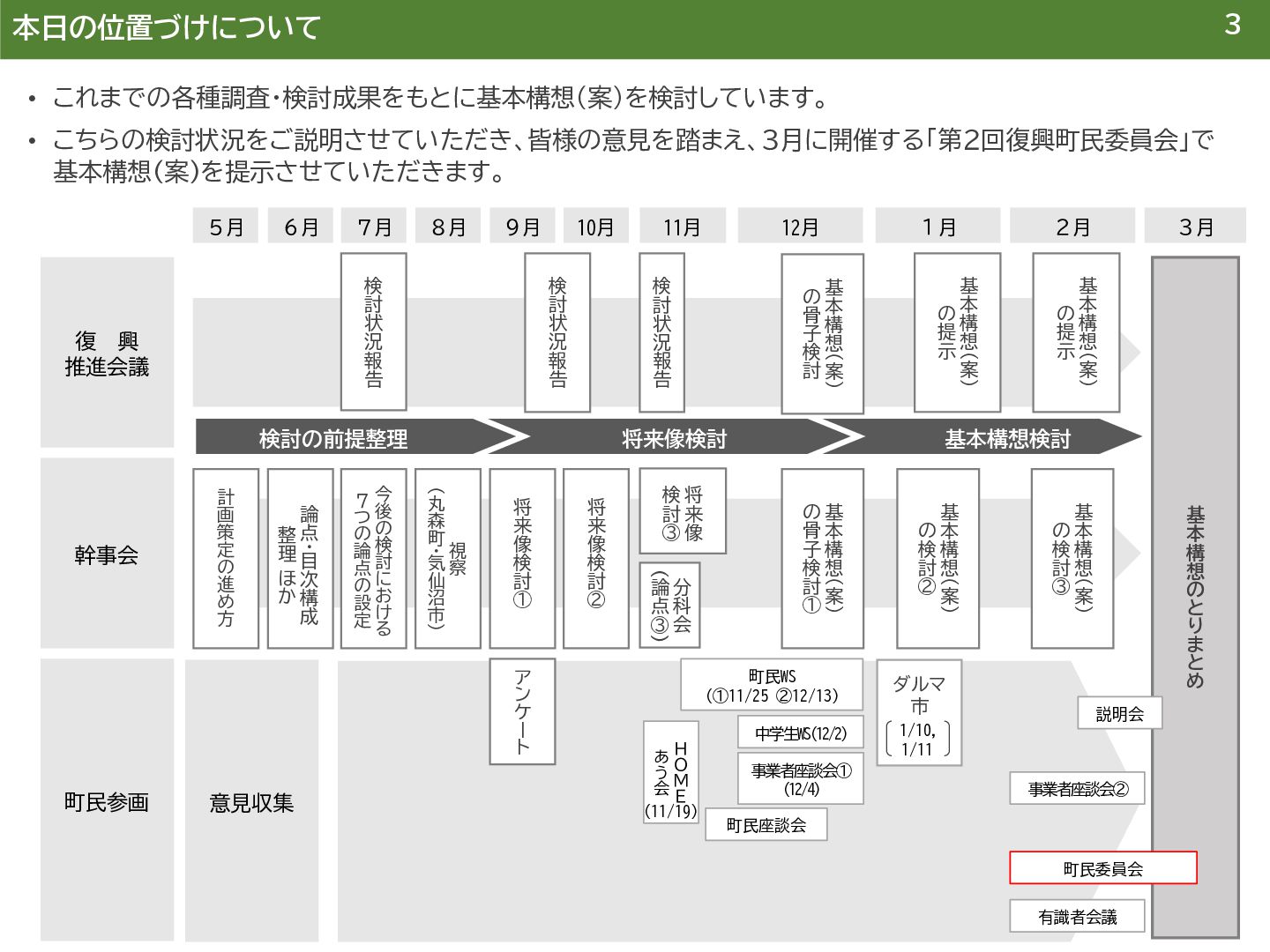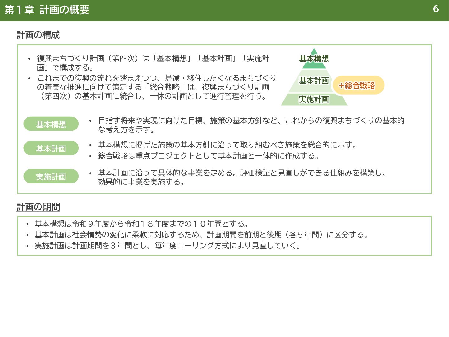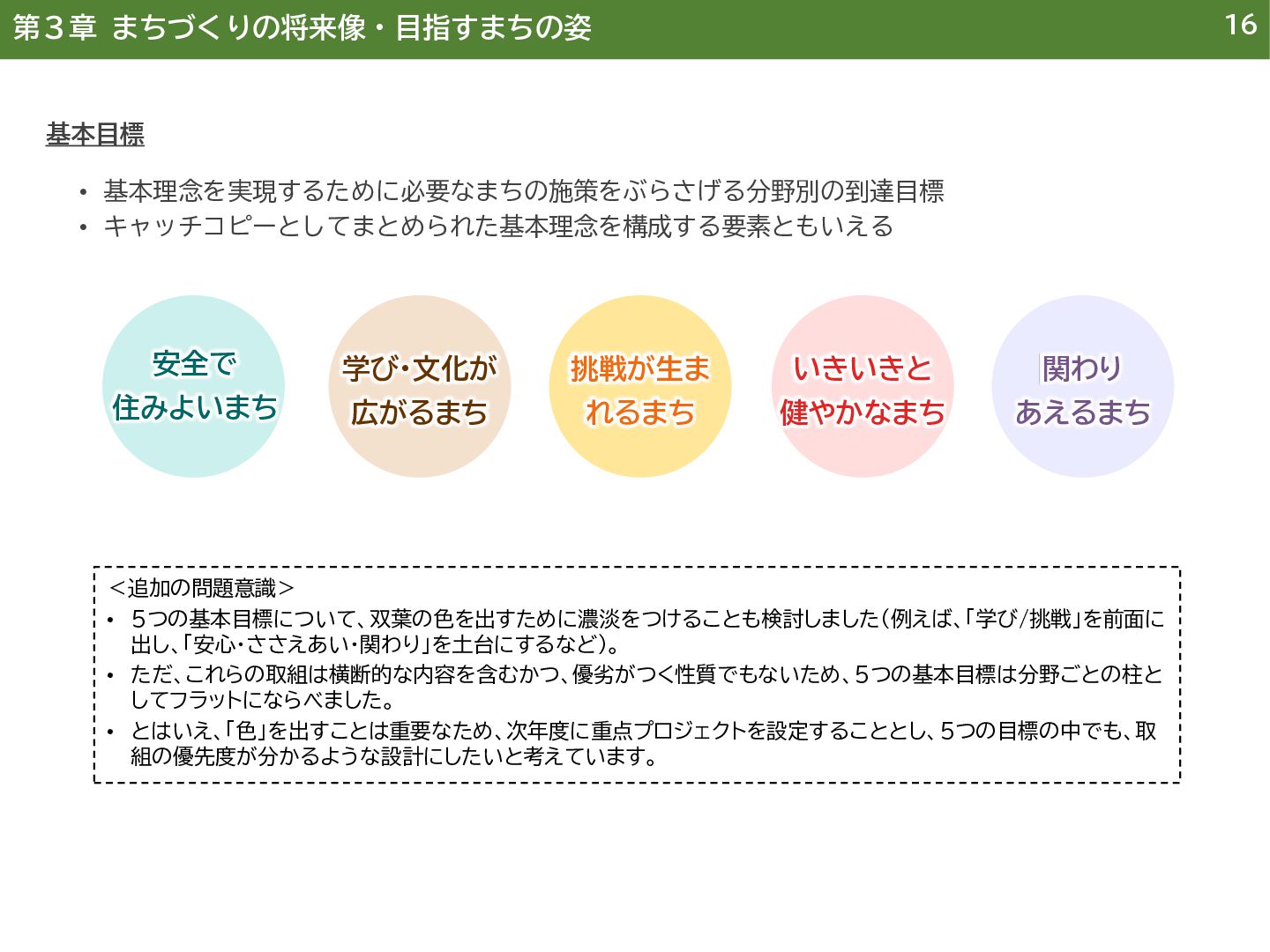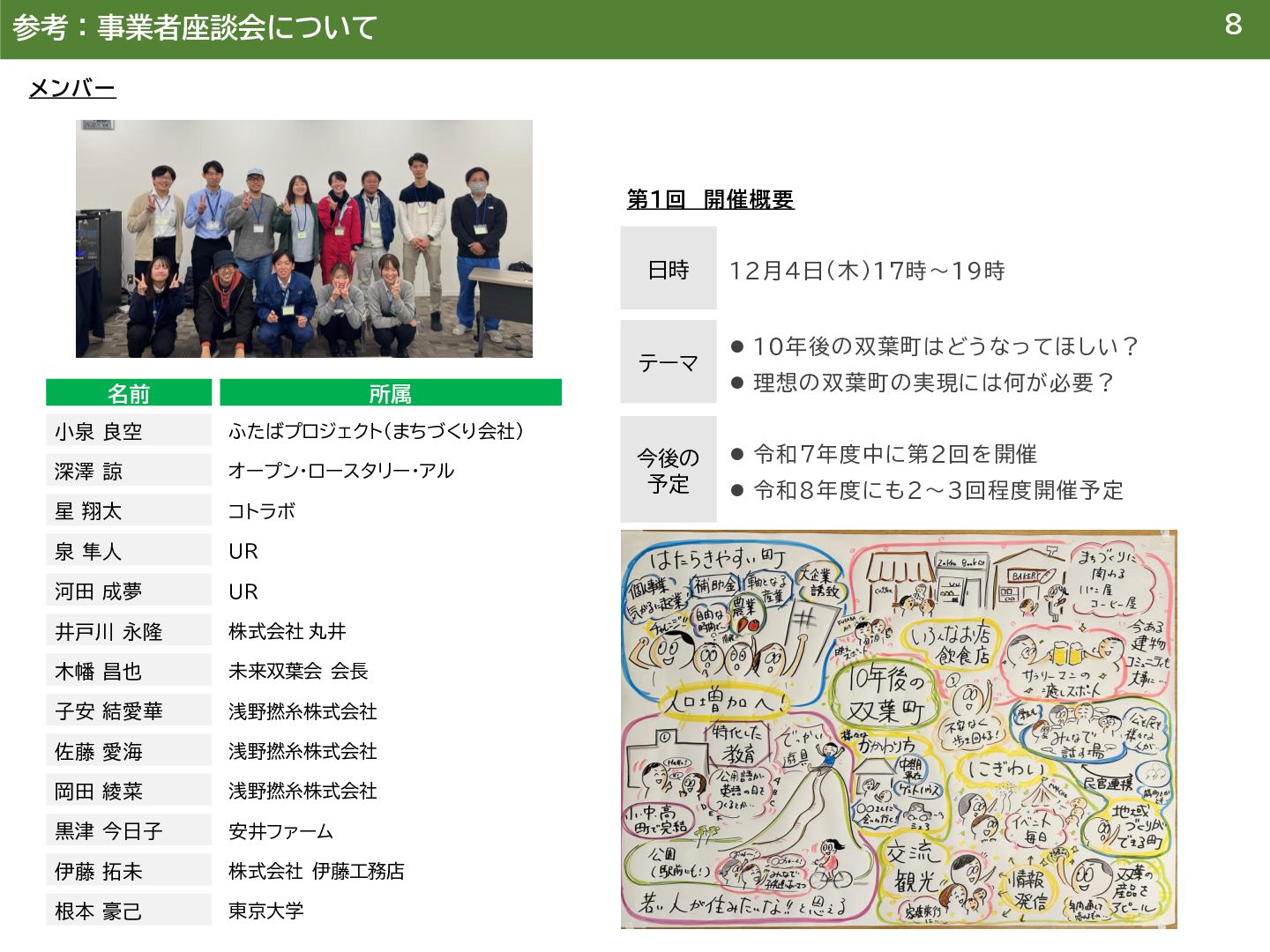 リティある取組 • 伝統・文化を残しつつ新しいまち • チャンスがあると集まる面白い人材 への支援 町 民 アンケート 今後重要度の高いまちづくり • 生活基盤整備(医療・福祉 /出産・子育て/ウェル ビーイング/生活利便性 /安全・安心) • 人への投資(コミュニティ /教育・人材育成/情報 発信・交流) • 持続可能な都市経営 ワークショップ (コミュニティ・つながり) • 価値観の近い人との出会い • 活動の発信 • 帰還に向けた支援(避難者 の視点が大事) • 移住者の定着支援 • 飲んで食べる社交場 • ご近所での支え合い • 学校を活かしたコミュニティ づくり(大人もこどもも) (起業・創業) • 個性ある様々な業種の商店を増 やし商店街を復活 • 双葉にあった事業を承継 • 個人事業主への支援 (モビリティ) • 未成年が徒歩・自転車で移動できる • 免許を返納しても移動できる (周辺自治体との連携) • 町の規模を冷静にみた連携 (歴史・文化) • 震災前の文化の継承 • 震災・原子力災害の伝承 (運動・生涯学習) • 運動・発表できる場所 (誇 り) • 自慢できる産業・産品 • 文教のまちの復活(双葉高 校の復活、F-REI家族の受 け皿、町民全員が学ぶ) 中学生 • おいしいものが食べられる(駄菓子、スイーツ、カフェ、 外国の料理、パン屋、ラーメンなど) • 楽しめる(SNS映えするデートスポット、双葉花火、異文 化交流、郡のみんなが集まれる大きな公園・体育館、こ どもの遊び場、バラ園、ペットショップ、ライブ会場、展 示場、サーキット、映画館、ショッピングモール、遊園地、 水族館、キャンプ場、温泉、ホテル) • 町民みんなで管理する花壇 • 美容(美容室、エステ、コスメショップ、エステサロン) • 教育(双葉高校の復活、大学、図書館) • 買い物(やっちゃば、本屋、花屋、雑貨店、服屋) • 町のシンボルとなるものをつくる • 大学があれば住んでいると思う • 双葉にもっと行きやすくしてほしい 事業者 町 長 • 帰還・移住しやすい環境整備 • 町外避難者への情報発信とお試し 居住・二地域居住等柔軟な施策 • 帰還者・移住者の協力 • 若手職員の活躍(アイデアの施策化) 職 員(幹事会) 社会潮流 • ふたばではじめる!~みんなで創り育てる ワクワクする未来を双葉から~ • ゼロイチタウン~みんなで創る未来~ • 町民主役のまちづくり(自分らしさ・自分ごと) • 0から1、1から10へ • 幸せな日常 • 選ばれるまち • 持続的な都市経営 • 震災・原発事故に対して最後に全町 避難指示が解除 • 震災前の街並み・建物を活かした復 興 • 双葉郡の学びの中心であった「文教 のまち」 • 清戸廹横穴、神楽等の歴史・文化 • だるま市、じゃんがら念仏祭り等の ふるさとの祭り • 海・山・川の恵まれた自然 • AI・ロボット・ドローン等の新技術・デ ジタル技術の発展 • 不安定な国際情勢、物価高を受けた 食料品、資源・エネルギーなどの経 済安全保障の重要性の高まり • インフラ老朽化に備えた持続可能な 維持管理の実現などより広範な防 災・国土強靭化 • 成長をけん引する人材育成とスター トアップの推進 • 地域資源に対する海外からの高い 評価 • 人口減少を受け止めた対応(新たな サービスや地域づくりによる豊かな 生活環境、若者や女性にも選ばれる 地方の実現) 安心な暮らし 不可欠なサービスの提供 /持続可能な都市経営 挑戦と活躍 楽しく・幸せな日常、起業・創業、新技術に挑戦 挑戦・活躍を支える教育・人材育成 双葉らしさ 自然・歴史・文化・街並みを 活かす • 教育で差別化(英語、プログラミング、 町内仕事学習、通学用モビリティなど) • VR・AI,F-REIなど軸となる産業 • 自由な働き方(小商い、兼業・副業) • スタートアップしやすい • 双葉町で循環する産業づくり • こどもで賑わう • 歩くことが楽しい町 • 言葉を交わし合う町 • 中長期間滞在できる • 震災・原発のまちとの ギャップ(安全・楽しさ) • 家族旅行の行き先になる • 住まなくても関われる • 住民・プレイヤーがまち づくりに参加できる • 企業・個人がチャレンジ できる • 小さいチャレンジ • みんなで話し合える • 双葉の資源(ストック、人) の活用 • 双葉らしいお土産 • 休める町・癒される町 • 外から来る理由のある町 • 映えるスポット • 海に気軽に行ける 14