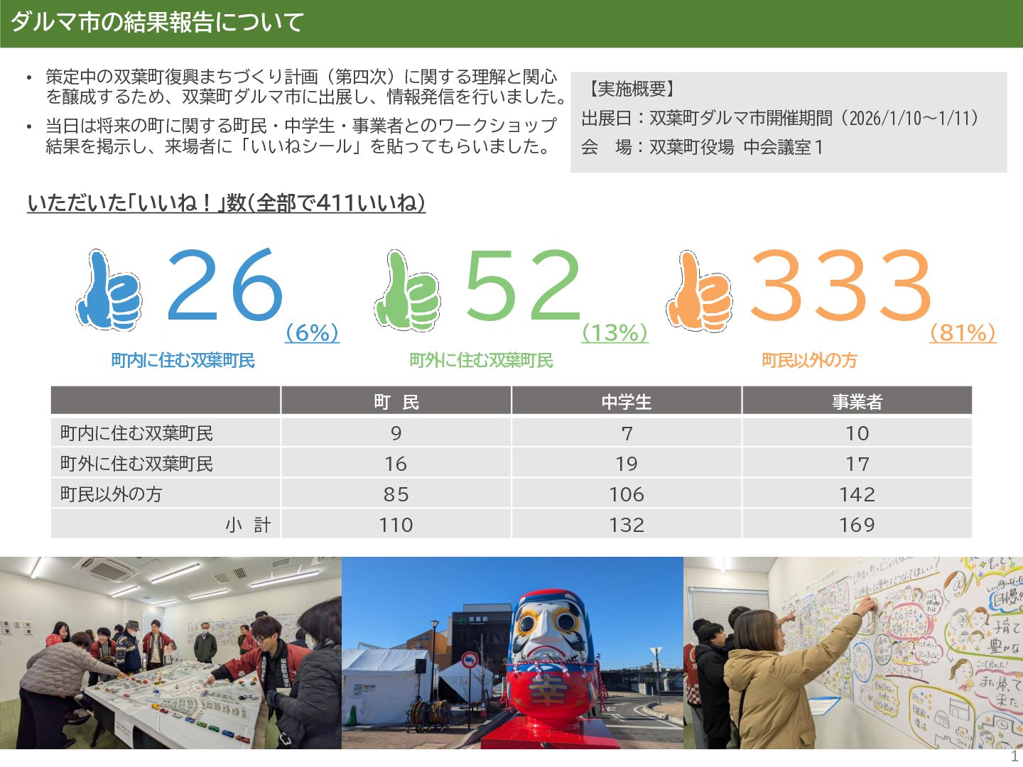1. ダルマ市の結果報告について 1 • 策定中の双葉町復興まちづくり計画(第四次)に関する理解と関心 を醸成するため、双葉町ダルマ市に出展し、情報発信を行いました。 • 当日は将来の町に関する町民・中学生・事業者とのワークショップ 結果を掲示し、来場者に「いいねシール」を貼ってもらいました。 【実施概要】 出展日:双葉町ダルマ市開催期間(2026/1/10~1/11)