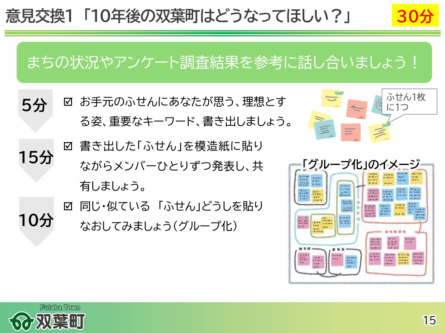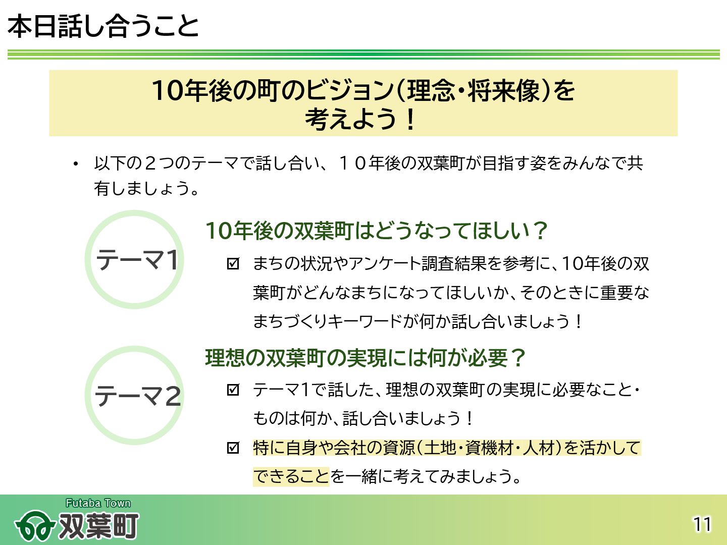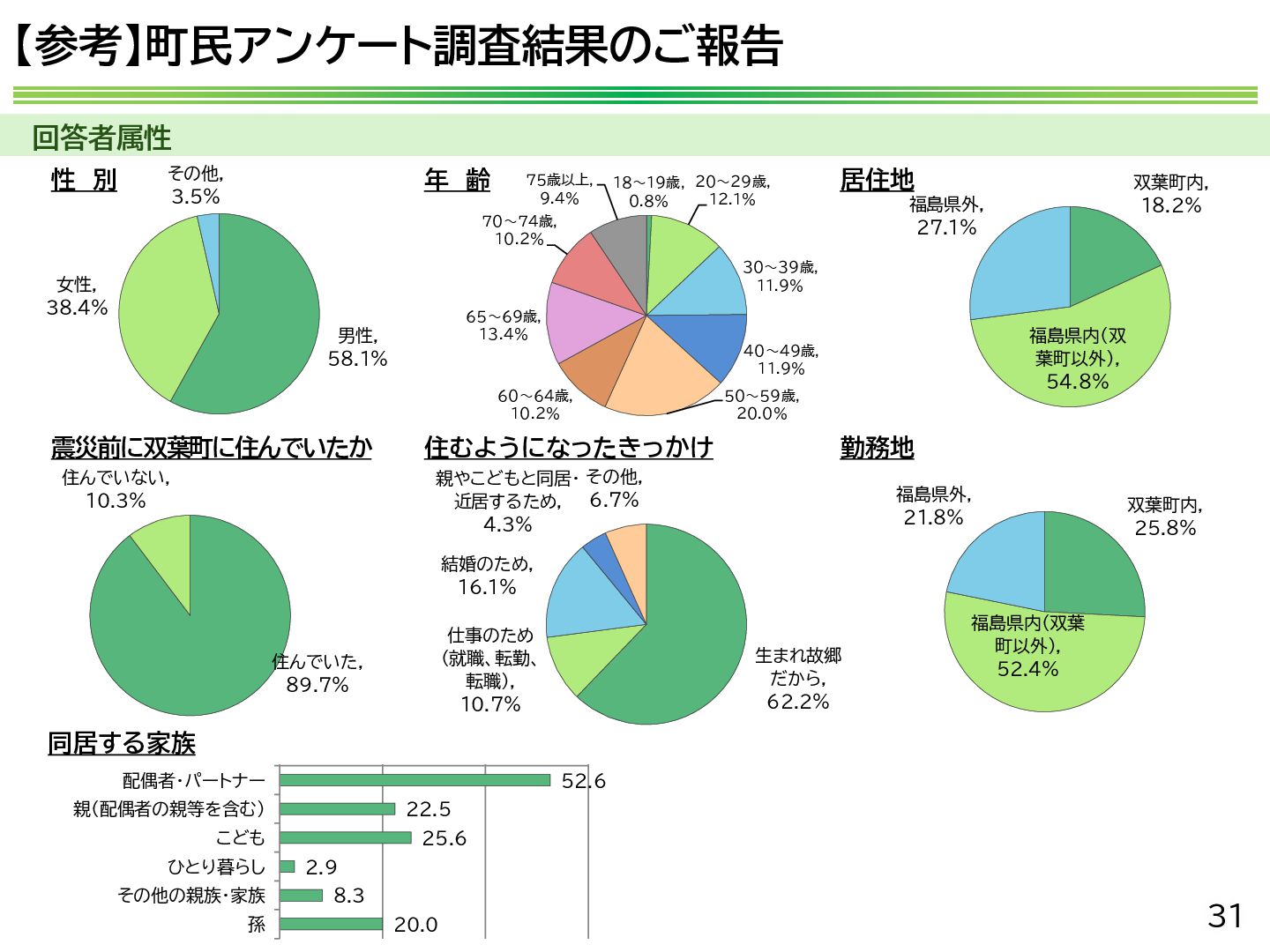 50~59歳, 20.0% 60~64歳, 10.2% 65~69歳, 13.4% 70~74歳, 10.2% 75歳以上, 9.4% 52.6 22.5 25.6 2.9 8.3 20.0 0% 20% 40% 60% 配偶者・パートナー 親(配偶者の親等を含む) こども ひとり暮らし その他の親族・家族 孫 双葉町内, 25.8% 福島県内(双葉 町以外), 52.4% 福島県外, 21.8% 生まれ故郷 だから, 62.2% 仕事のため (就職、転勤、 転職), 10.7% 結婚のため, 16.1% 親やこどもと同居・ 近居するため, 4.3% その他, 6.7% 住んでいた, 89.7% 住んでいない, 10.3% 双葉町内, 18.2% 福島県内(双 葉町以外), 54.8% 福島県外, 27.1% 男性, 58.1% 女性, 38.4% その他, 3.5% 性 別 年 齢 居住地 震災前に双葉町に住んでいたか 住むようになったきっかけ 勤務地 同居する家族 【参考】町民アンケート調査結果のご報告