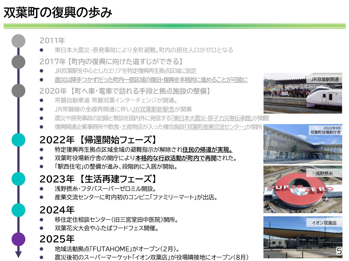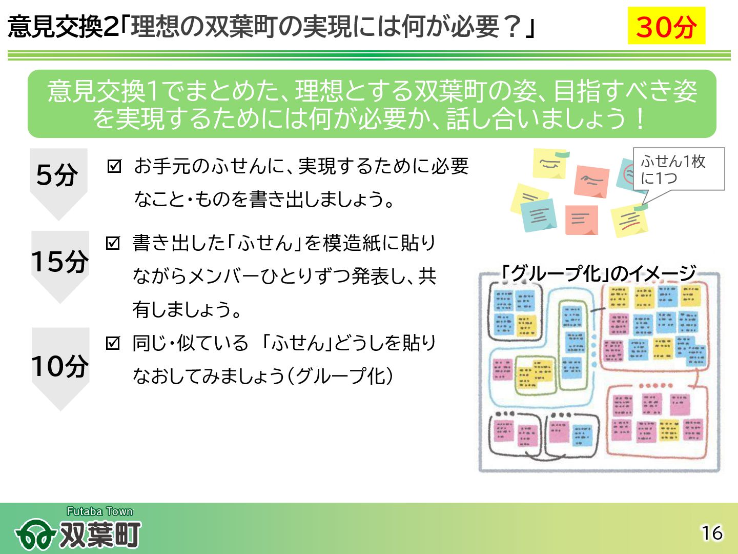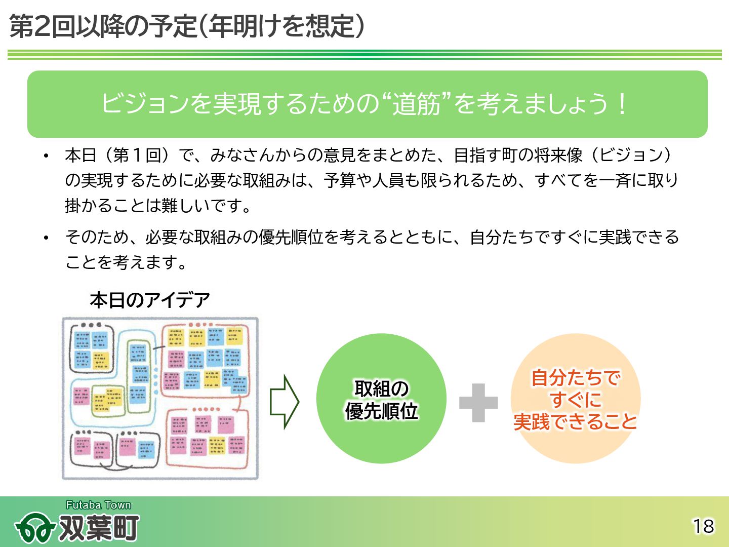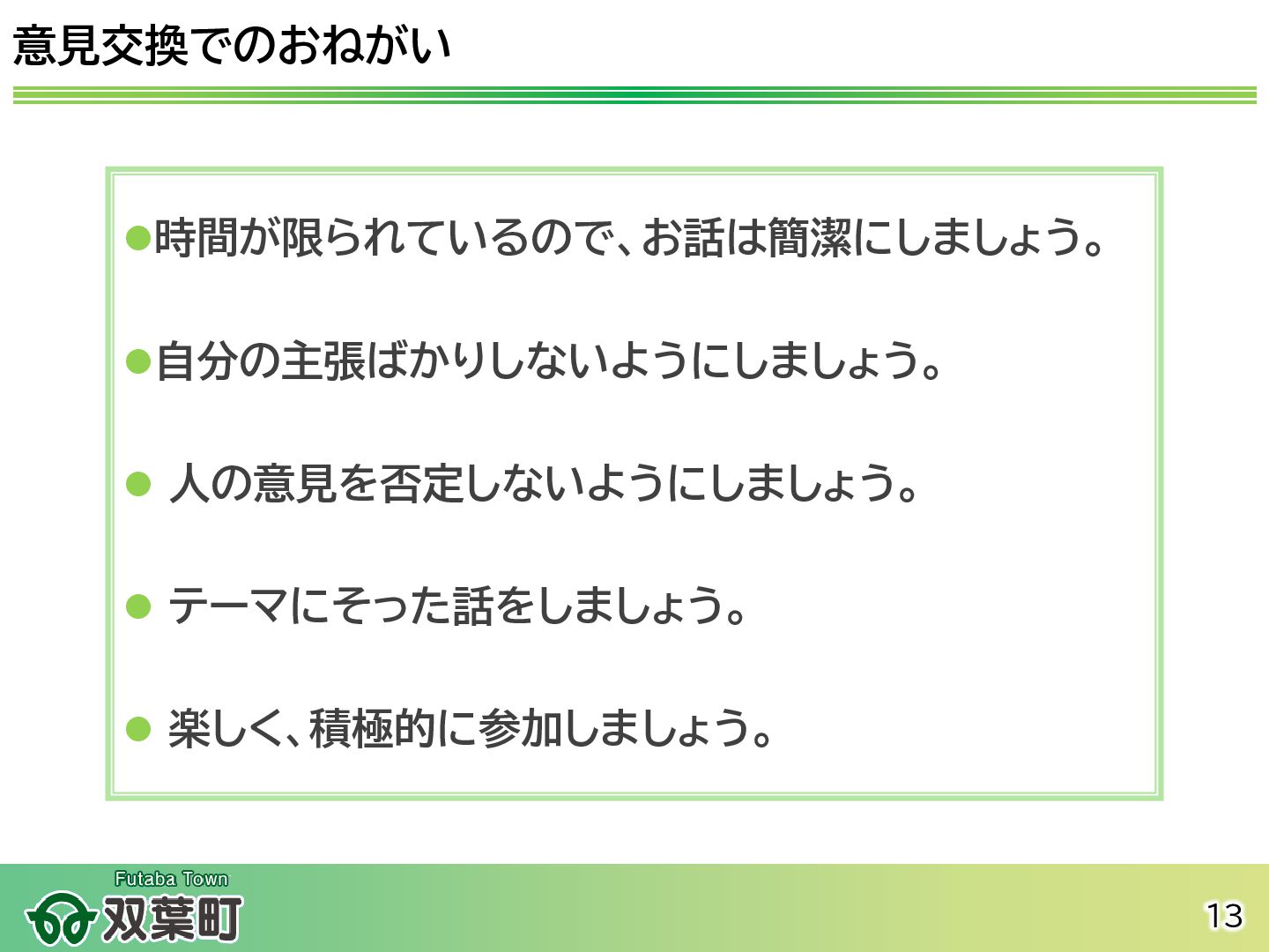 50~59歳, 20.0% 60~64歳, 10.2% 65~69歳, 13.4% 70~74歳, 10.2% 75歳以上, 9.4% 52.6 22.5 25.6 2.9 8.3 20.0 0% 20% 40% 60% 配偶者・パートナー 親(配偶者の親等を含む) こども ひとり暮らし その他の親族・家族 孫 双葉町内, 25.8% 福島県内(双葉 町以外), 52.4% 福島県外, 21.8% 生まれ故郷 だから, 62.2% 仕事のため (就職、転勤、 転職), 10.7% 結婚のため, 16.1% 親やこどもと同居・ 近居するため, 4.3% その他, 6.7% 住んでいた, 89.7% 住んでいない, 10.3% 双葉町内, 18.2% 福島県内(双 葉町以外), 54.8% 福島県外, 27.1% 男性, 58.1% 女性, 38.4% その他, 3.5% 性 別 年 齢 居住地 震災前に双葉町に住んでいたか 住むようになったきっかけ 勤務地 同居する家族 【参考】町民アンケート調査結果のご報告