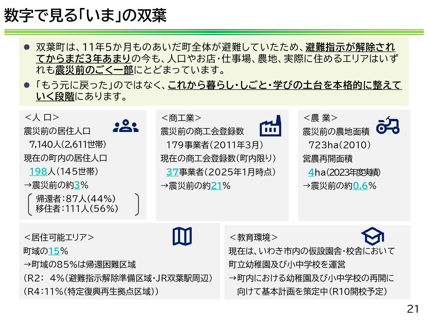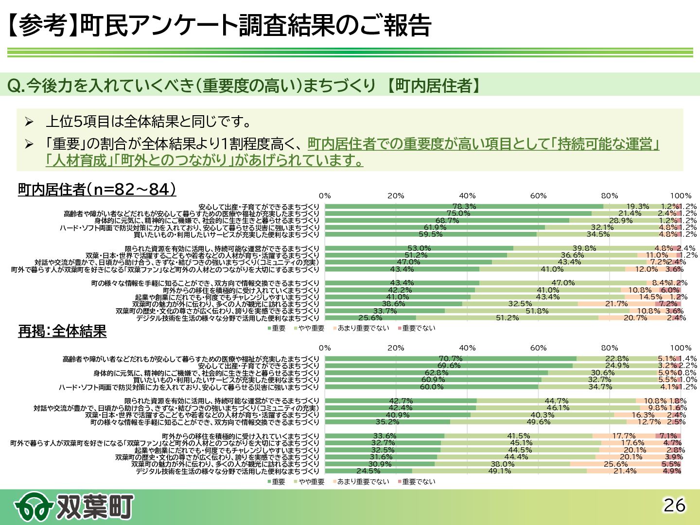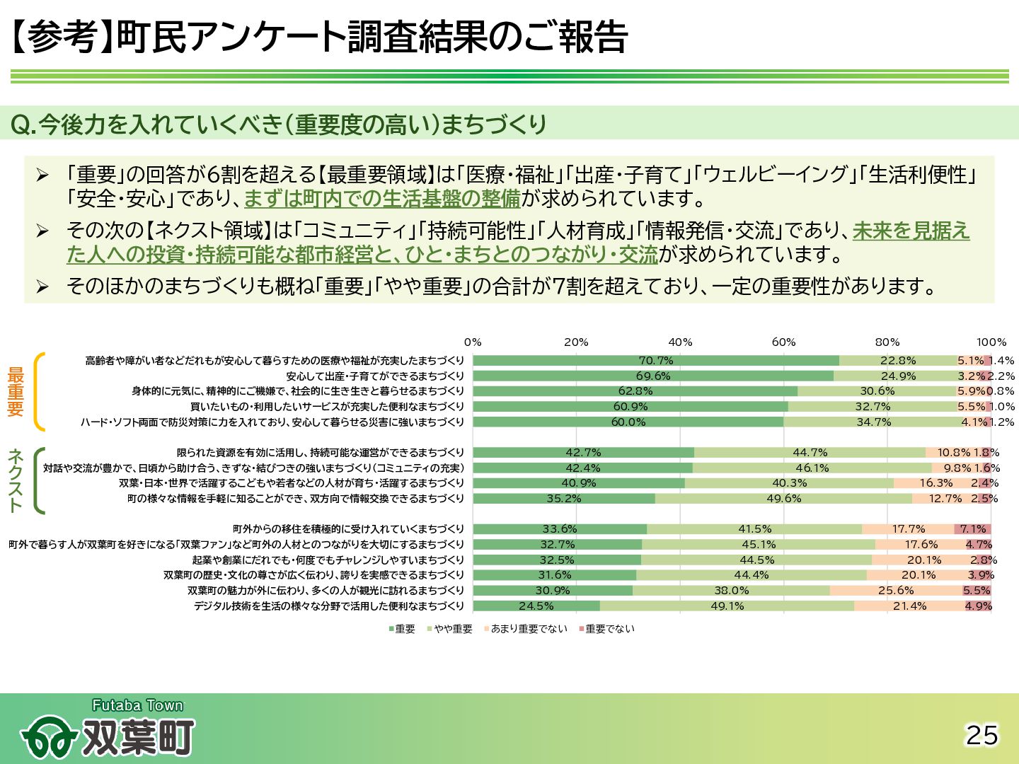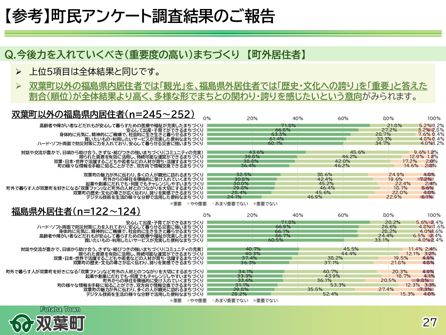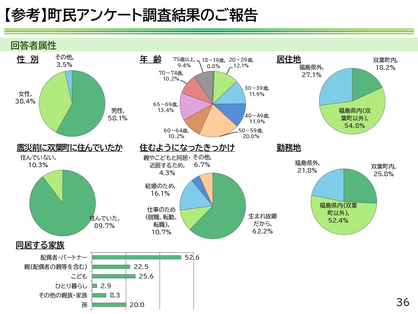 50~59歳, 20.0% 60~64歳, 10.2% 65~69歳, 13.4% 70~74歳, 10.2% 75歳以上, 9.4% 52.6 22.5 25.6 2.9 8.3 20.0 0% 20% 40% 60% 配偶者・パートナー 親(配偶者の親等を含む) こども ひとり暮らし その他の親族・家族 孫 双葉町内, 25.8% 福島県内(双葉 町以外), 52.4% 福島県外, 21.8% 生まれ故郷 だから, 62.2% 仕事のため (就職、転勤、 転職), 10.7% 結婚のため, 16.1% 親やこどもと同居・ 近居するため, 4.3% その他, 6.7% 住んでいた, 89.7% 住んでいない, 10.3% 双葉町内, 18.2% 福島県内(双 葉町以外), 54.8% 福島県外, 27.1% 男性, 58.1% 女性, 38.4% その他, 3.5% 性 別 年 齢 居住地 震災前に双葉町に住んでいたか 住むようになったきっかけ 勤務地 同居する家族 【参考】町民アンケート調査結果のご報告