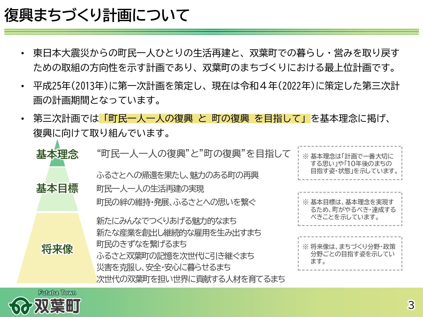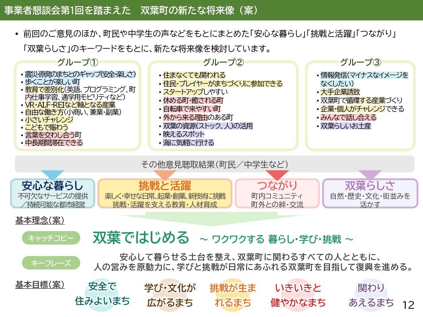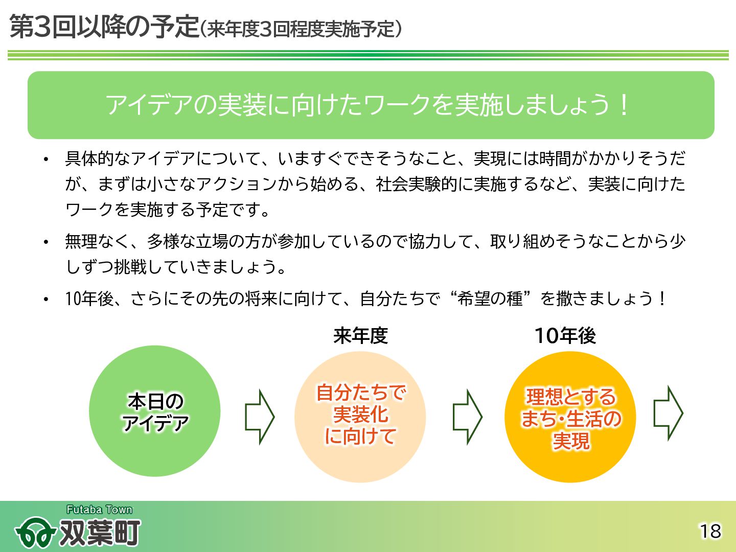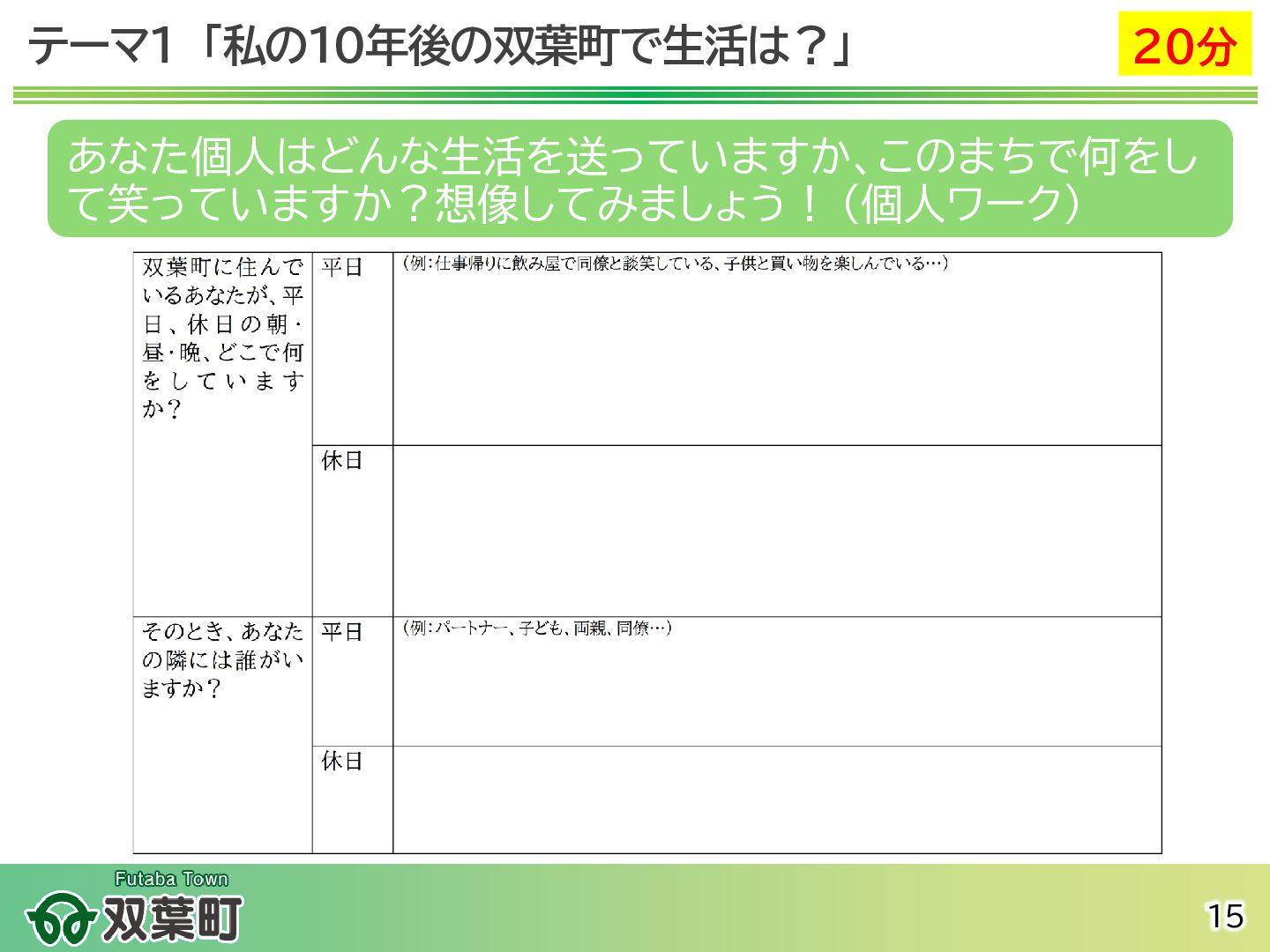 50~59歳, 20.0% 60~64歳, 10.2% 65~69歳, 13.4% 70~74歳, 10.2% 75歳以上, 9.4% 52.6 22.5 25.6 2.9 8.3 20.0 0% 20% 40% 60% 配偶者・パートナー 親(配偶者の親等を含む) こども ひとり暮らし その他の親族・家族 孫 双葉町内, 25.8% 福島県内(双葉 町以外), 52.4% 福島県外, 21.8% 生まれ故郷 だから, 62.2% 仕事のため (就職、転勤、 転職), 10.7% 結婚のため, 16.1% 親やこどもと同居・ 近居するため, 4.3% その他, 6.7% 住んでいた, 89.7% 住んでいない, 10.3% 双葉町内, 18.2% 福島県内(双 葉町以外), 54.8% 福島県外, 27.1% 男性, 58.1% 女性, 38.4% その他, 3.5% 性 別 年 齢 居住地 震災前に双葉町に住んでいたか 住むようになったきっかけ 勤務地 同居する家族 【参考】町民アンケート調査結果のご報告
