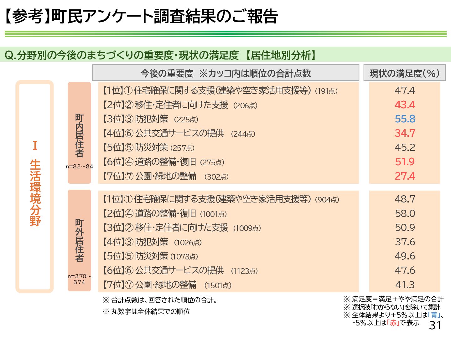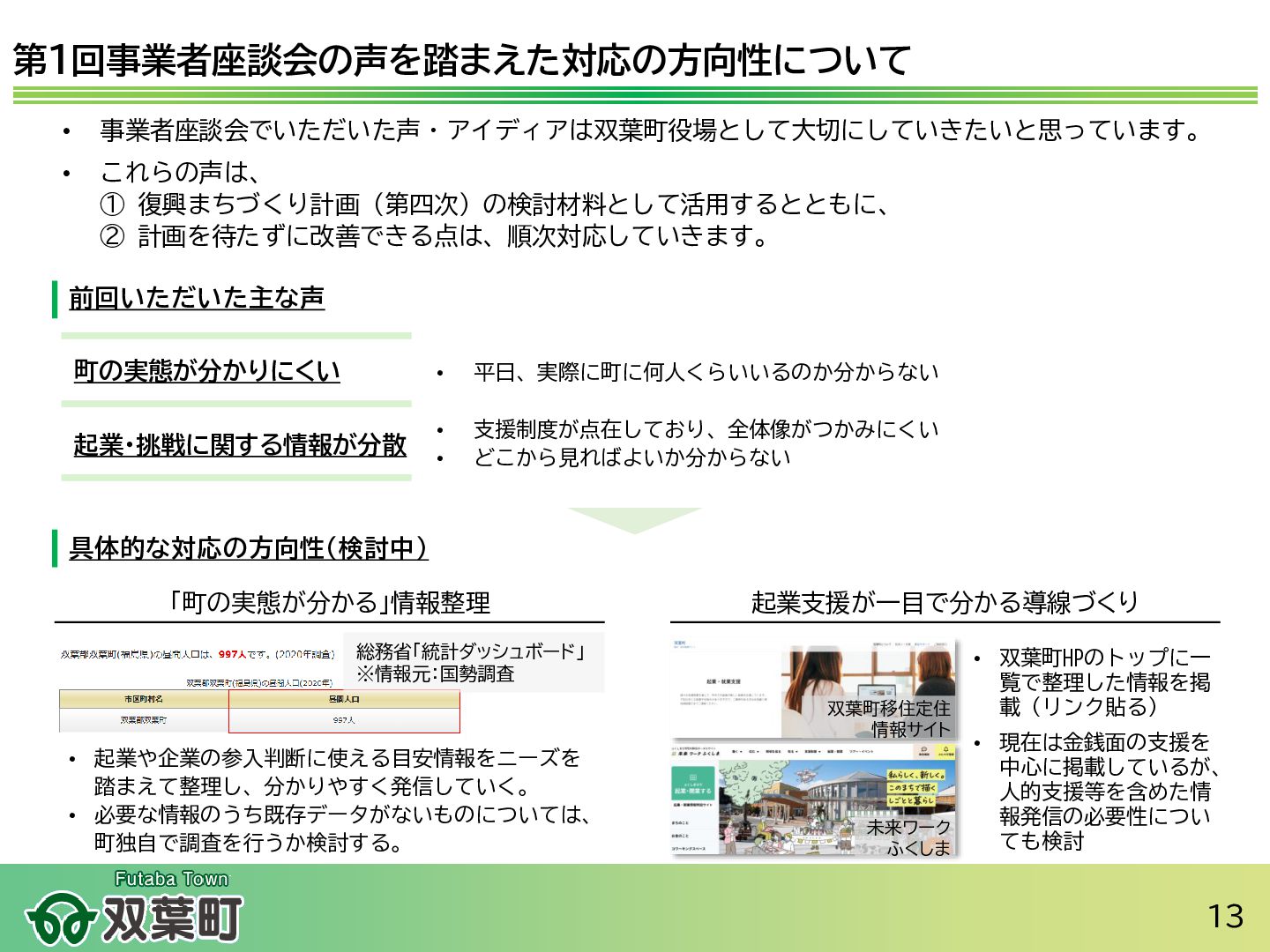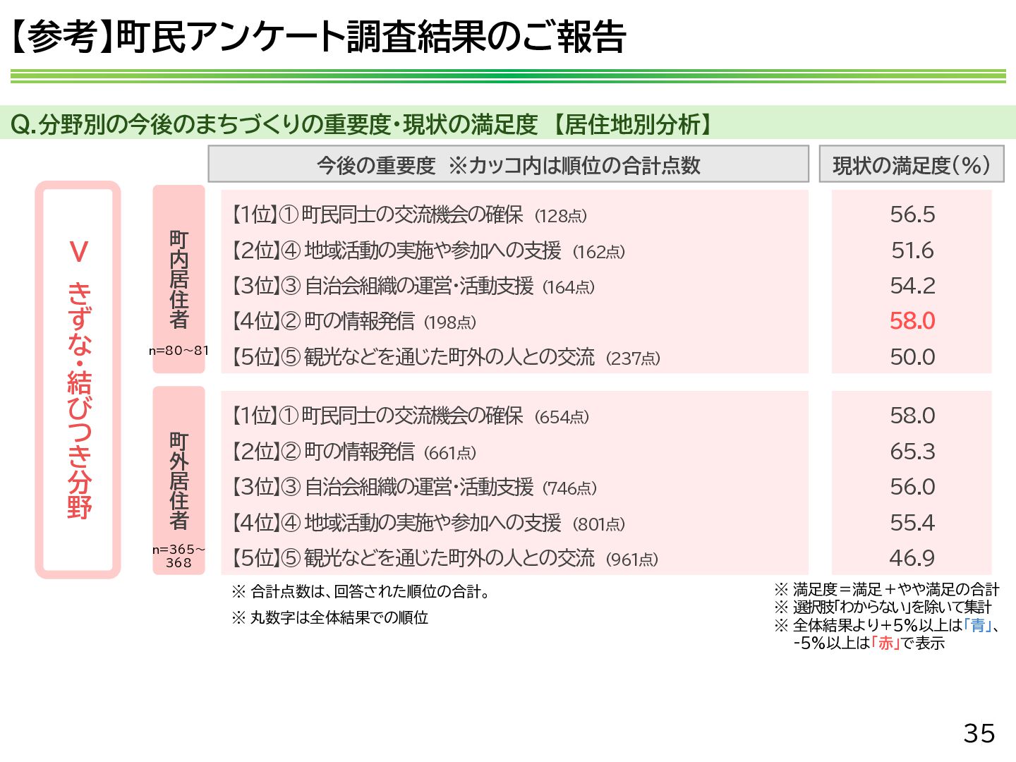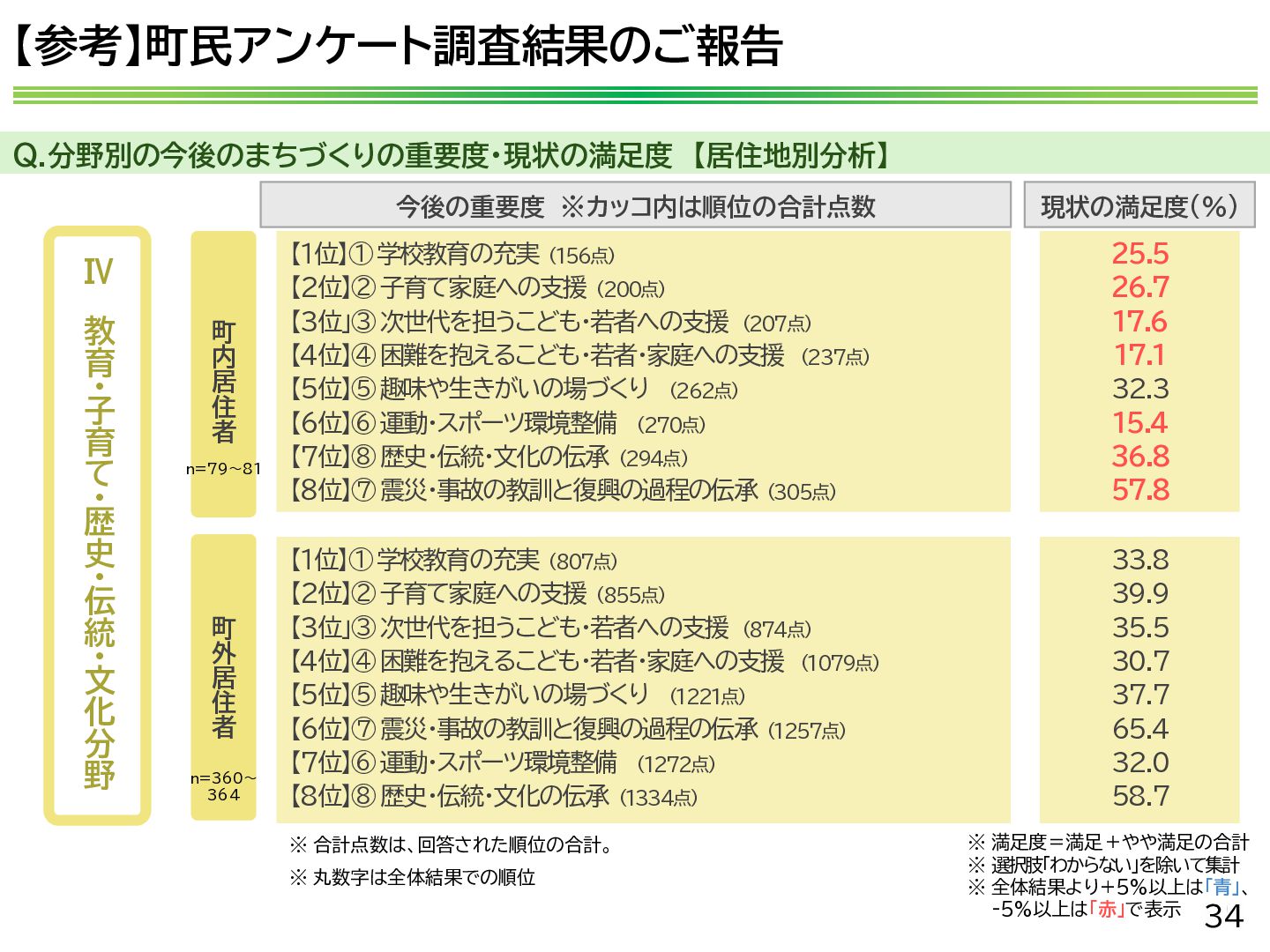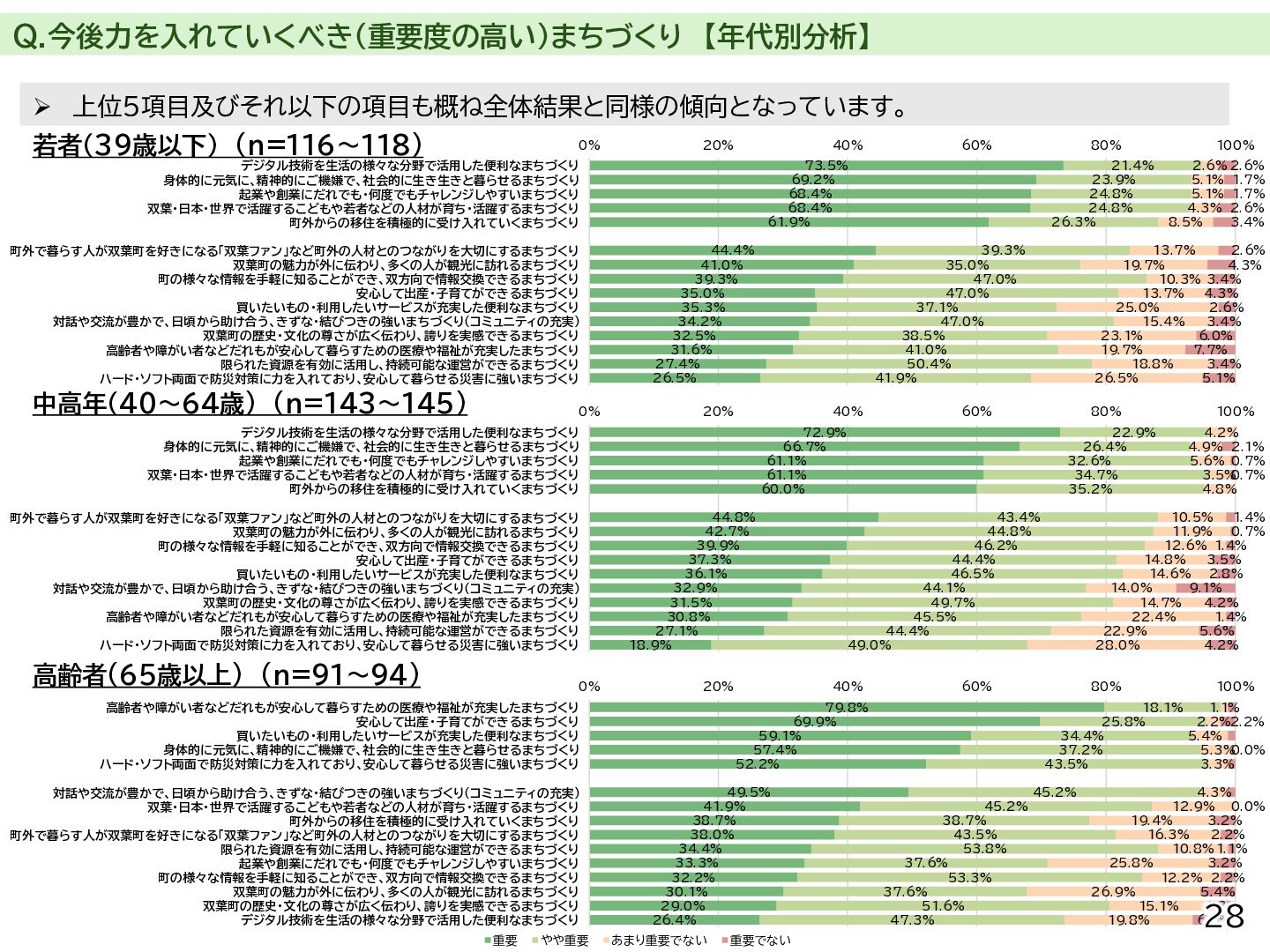 50~59歳, 20.0% 60~64歳, 10.2% 65~69歳, 13.4% 70~74歳, 10.2% 75歳以上, 9.4% 52.6 22.5 25.6 2.9 8.3 20.0 0% 20% 40% 60% 配偶者・パートナー 親(配偶者の親等を含む) こども ひとり暮らし その他の親族・家族 孫 双葉町内, 25.8% 福島県内(双葉 町以外), 52.4% 福島県外, 21.8% 生まれ故郷 だから, 62.2% 仕事のため (就職、転勤、 転職), 10.7% 結婚のため, 16.1% 親やこどもと同居・ 近居するため, 4.3% その他, 6.7% 住んでいた, 89.7% 住んでいない, 10.3% 双葉町内, 18.2% 福島県内(双 葉町以外), 54.8% 福島県外, 27.1% 男性, 58.1% 女性, 38.4% その他, 3.5% 性 別 年 齢 居住地 震災前に双葉町に住んでいたか 住むようになったきっかけ 勤務地 同居する家族 【参考】町民アンケート調査結果のご報告