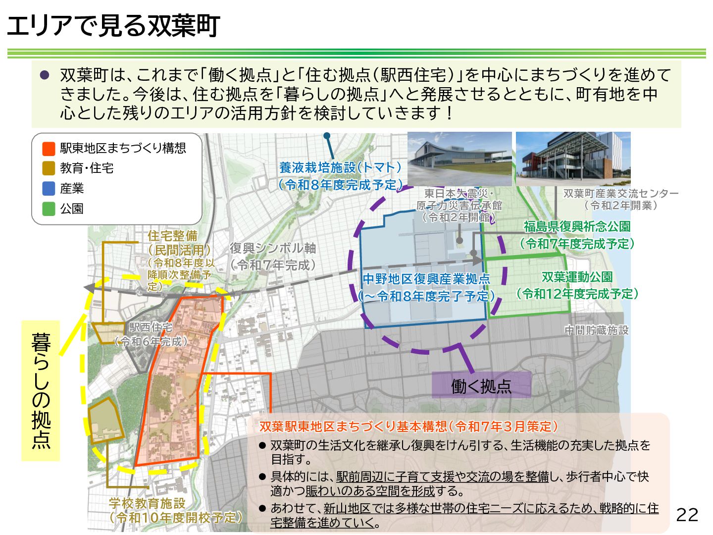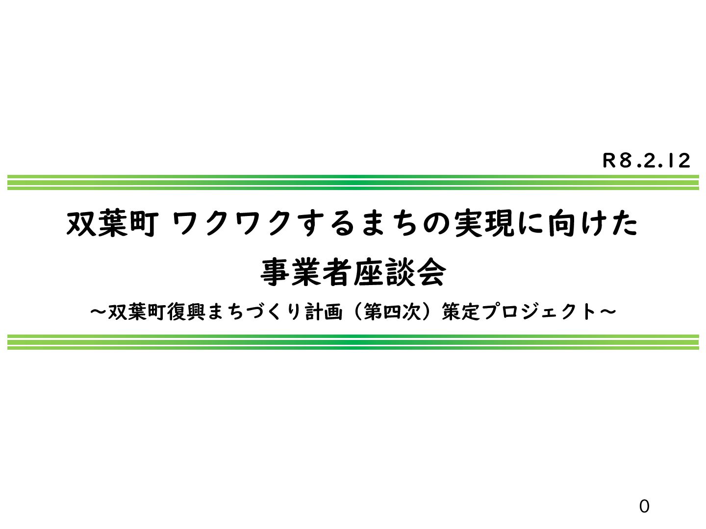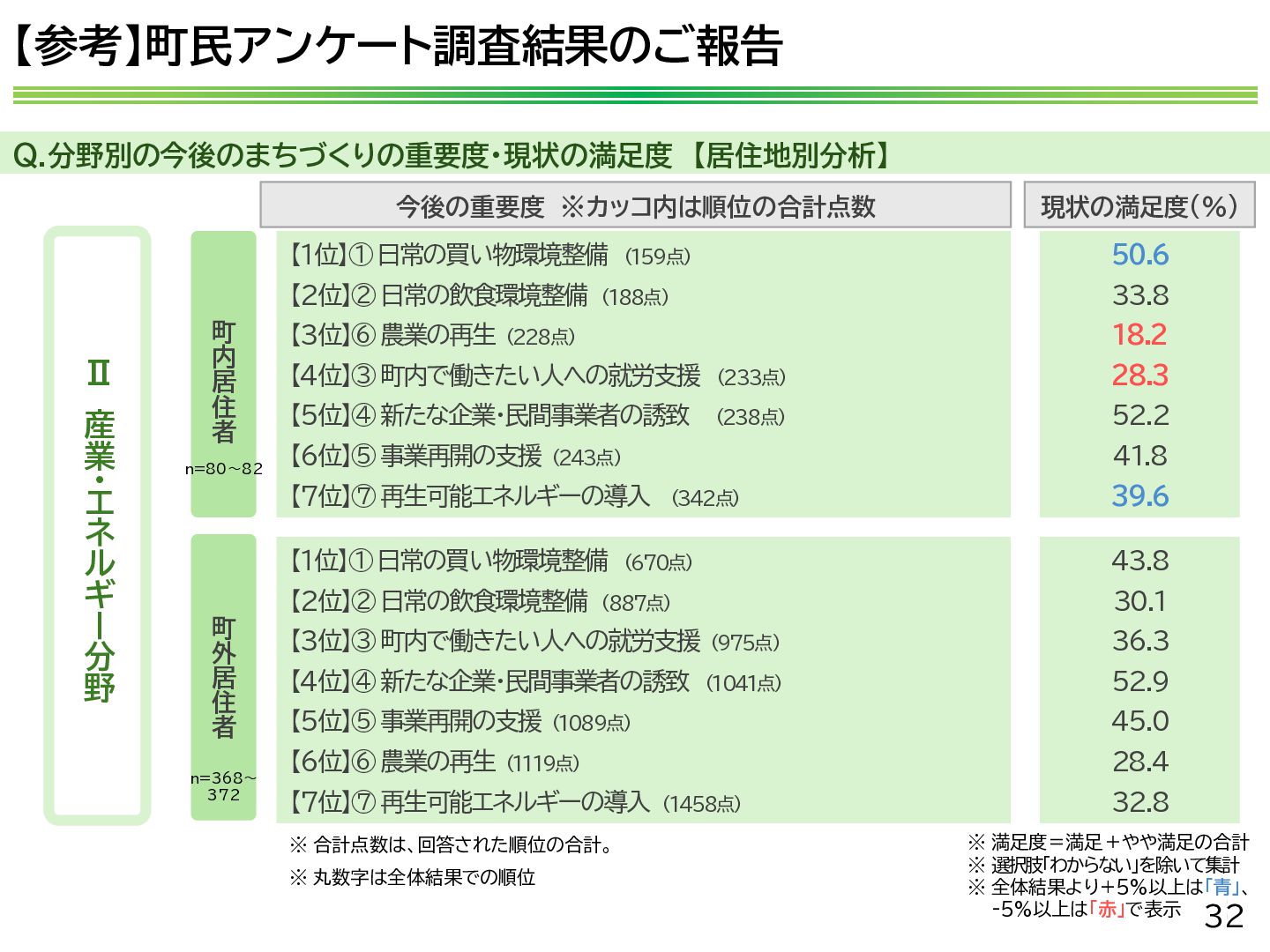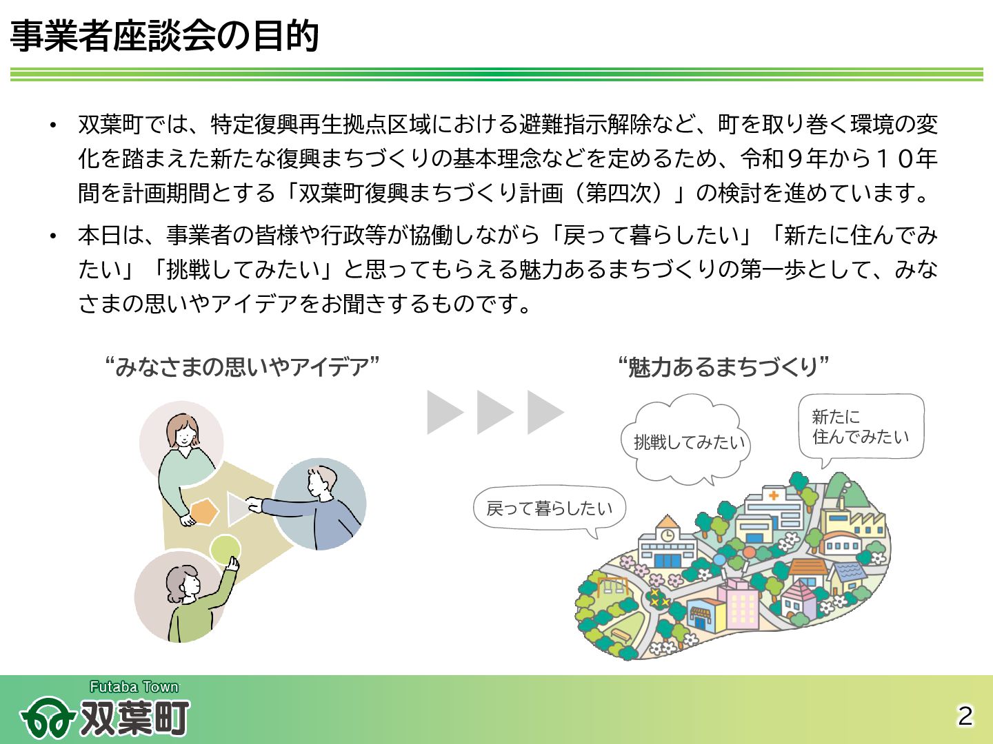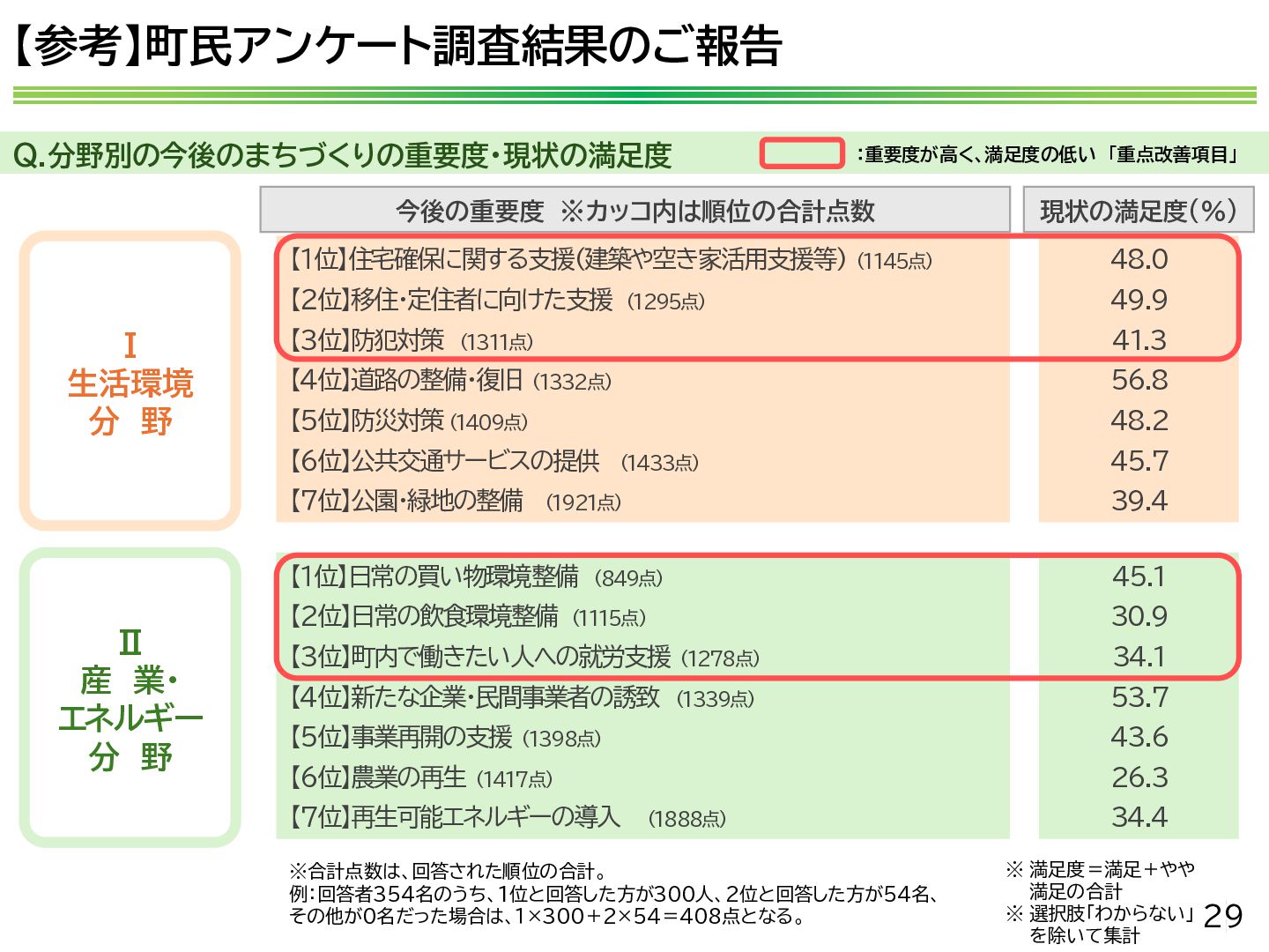 50~59歳, 20.0% 60~64歳, 10.2% 65~69歳, 13.4% 70~74歳, 10.2% 75歳以上, 9.4% 52.6 22.5 25.6 2.9 8.3 20.0 0% 20% 40% 60% 配偶者・パートナー 親(配偶者の親等を含む) こども ひとり暮らし その他の親族・家族 孫 双葉町内, 25.8% 福島県内(双葉 町以外), 52.4% 福島県外, 21.8% 生まれ故郷 だから, 62.2% 仕事のため (就職、転勤、 転職), 10.7% 結婚のため, 16.1% 親やこどもと同居・ 近居するため, 4.3% その他, 6.7% 住んでいた, 89.7% 住んでいない, 10.3% 双葉町内, 18.2% 福島県内(双 葉町以外), 54.8% 福島県外, 27.1% 男性, 58.1% 女性, 38.4% その他, 3.5% 性 別 年 齢 居住地 震災前に双葉町に住んでいたか 住むようになったきっかけ 勤務地 同居する家族 【参考】町民アンケート調査結果のご報告