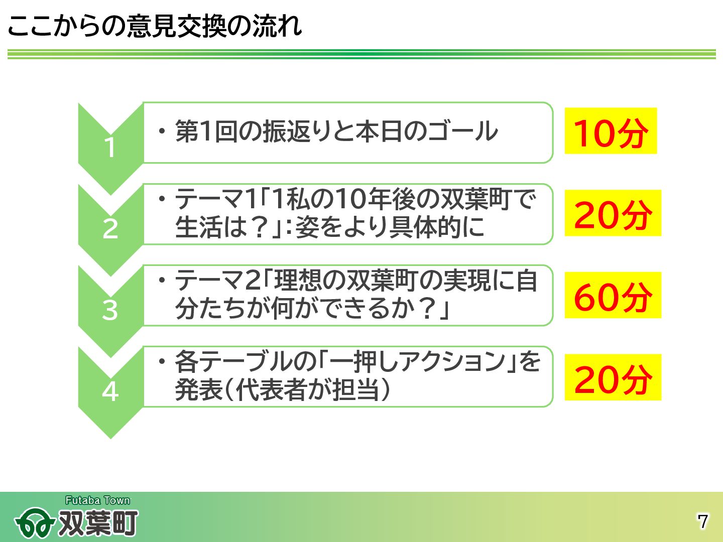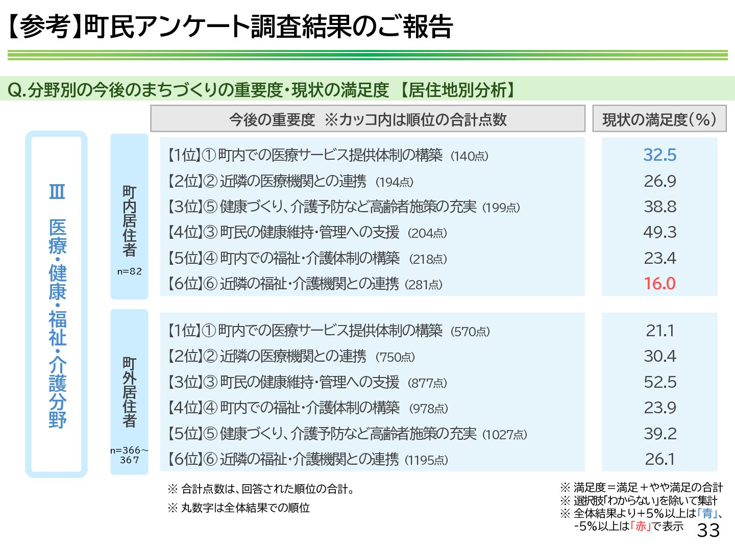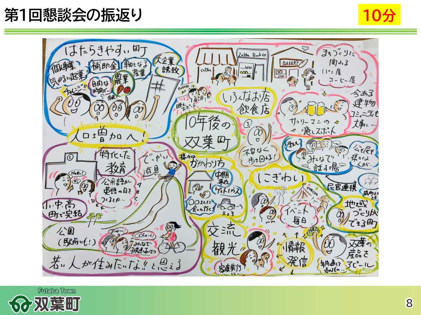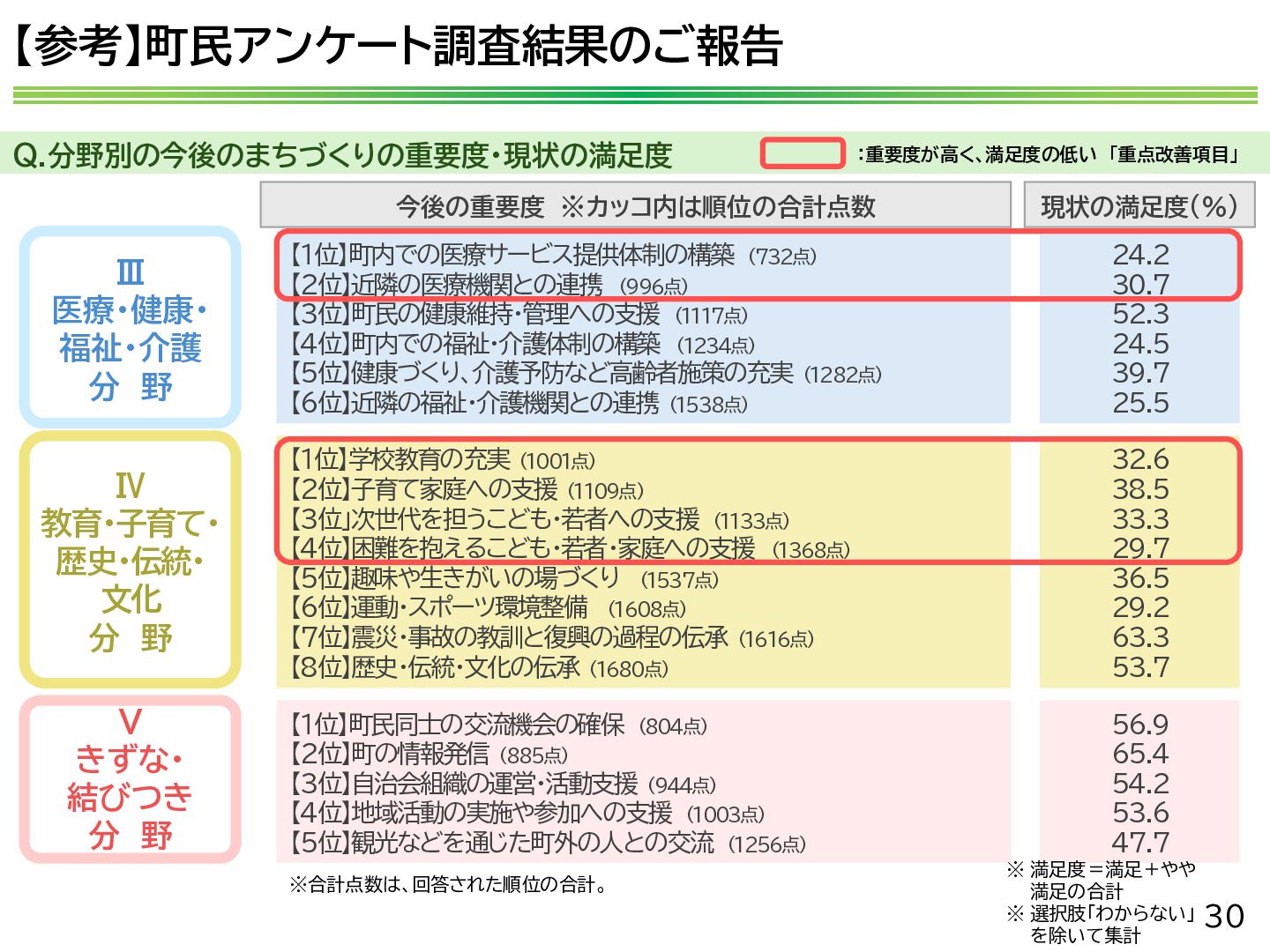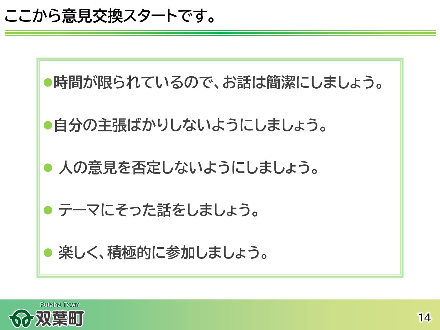 50~59歳, 20.0% 60~64歳, 10.2% 65~69歳, 13.4% 70~74歳, 10.2% 75歳以上, 9.4% 52.6 22.5 25.6 2.9 8.3 20.0 0% 20% 40% 60% 配偶者・パートナー 親(配偶者の親等を含む) こども ひとり暮らし その他の親族・家族 孫 双葉町内, 25.8% 福島県内(双葉 町以外), 52.4% 福島県外, 21.8% 生まれ故郷 だから, 62.2% 仕事のため (就職、転勤、 転職), 10.7% 結婚のため, 16.1% 親やこどもと同居・ 近居するため, 4.3% その他, 6.7% 住んでいた, 89.7% 住んでいない, 10.3% 双葉町内, 18.2% 福島県内(双 葉町以外), 54.8% 福島県外, 27.1% 男性, 58.1% 女性, 38.4% その他, 3.5% 性 別 年 齢 居住地 震災前に双葉町に住んでいたか 住むようになったきっかけ 勤務地 同居する家族 【参考】町民アンケート調査結果のご報告