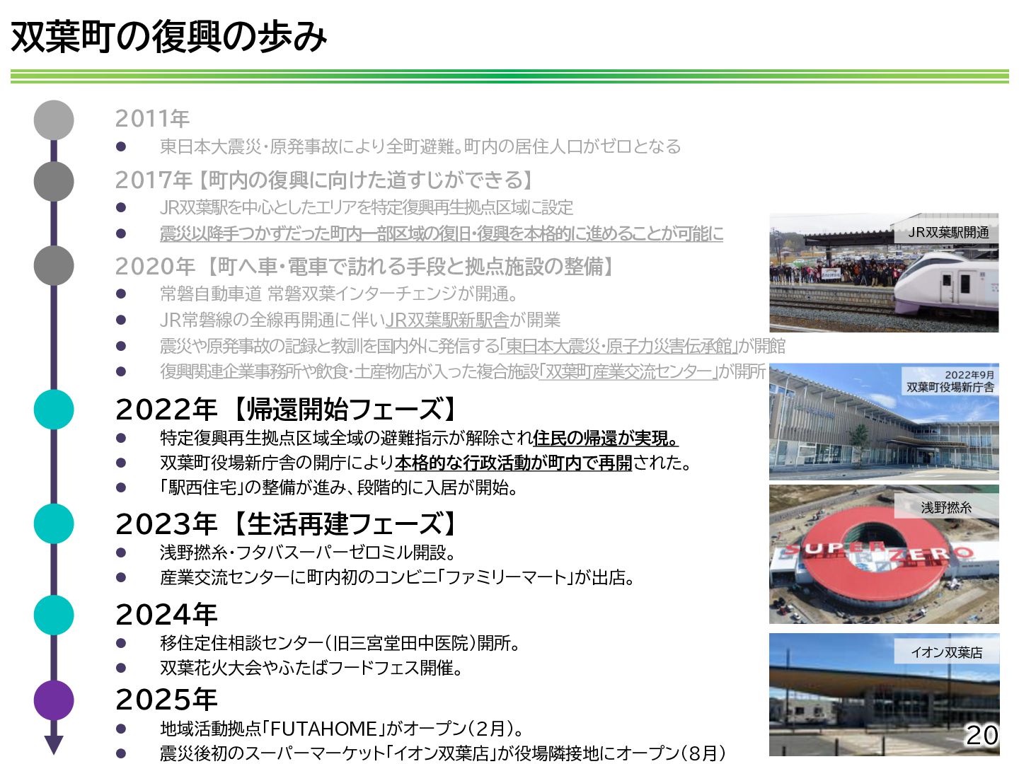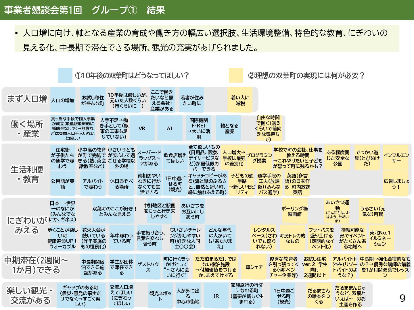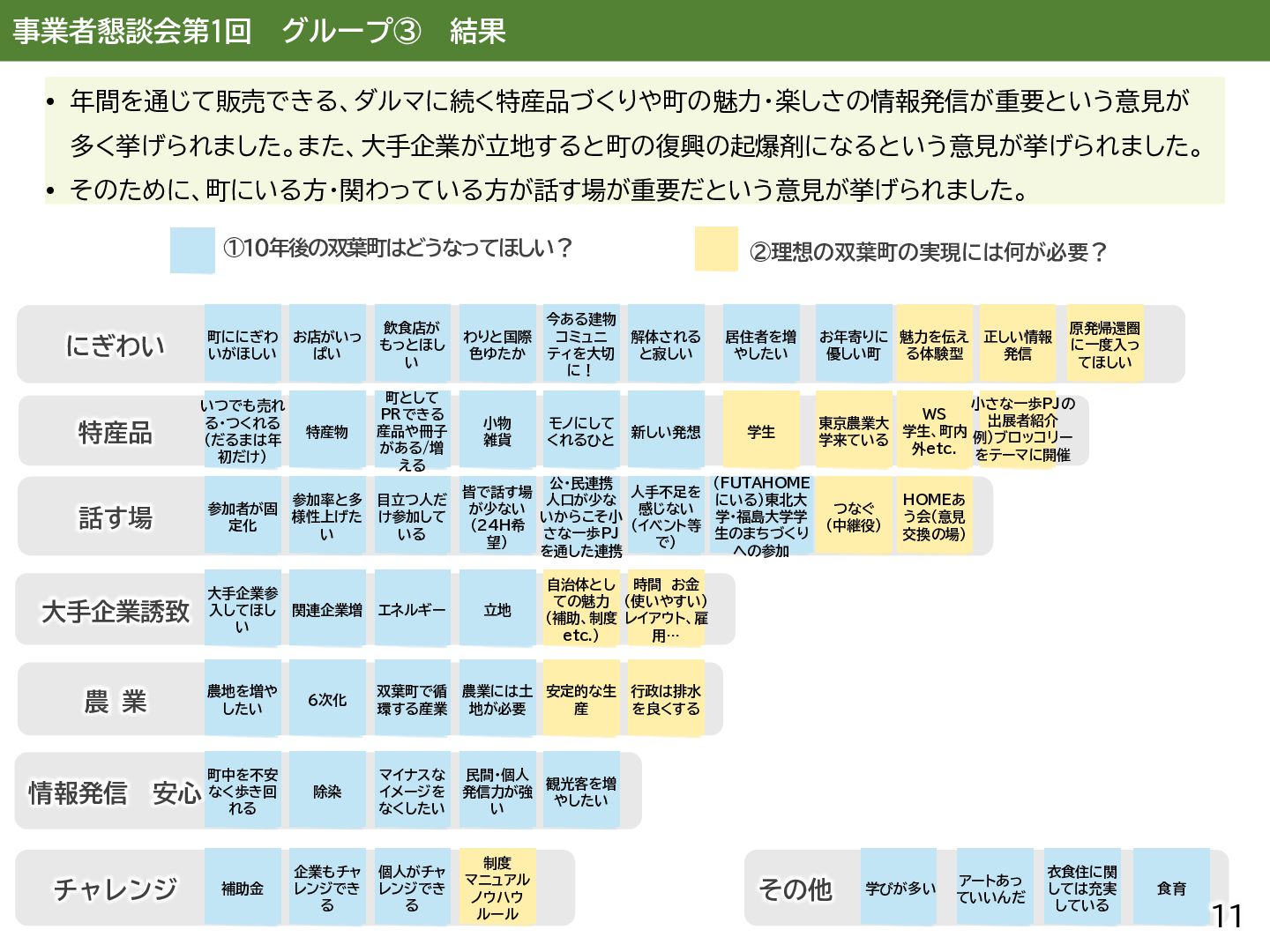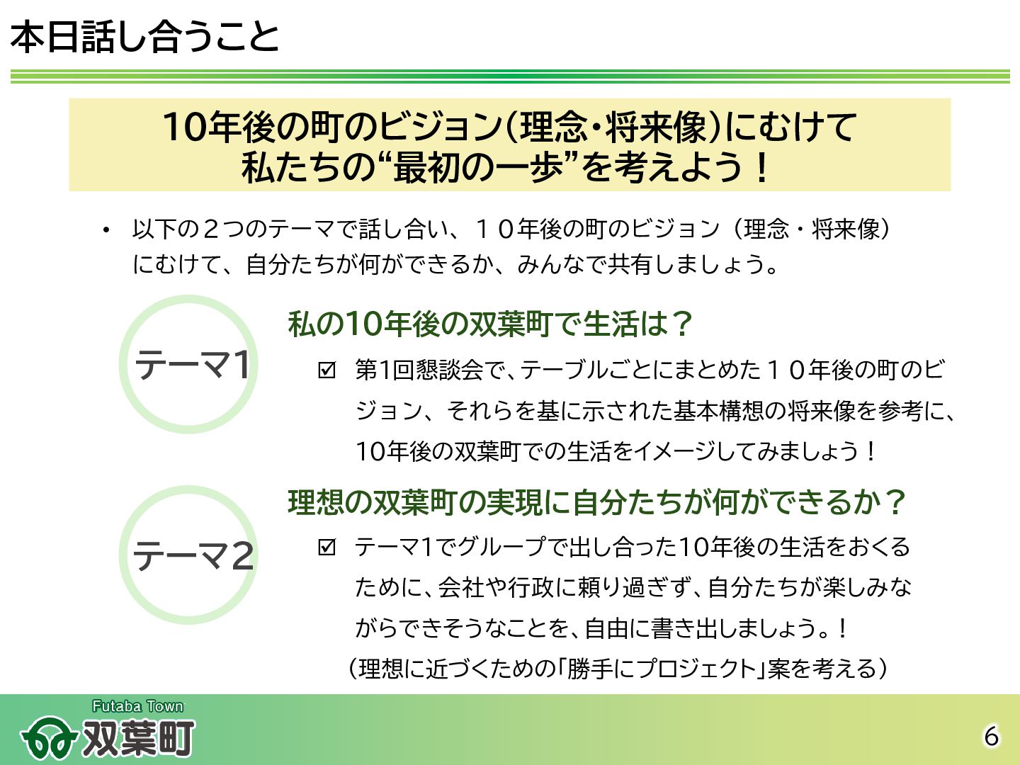 50~59歳, 20.0% 60~64歳, 10.2% 65~69歳, 13.4% 70~74歳, 10.2% 75歳以上, 9.4% 52.6 22.5 25.6 2.9 8.3 20.0 0% 20% 40% 60% 配偶者・パートナー 親(配偶者の親等を含む) こども ひとり暮らし その他の親族・家族 孫 双葉町内, 25.8% 福島県内(双葉 町以外), 52.4% 福島県外, 21.8% 生まれ故郷 だから, 62.2% 仕事のため (就職、転勤、 転職), 10.7% 結婚のため, 16.1% 親やこどもと同居・ 近居するため, 4.3% その他, 6.7% 住んでいた, 89.7% 住んでいない, 10.3% 双葉町内, 18.2% 福島県内(双 葉町以外), 54.8% 福島県外, 27.1% 男性, 58.1% 女性, 38.4% その他, 3.5% 性 別 年 齢 居住地 震災前に双葉町に住んでいたか 住むようになったきっかけ 勤務地 同居する家族 【参考】町民アンケート調査結果のご報告