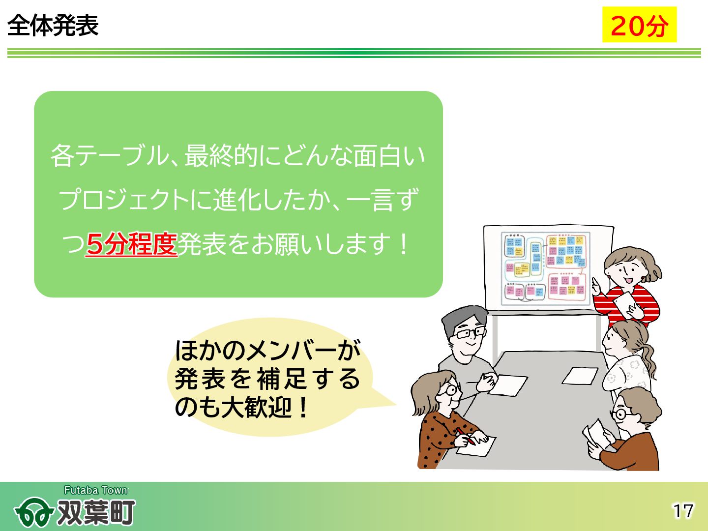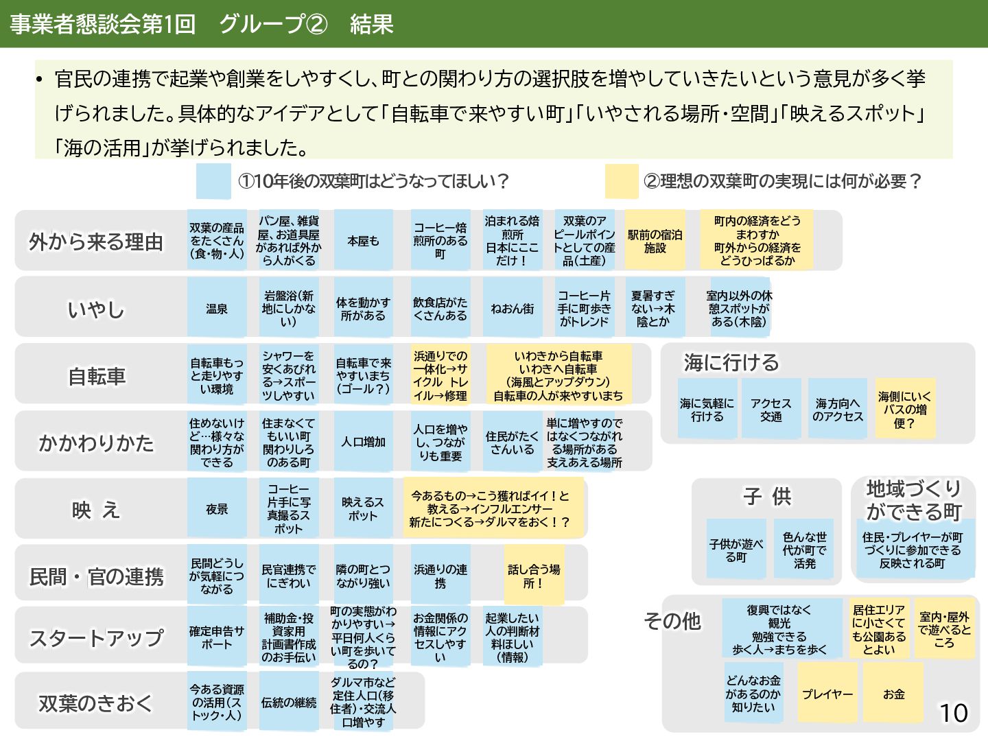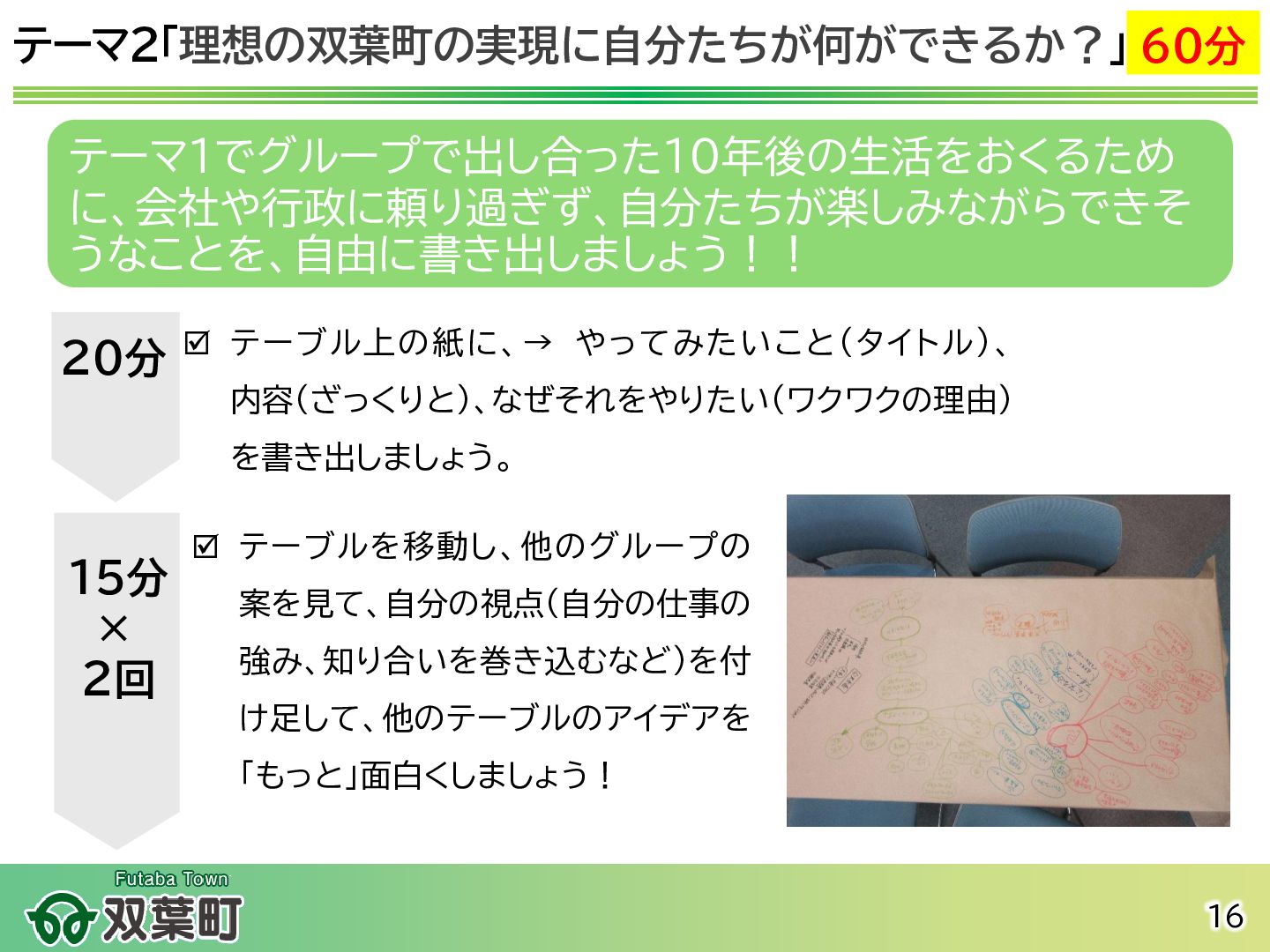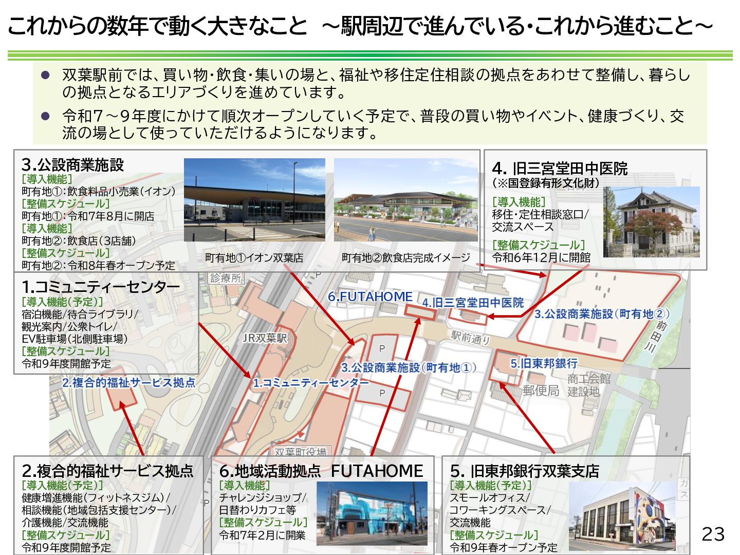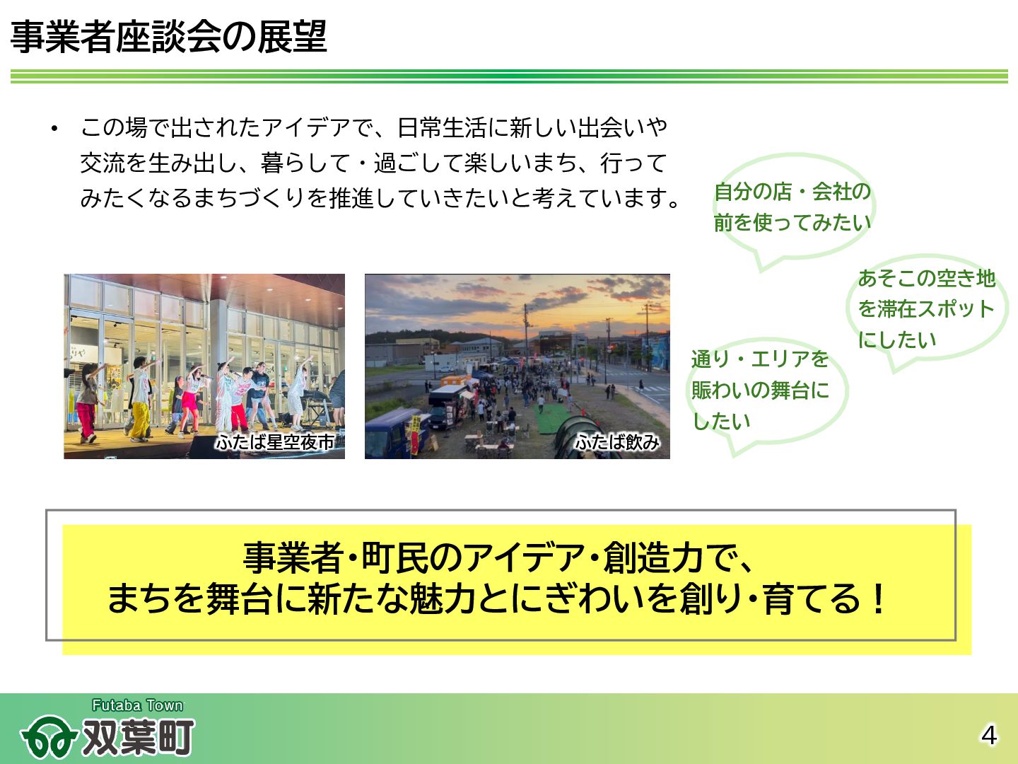 50~59歳, 20.0% 60~64歳, 10.2% 65~69歳, 13.4% 70~74歳, 10.2% 75歳以上, 9.4% 52.6 22.5 25.6 2.9 8.3 20.0 0% 20% 40% 60% 配偶者・パートナー 親(配偶者の親等を含む) こども ひとり暮らし その他の親族・家族 孫 双葉町内, 25.8% 福島県内(双葉 町以外), 52.4% 福島県外, 21.8% 生まれ故郷 だから, 62.2% 仕事のため (就職、転勤、 転職), 10.7% 結婚のため, 16.1% 親やこどもと同居・ 近居するため, 4.3% その他, 6.7% 住んでいた, 89.7% 住んでいない, 10.3% 双葉町内, 18.2% 福島県内(双 葉町以外), 54.8% 福島県外, 27.1% 男性, 58.1% 女性, 38.4% その他, 3.5% 性 別 年 齢 居住地 震災前に双葉町に住んでいたか 住むようになったきっかけ 勤務地 同居する家族 【参考】町民アンケート調査結果のご報告