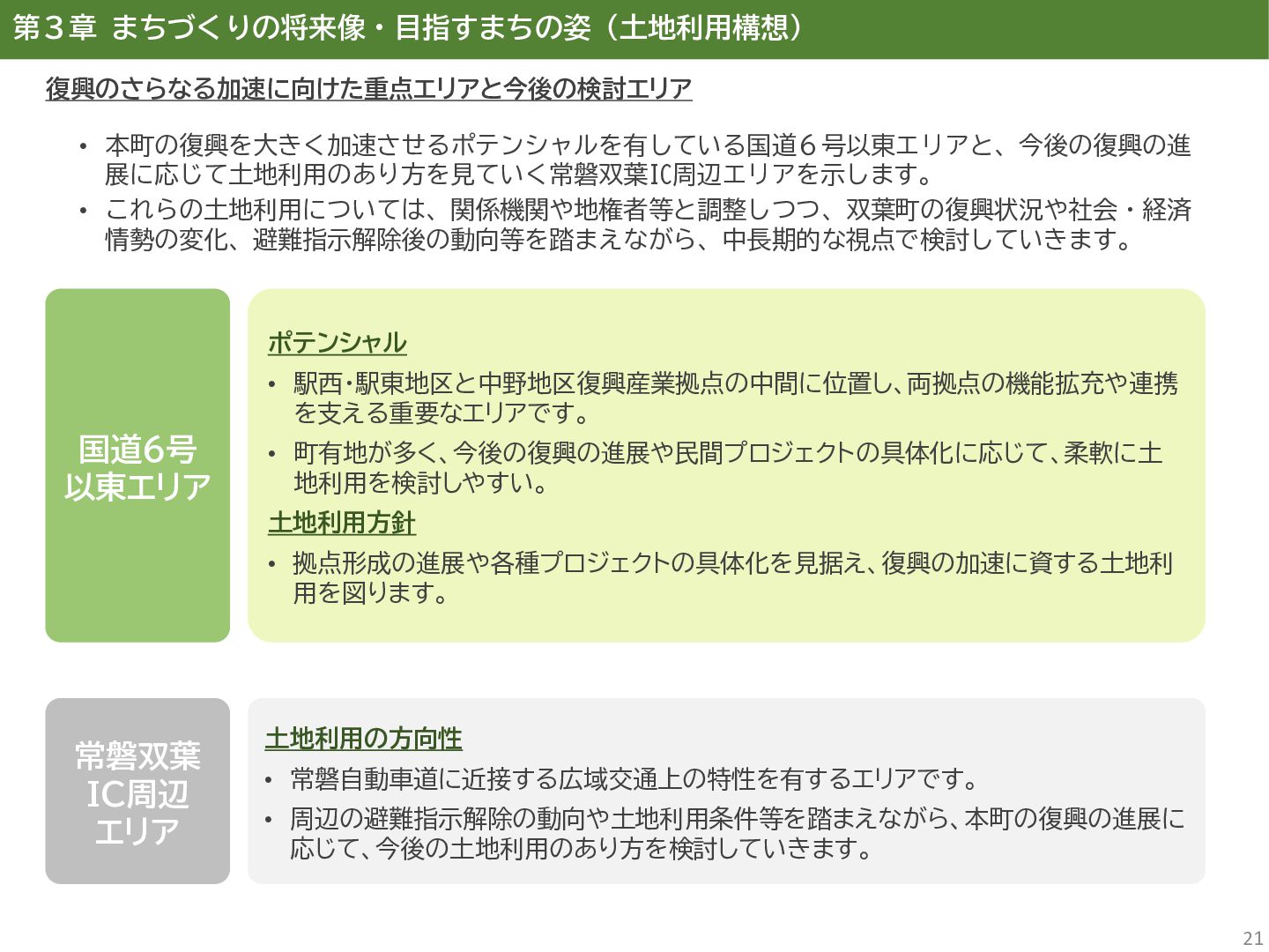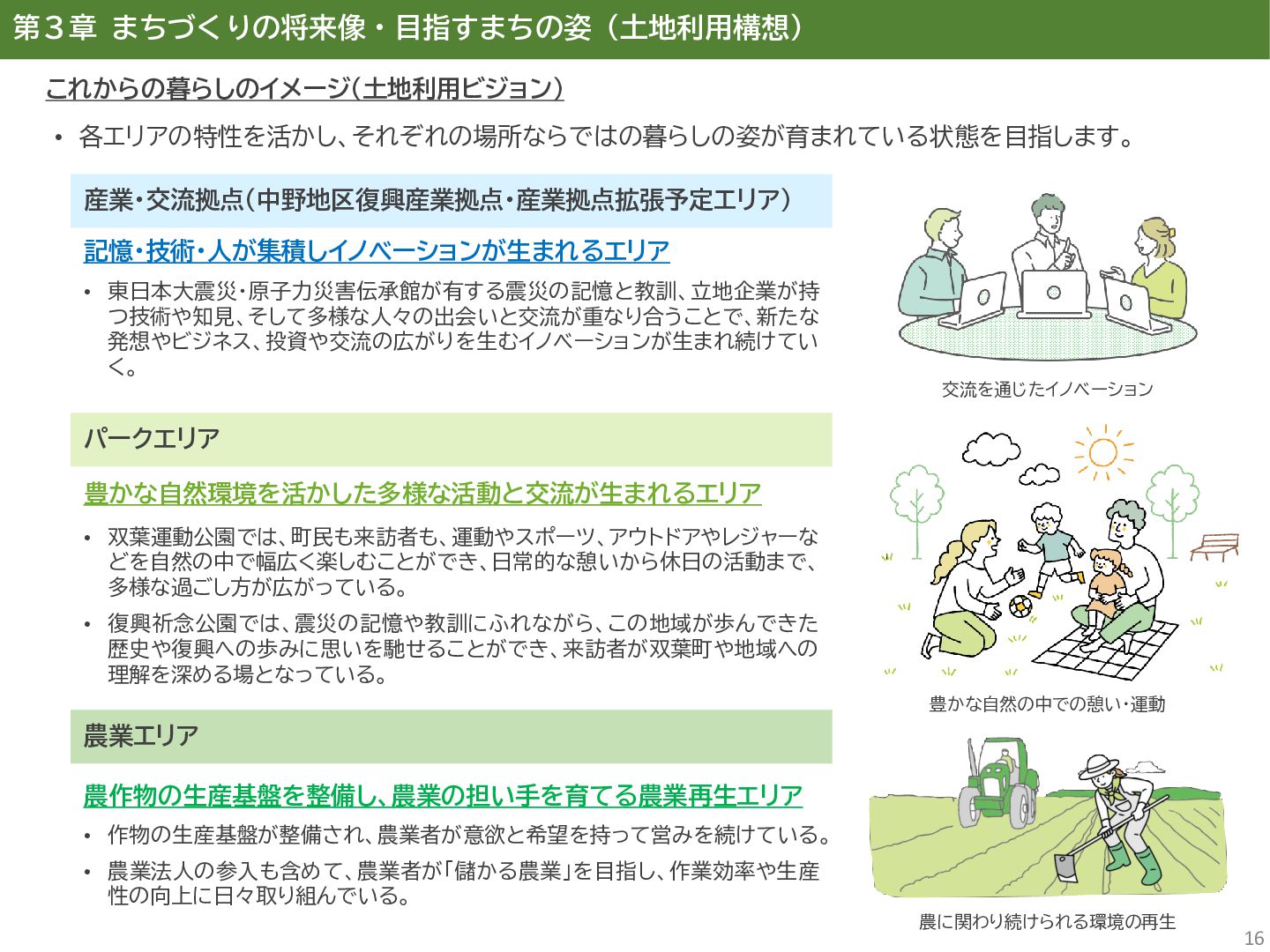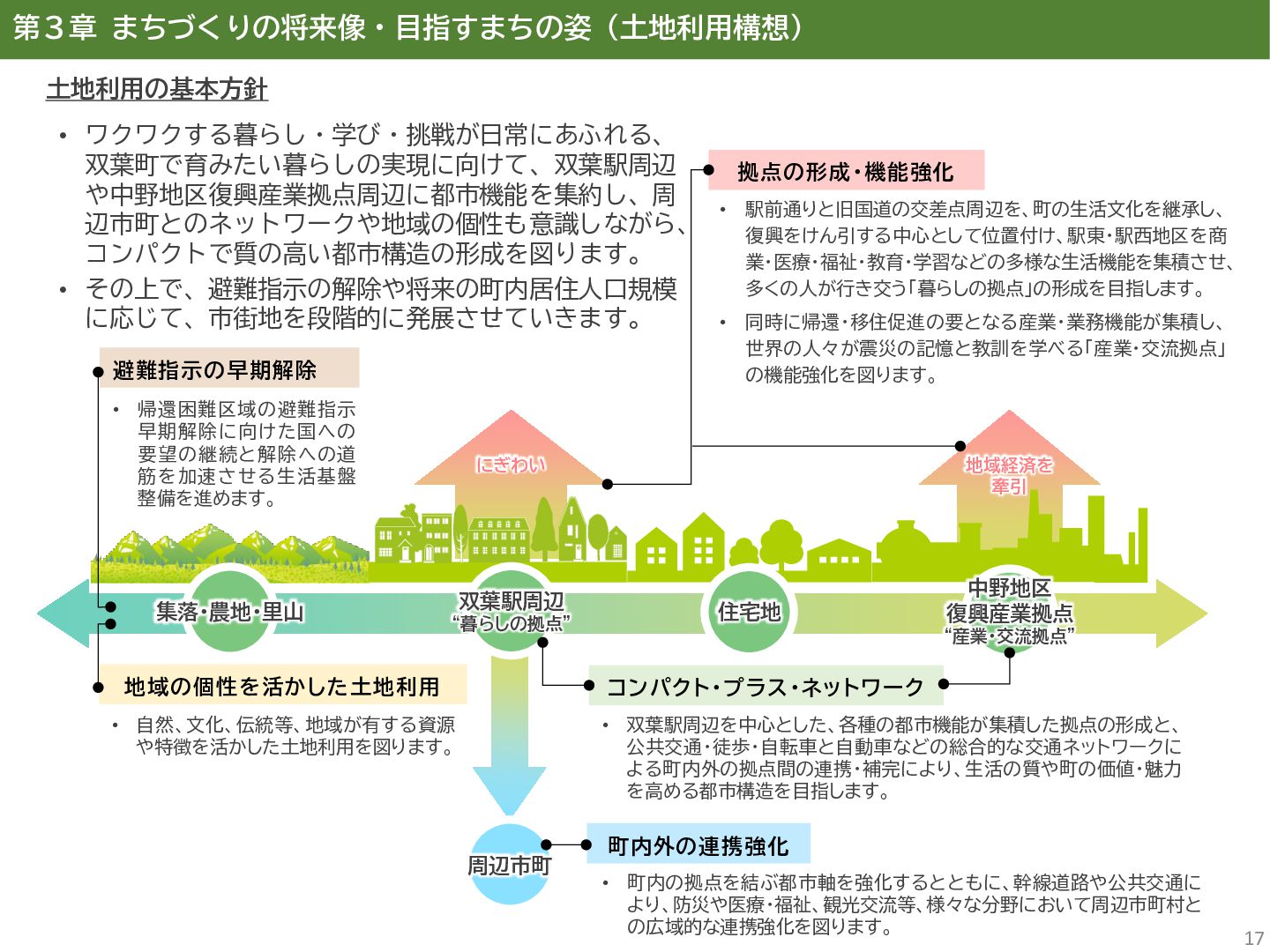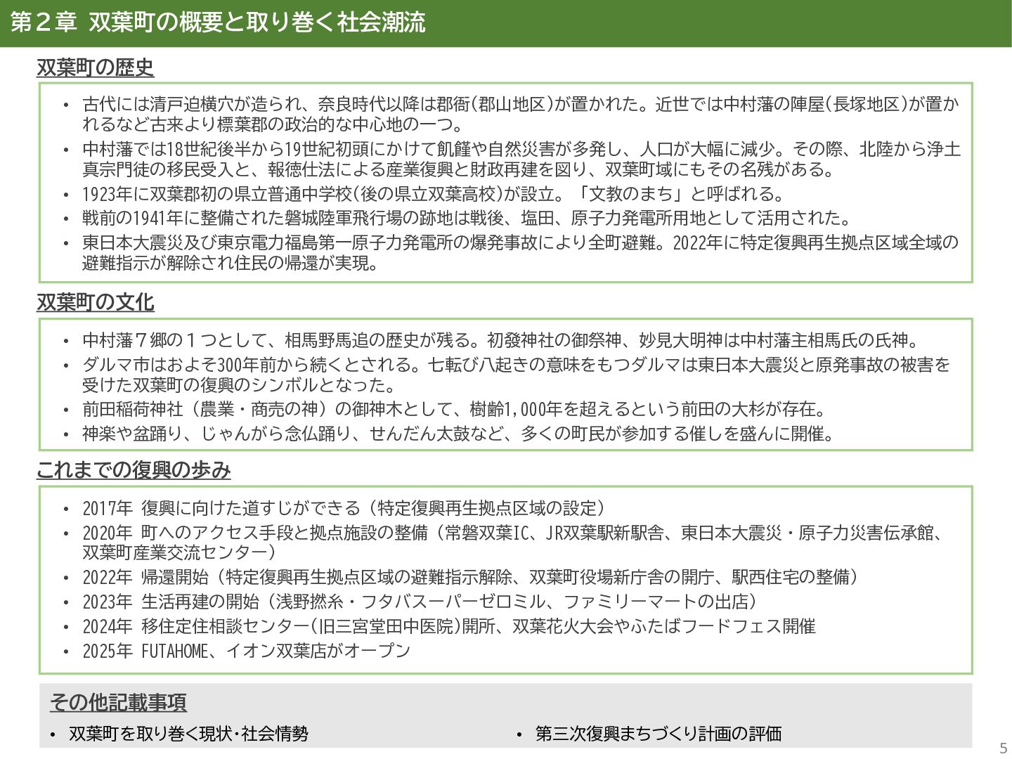 古代には清戸迫横穴が造られ、奈良時代以降は郡衙(郡山地区)が置かれた。近世では中村藩の陣屋(長塚地区)が置か れるなど古来より標葉郡の政治的な中心地の一つ。 • 中村藩では18世紀後半から19世紀初頭にかけて飢饉や自然災害が多発し、人口が大幅に減少。その際、北陸から浄土 真宗門徒の移民受入と、報徳仕法による産業復興と財政再建を図り、双葉町域にもその名残がある。 • 1923年に双葉郡初の県立普通中学校(後の県立双葉高校)が設立。「文教のまち」と呼ばれる。 • 戦前の1941年に整備された磐城陸軍飛行場の跡地は戦後、塩田、原子力発電所用地として活用された。 • 東日本大震災及び東京電力福島第一原子力発電所の爆発事故により全町避難。2022年に特定復興再生拠点区域全域の 避難指示が解除され住民の帰還が実現。 双葉町の文化 • 中村藩7郷の1つとして、相馬野馬追の歴史が残る。初發神社の御祭神、妙見大明神は中村藩主相馬氏の氏神。 • ダルマ市はおよそ300年前から続くとされる。七転び八起きの意味をもつダルマは東日本大震災と原発事故の被害を 受けた双葉町の復興のシンボルとなった。 • 前田稲荷神社(農業・商売の神)の御神木として、樹齢1,000年を超えるという前田の大杉が存在。 • 神楽や盆踊り、じゃんがら念仏踊り、せんだん太鼓など、多くの町民が参加する催しを盛んに開催。 これまでの復興の歩み • 2017年 復興に向けた道すじができる(特定復興再生拠点区域の設定) • 2020年 町へのアクセス手段と拠点施設の整備(常磐双葉IC、JR双葉駅新駅舎、東日本大震災・原子力災害伝承館、 双葉町産業交流センター) • 2022年 帰還開始(特定復興再生拠点区域の避難指示解除、双葉町役場新庁舎の開庁、駅西住宅の整備) • 2023年 生活再建の開始(浅野撚糸・フタバスーパーゼロミル、ファミリーマートの出店) • 2024年 移住定住相談センター(旧三宮堂田中医院)開所、双葉花火大会やふたばフードフェス開催 • 2025年 FUTAHOME、イオン双葉店がオープン