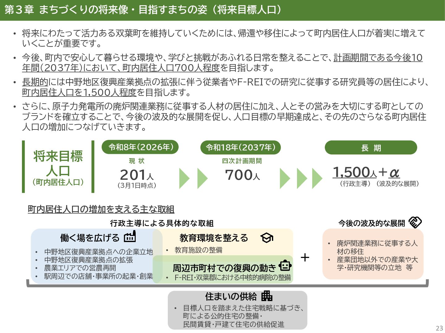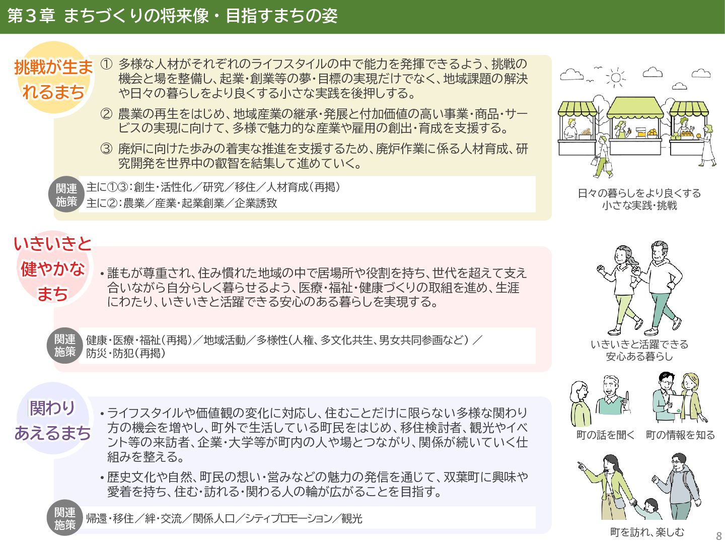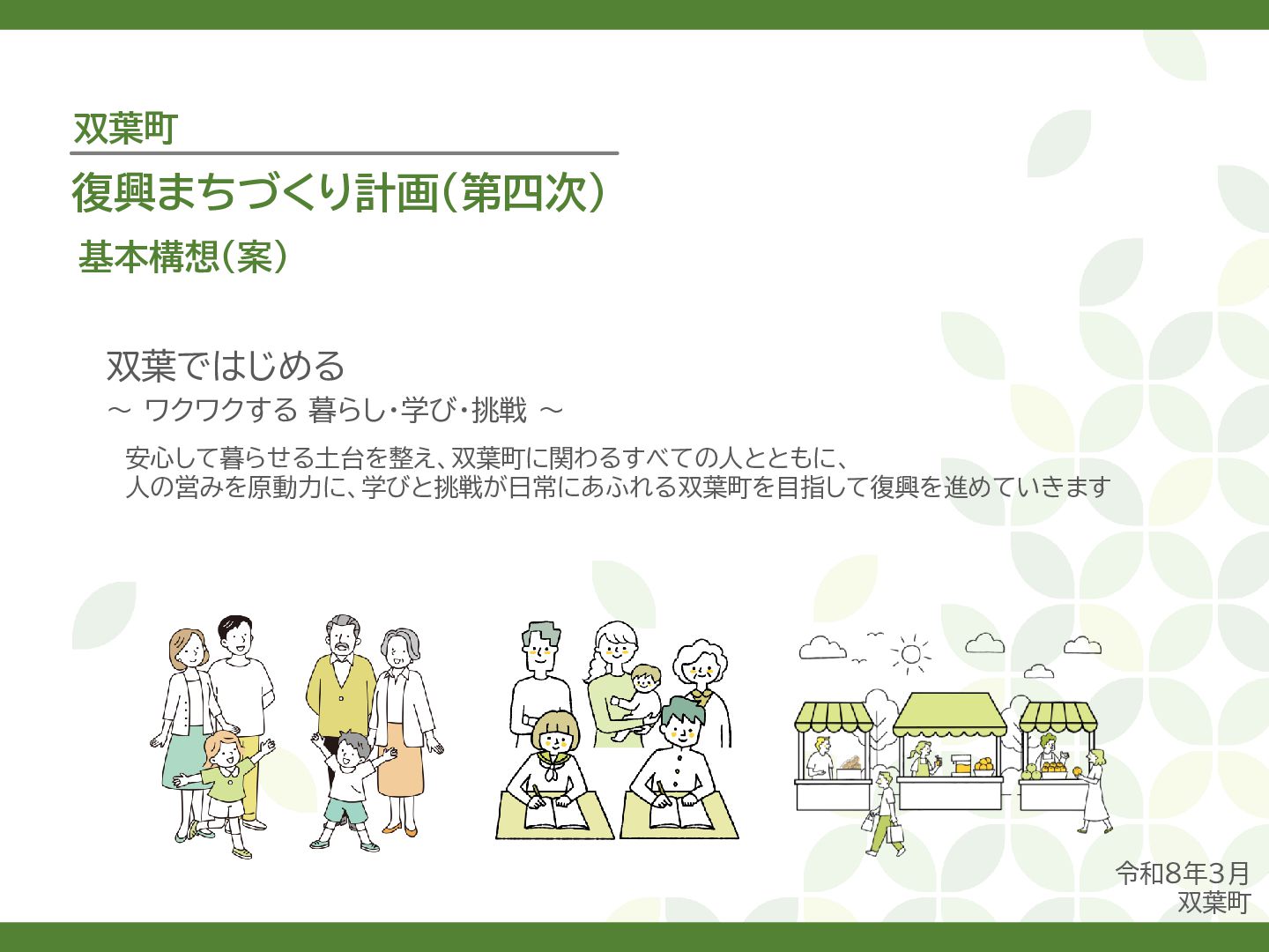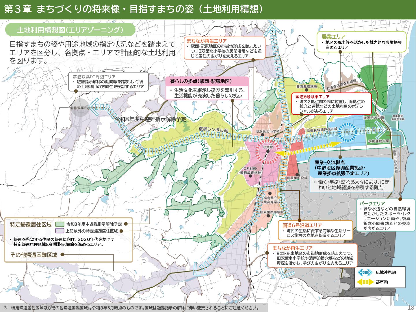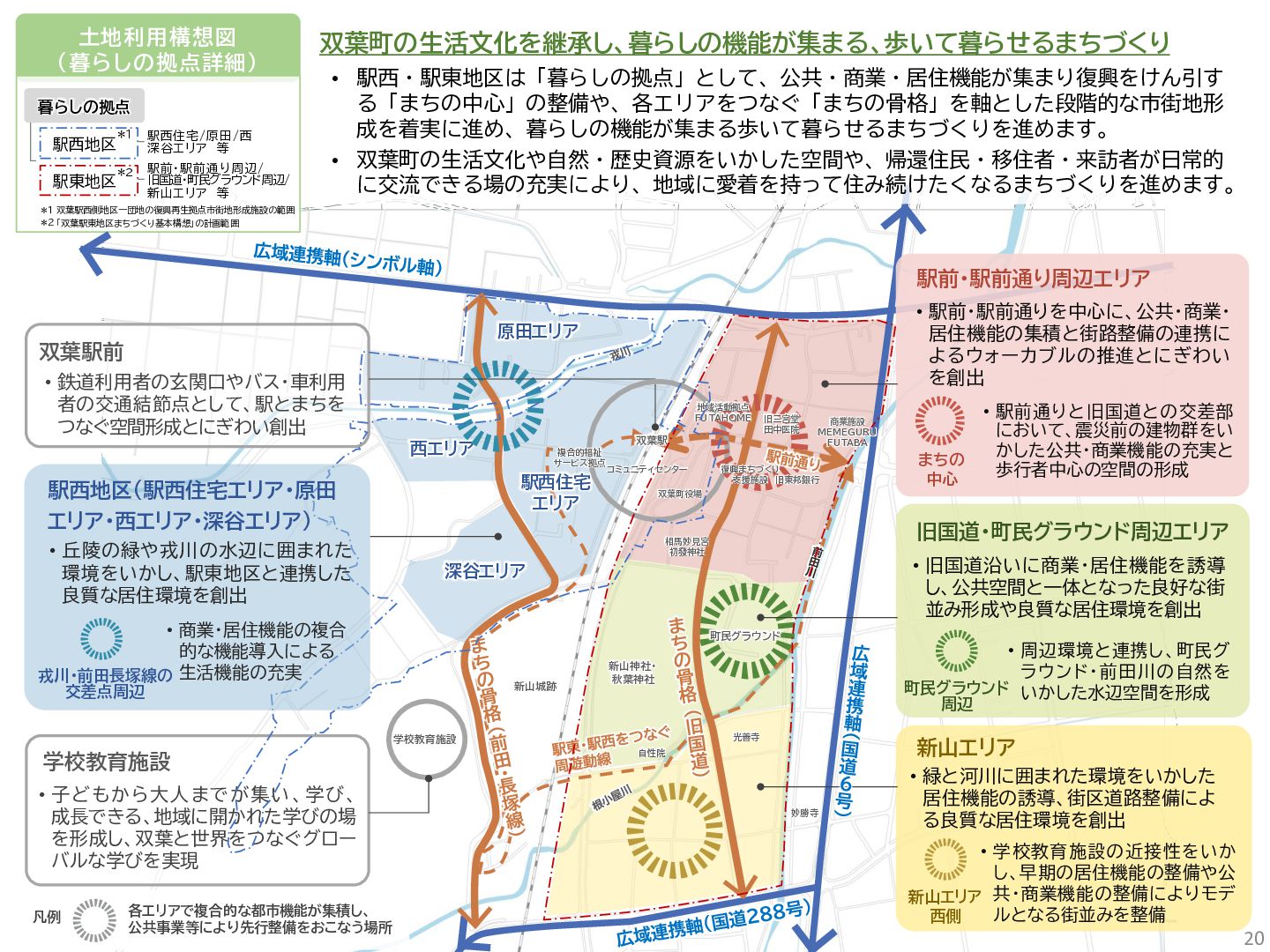古代には清戸迫横穴が造られ、奈良時代以降は郡衙(郡山地区)が置かれた。近世では中村藩の陣屋(長塚地区)が置か れるなど古来より標葉郡の政治的な中心地の一つ。 • 中村藩では18世紀後半から19世紀初頭にかけて飢饉や自然災害が多発し、人口が大幅に減少。その際、北陸から浄土 真宗門徒の移民受入と、報徳仕法による産業復興と財政再建を図り、双葉町域にもその名残がある。 • 1923年に双葉郡初の県立普通中学校(後の県立双葉高校)が設立。「文教のまち」と呼ばれる。 • 戦前の1941年に整備された磐城陸軍飛行場の跡地は戦後、塩田、原子力発電所用地として活用された。 • 東日本大震災及び東京電力福島第一原子力発電所の爆発事故により全町避難。2022年に特定復興再生拠点区域全域の 避難指示が解除され住民の帰還が実現。 双葉町の文化 • 中村藩7郷の1つとして、相馬野馬追の歴史が残る。初發神社の御祭神、妙見大明神は中村藩主相馬氏の氏神。 • ダルマ市はおよそ300年前から続くとされる。七転び八起きの意味をもつダルマは東日本大震災と原発事故の被害を 受けた双葉町の復興のシンボルとなった。 • 前田稲荷神社(農業・商売の神)の御神木として、樹齢1,000年を超えるという前田の大杉が存在。 • 神楽や盆踊り、じゃんがら念仏踊り、せんだん太鼓など、多くの町民が参加する催しを盛んに開催。 これまでの復興の歩み • 2017年 復興に向けた道すじができる(特定復興再生拠点区域の設定) • 2020年 町へのアクセス手段と拠点施設の整備(常磐双葉IC、JR双葉駅新駅舎、東日本大震災・原子力災害伝承館、 双葉町産業交流センター) • 2022年 帰還開始(特定復興再生拠点区域の避難指示解除、双葉町役場新庁舎の開庁、駅西住宅の整備) • 2023年 生活再建の開始(浅野撚糸・フタバスーパーゼロミル、ファミリーマートの出店) • 2024年 移住定住相談センター(旧三宮堂田中医院)開所、双葉花火大会やふたばフードフェス開催 • 2025年 FUTAHOME、イオン双葉店がオープン
