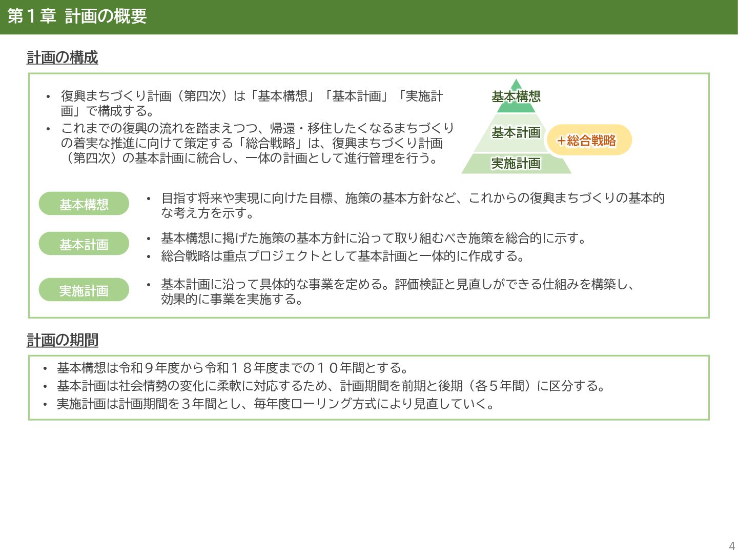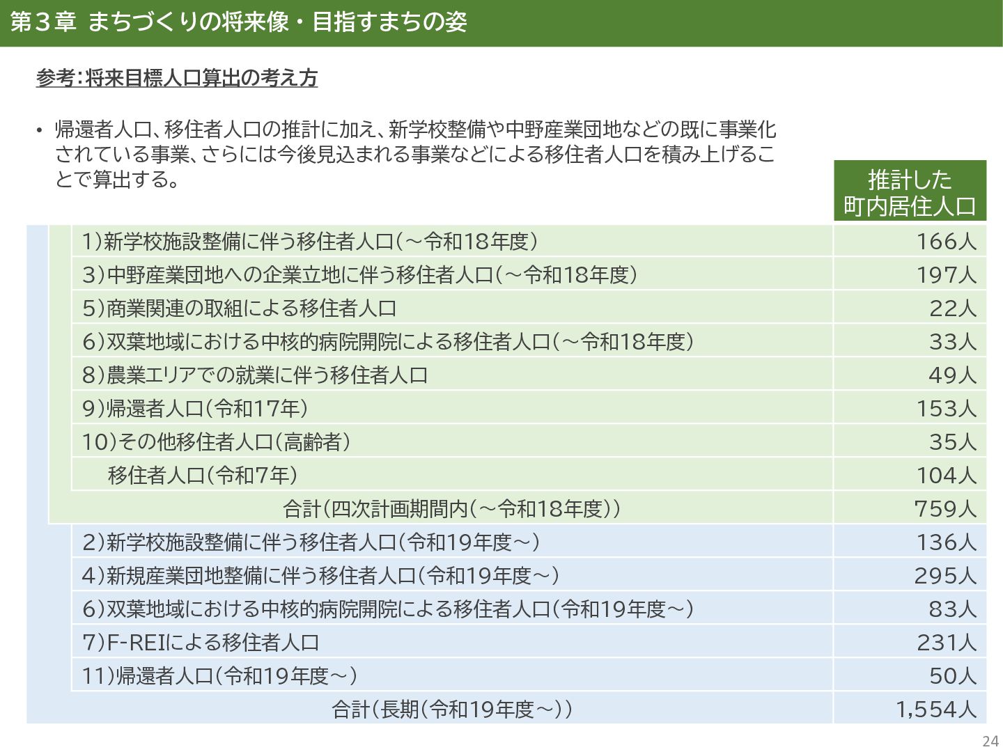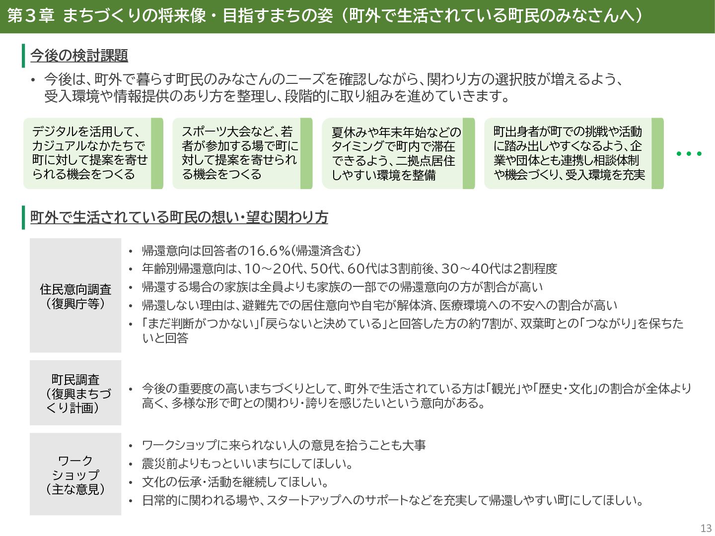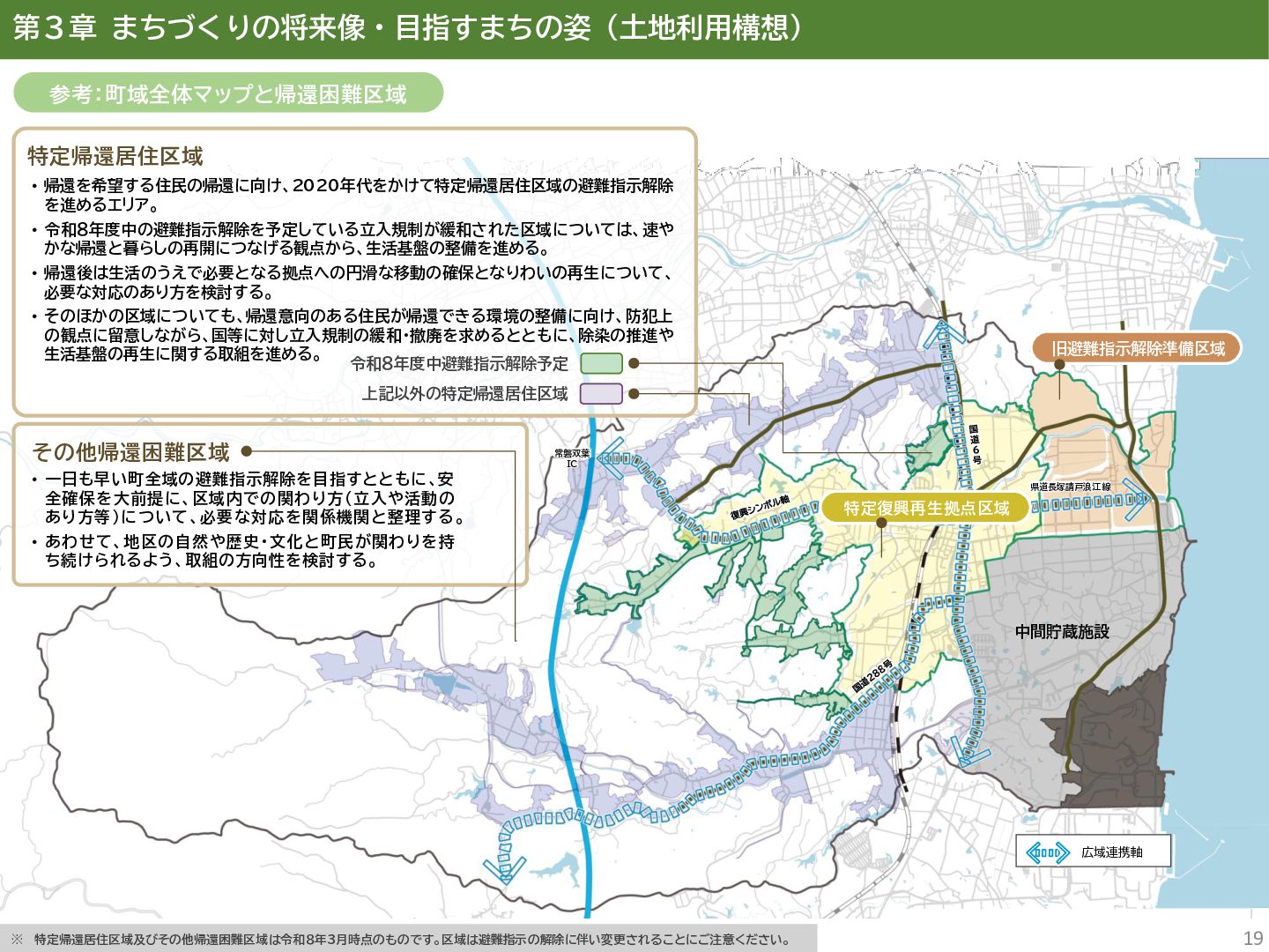 古代には清戸迫横穴が造られ、奈良時代以降は郡衙(郡山地区)が置かれた。近世では中村藩の陣屋(長塚地区)が置か れるなど古来より標葉郡の政治的な中心地の一つ。 • 中村藩では18世紀後半から19世紀初頭にかけて飢饉や自然災害が多発し、人口が大幅に減少。その際、北陸から浄土 真宗門徒の移民受入と、報徳仕法による産業復興と財政再建を図り、双葉町域にもその名残がある。 • 1923年に双葉郡初の県立普通中学校(後の県立双葉高校)が設立。「文教のまち」と呼ばれる。 • 戦前の1941年に整備された磐城陸軍飛行場の跡地は戦後、塩田、原子力発電所用地として活用された。 • 東日本大震災及び東京電力福島第一原子力発電所の爆発事故により全町避難。2022年に特定復興再生拠点区域全域の 避難指示が解除され住民の帰還が実現。 双葉町の文化 • 中村藩7郷の1つとして、相馬野馬追の歴史が残る。初發神社の御祭神、妙見大明神は中村藩主相馬氏の氏神。 • ダルマ市はおよそ300年前から続くとされる。七転び八起きの意味をもつダルマは東日本大震災と原発事故の被害を 受けた双葉町の復興のシンボルとなった。 • 前田稲荷神社(農業・商売の神)の御神木として、樹齢1,000年を超えるという前田の大杉が存在。 • 神楽や盆踊り、じゃんがら念仏踊り、せんだん太鼓など、多くの町民が参加する催しを盛んに開催。 これまでの復興の歩み • 2017年 復興に向けた道すじができる(特定復興再生拠点区域の設定) • 2020年 町へのアクセス手段と拠点施設の整備(常磐双葉IC、JR双葉駅新駅舎、東日本大震災・原子力災害伝承館、 双葉町産業交流センター) • 2022年 帰還開始(特定復興再生拠点区域の避難指示解除、双葉町役場新庁舎の開庁、駅西住宅の整備) • 2023年 生活再建の開始(浅野撚糸・フタバスーパーゼロミル、ファミリーマートの出店) • 2024年 移住定住相談センター(旧三宮堂田中医院)開所、双葉花火大会やふたばフードフェス開催 • 2025年 FUTAHOME、イオン双葉店がオープン