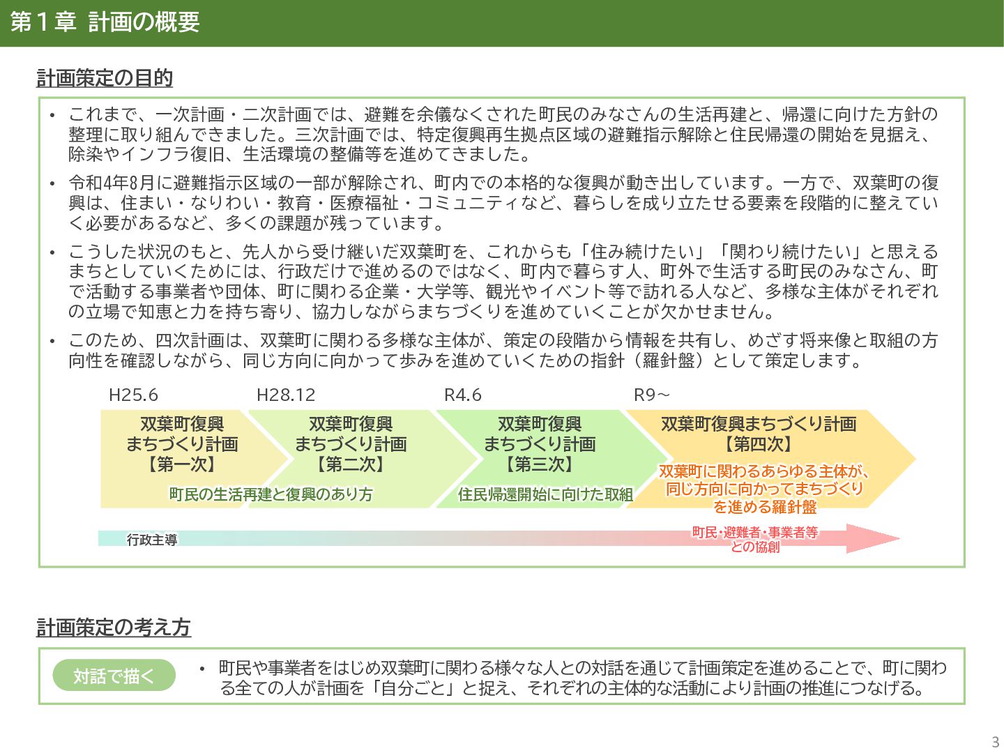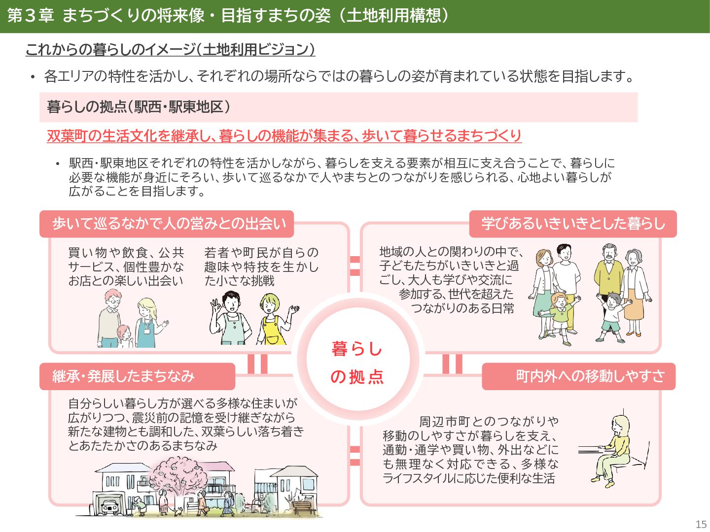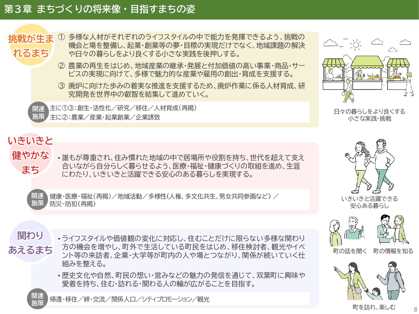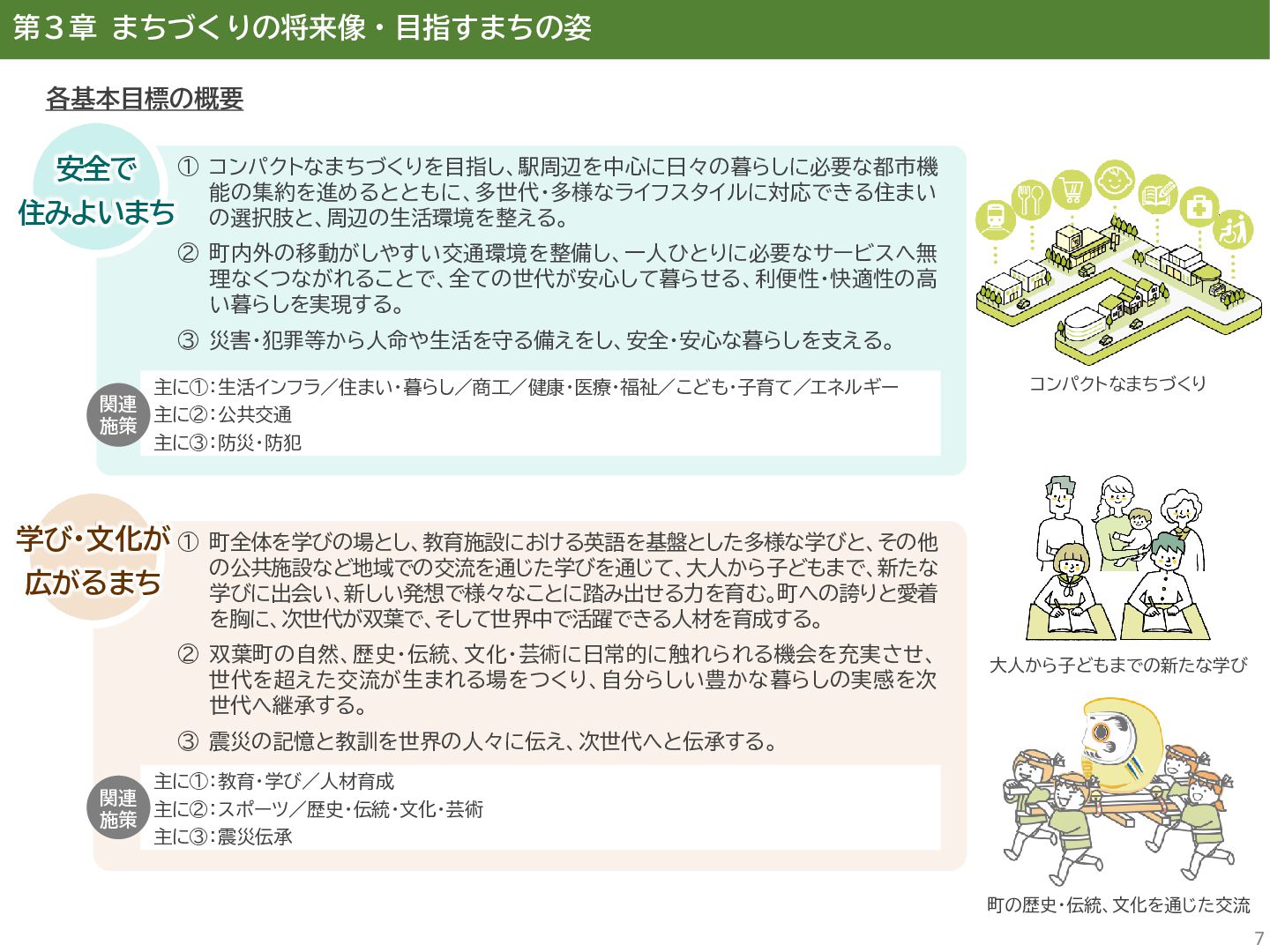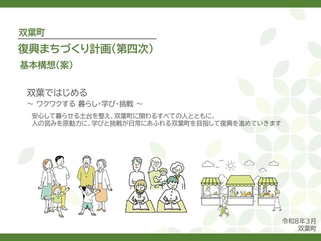 古代には清戸迫横穴が造られ、奈良時代以降は郡衙(郡山地区)が置かれた。近世では中村藩の陣屋(長塚地区)が置か れるなど古来より標葉郡の政治的な中心地の一つ。 • 中村藩では18世紀後半から19世紀初頭にかけて飢饉や自然災害が多発し、人口が大幅に減少。その際、北陸から浄土 真宗門徒の移民受入と、報徳仕法による産業復興と財政再建を図り、双葉町域にもその名残がある。 • 1923年に双葉郡初の県立普通中学校(後の県立双葉高校)が設立。「文教のまち」と呼ばれる。 • 戦前の1941年に整備された磐城陸軍飛行場の跡地は戦後、塩田、原子力発電所用地として活用された。 • 東日本大震災及び東京電力福島第一原子力発電所の爆発事故により全町避難。2022年に特定復興再生拠点区域全域の 避難指示が解除され住民の帰還が実現。 双葉町の文化 • 中村藩7郷の1つとして、相馬野馬追の歴史が残る。初發神社の御祭神、妙見大明神は中村藩主相馬氏の氏神。 • ダルマ市はおよそ300年前から続くとされる。七転び八起きの意味をもつダルマは東日本大震災と原発事故の被害を 受けた双葉町の復興のシンボルとなった。 • 前田稲荷神社(農業・商売の神)の御神木として、樹齢1,000年を超えるという前田の大杉が存在。 • 神楽や盆踊り、じゃんがら念仏踊り、せんだん太鼓など、多くの町民が参加する催しを盛んに開催。 これまでの復興の歩み • 2017年 復興に向けた道すじができる(特定復興再生拠点区域の設定) • 2020年 町へのアクセス手段と拠点施設の整備(常磐双葉IC、JR双葉駅新駅舎、東日本大震災・原子力災害伝承館、 双葉町産業交流センター) • 2022年 帰還開始(特定復興再生拠点区域の避難指示解除、双葉町役場新庁舎の開庁、駅西住宅の整備) • 2023年 生活再建の開始(浅野撚糸・フタバスーパーゼロミル、ファミリーマートの出店) • 2024年 移住定住相談センター(旧三宮堂田中医院)開所、双葉花火大会やふたばフードフェス開催 • 2025年 FUTAHOME、イオン双葉店がオープン