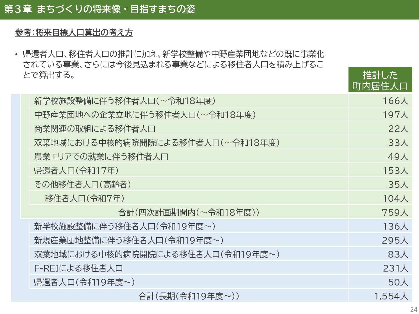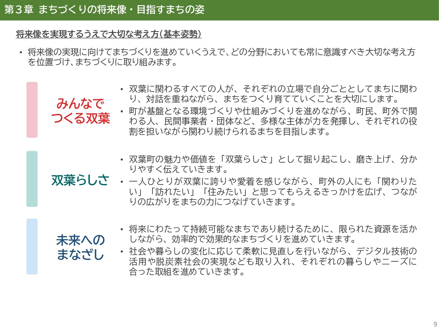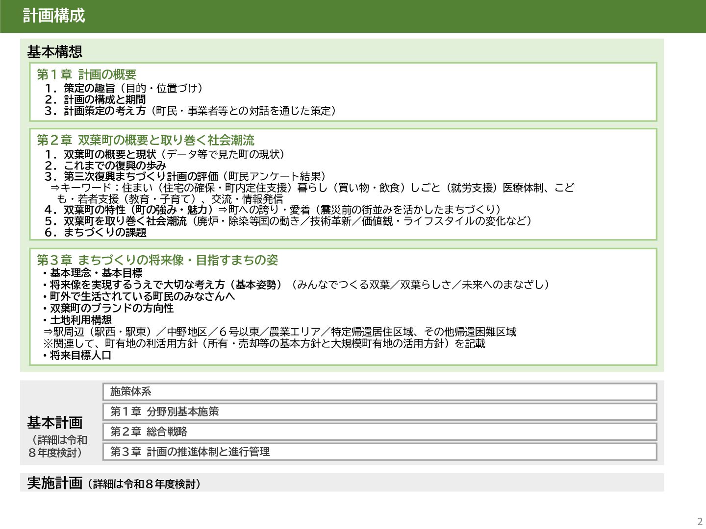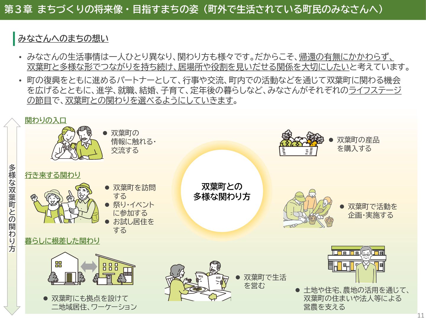 古代には清戸迫横穴が造られ、奈良時代以降は郡衙(郡山地区)が置かれた。近世では中村藩の陣屋(長塚地区)が置か れるなど古来より標葉郡の政治的な中心地の一つ。 • 中村藩では18世紀後半から19世紀初頭にかけて飢饉や自然災害が多発し、人口が大幅に減少。その際、北陸から浄土 真宗門徒の移民受入と、報徳仕法による産業復興と財政再建を図り、双葉町域にもその名残がある。 • 1923年に双葉郡初の県立普通中学校(後の県立双葉高校)が設立。「文教のまち」と呼ばれる。 • 戦前の1941年に整備された磐城陸軍飛行場の跡地は戦後、塩田、原子力発電所用地として活用された。 • 東日本大震災及び東京電力福島第一原子力発電所の爆発事故により全町避難。2022年に特定復興再生拠点区域全域の 避難指示が解除され住民の帰還が実現。 双葉町の文化 • 中村藩7郷の1つとして、相馬野馬追の歴史が残る。初發神社の御祭神、妙見大明神は中村藩主相馬氏の氏神。 • ダルマ市はおよそ300年前から続くとされる。七転び八起きの意味をもつダルマは東日本大震災と原発事故の被害を 受けた双葉町の復興のシンボルとなった。 • 前田稲荷神社(農業・商売の神)の御神木として、樹齢1,000年を超えるという前田の大杉が存在。 • 神楽や盆踊り、じゃんがら念仏踊り、せんだん太鼓など、多くの町民が参加する催しを盛んに開催。 これまでの復興の歩み • 2017年 復興に向けた道すじができる(特定復興再生拠点区域の設定) • 2020年 町へのアクセス手段と拠点施設の整備(常磐双葉IC、JR双葉駅新駅舎、東日本大震災・原子力災害伝承館、 双葉町産業交流センター) • 2022年 帰還開始(特定復興再生拠点区域の避難指示解除、双葉町役場新庁舎の開庁、駅西住宅の整備) • 2023年 生活再建の開始(浅野撚糸・フタバスーパーゼロミル、ファミリーマートの出店) • 2024年 移住定住相談センター(旧三宮堂田中医院)開所、双葉花火大会やふたばフードフェス開催 • 2025年 FUTAHOME、イオン双葉店がオープン