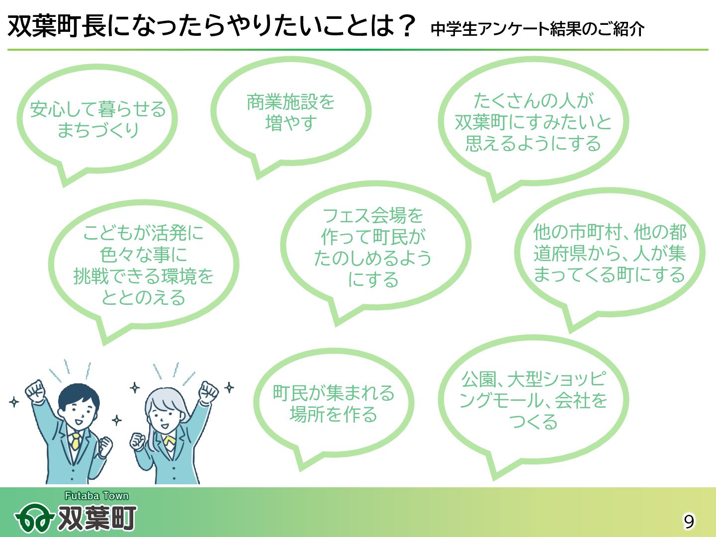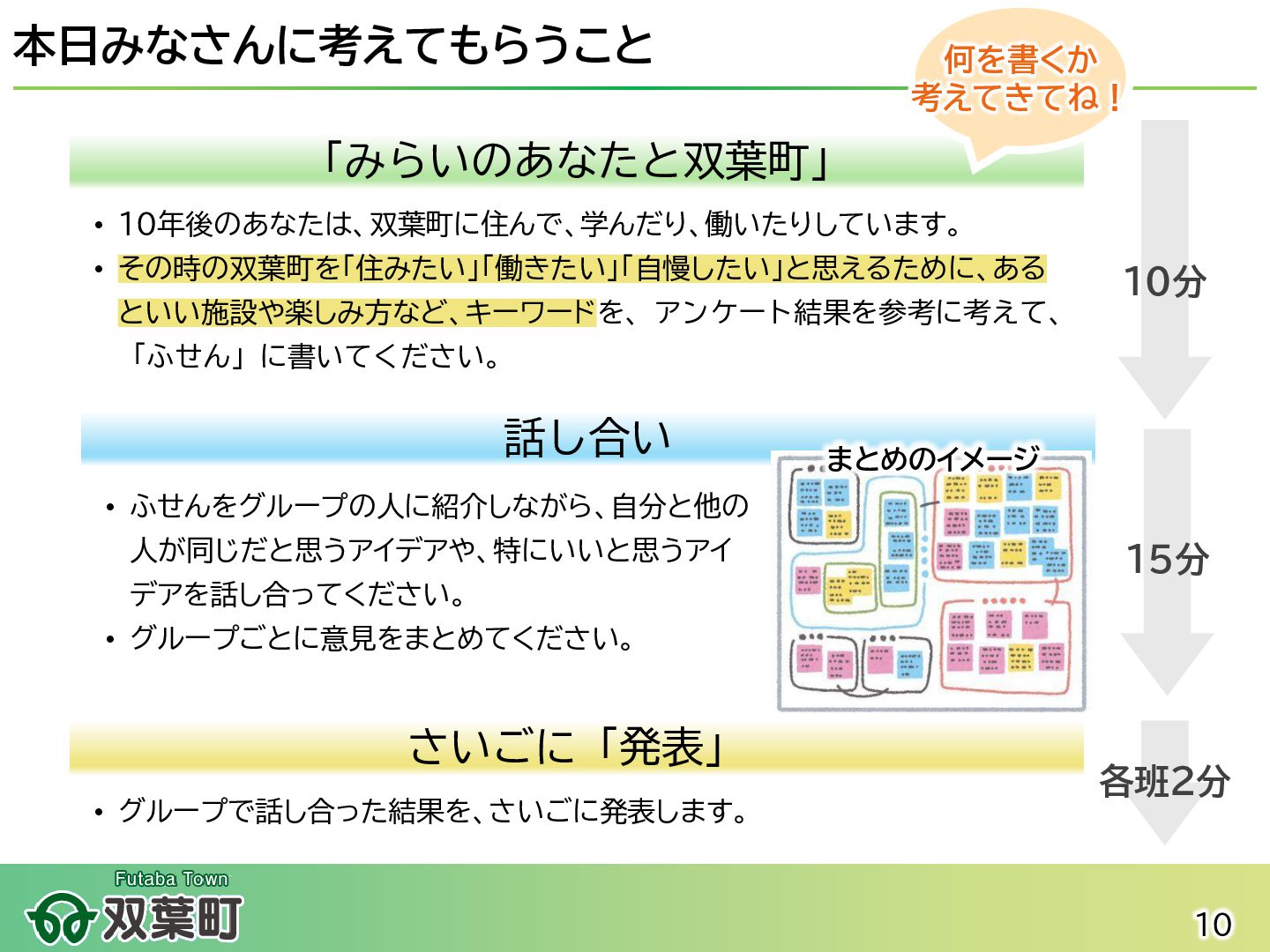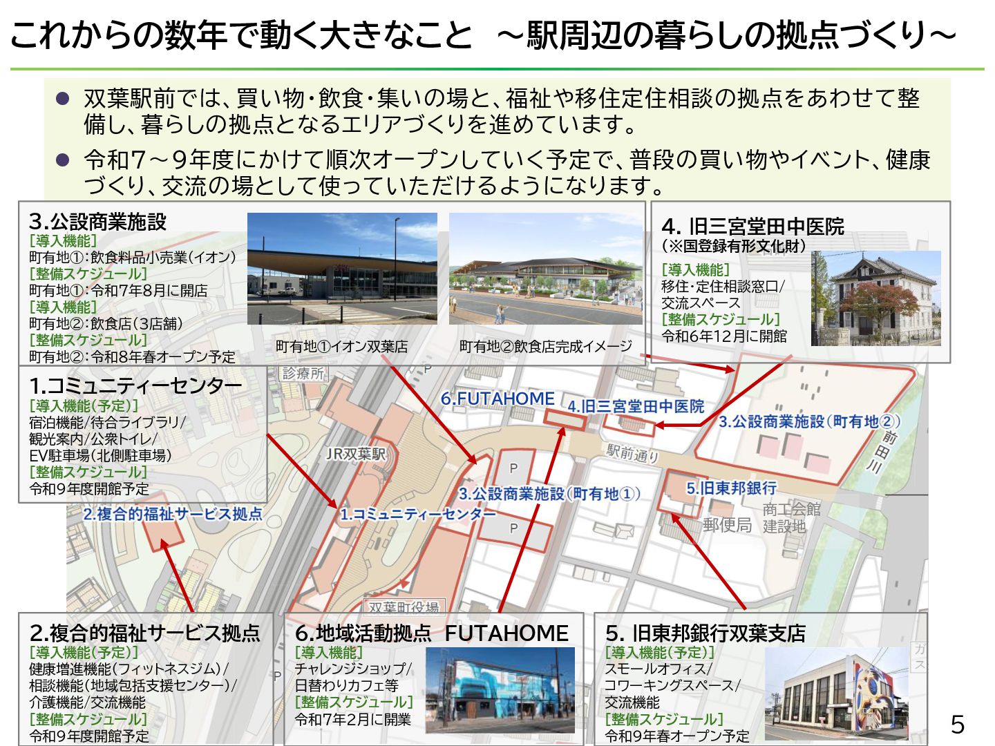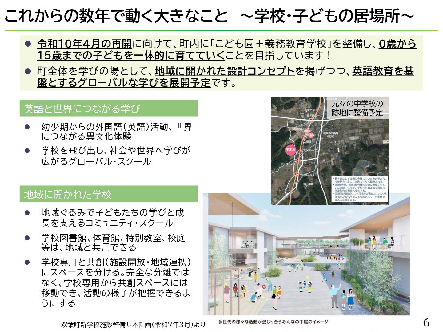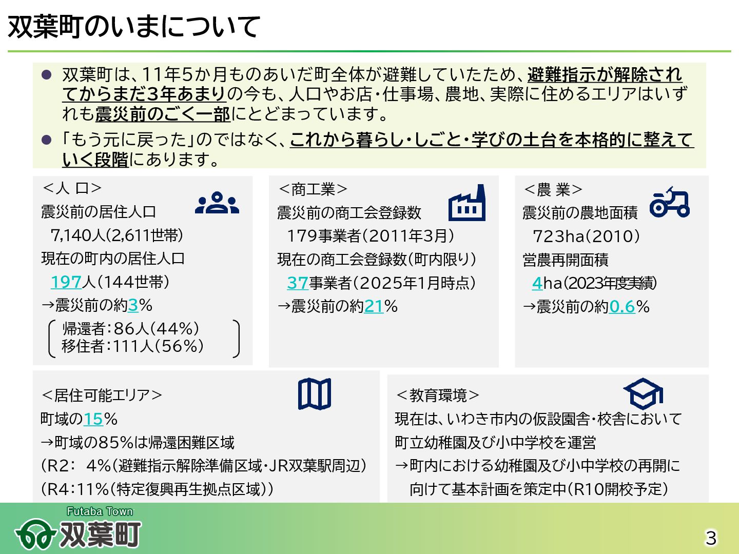 震災以降手つかずだった町内一部区域の復旧・復興を本格的に進めることが可能に 2020年 【町へ車・電車で訪れる手段と拠点施設の整備】 ⚫ 常磐自動車道 常磐双葉インターチェンジが開通。 ⚫ JR常磐線の全線再開通に伴いJR双葉駅新駅舎が開業 ⚫ 震災や原発事故の記録と教訓を国内外に発信する「東日本大震災・原子力災害伝承館」が開館 ⚫ 復興関連企業事務所や飲食・土産物店が入った複合施設「双葉町産業交流センター」が開所 2022年 【町への帰還が開始】 ⚫ 特定復興再生拠点区域全域の避難指示が解除され住民の帰還が実現。 ⚫ 双葉町役場新庁舎の開庁により本格的な行政活動が町内で再開された。 ⚫ 「駅西住宅」の整備が進み、段階的に入居が開始。 2025年 ⚫ 地域活動拠点「FUTAHOME」がオープン(2月)。 ⚫ 震災後初のスーパーマーケット「イオン双葉店」が役場隣接地にオープン(8月) 2023年 【町での暮らし・しごとの再建が進む】 ⚫ 浅野撚糸・フタバスーパーゼロミル開設。 ⚫ 産業交流センターに町内初のコンビニ「ファミリーマート」が出店。 2024年 ⚫ 移住定住相談センター(旧三宮堂田中医院)開所。 ⚫ 双葉花火大会やふたばフードフェス開催。 イオン双葉店 浅野撚糸 JR双葉駅開通 2 みなさんが 生まれる前後 5~7歳 8~10歳 10~12歳 11~13歳 12~14歳 13~15歳