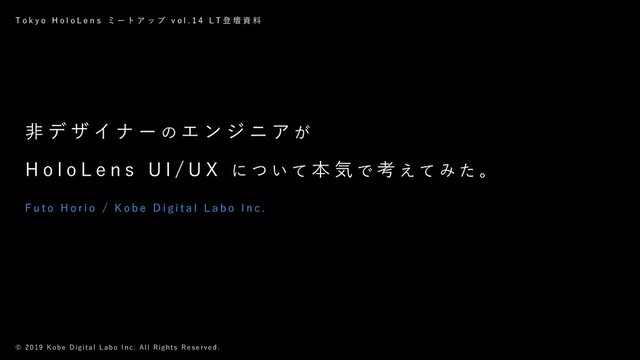 T o k y o H o l o L e n s ミ ー ト ア ッ プ v o l . 1 4 L T 登 壇 資 料 非 デ ザ イ ナ ー の エ ン ジ ニ ア が H o l o L e n s U I / U X に つ い て 本 気 で 考 え て み た 。 F u t o H o r i o / K o b e D i g i t a l L a b o I n c .