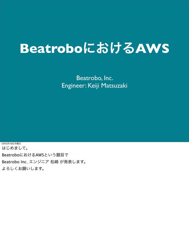 Beatroboʹ͓͚ΔAWS Beatrobo, Inc. Engineer: Keiji Matsuzaki 132݄18݄༵ ͡Ί·ͯ͠ɻ Beatroboʹ͓͚ΔAWSͱ͍͏Ͱ Beatrobo