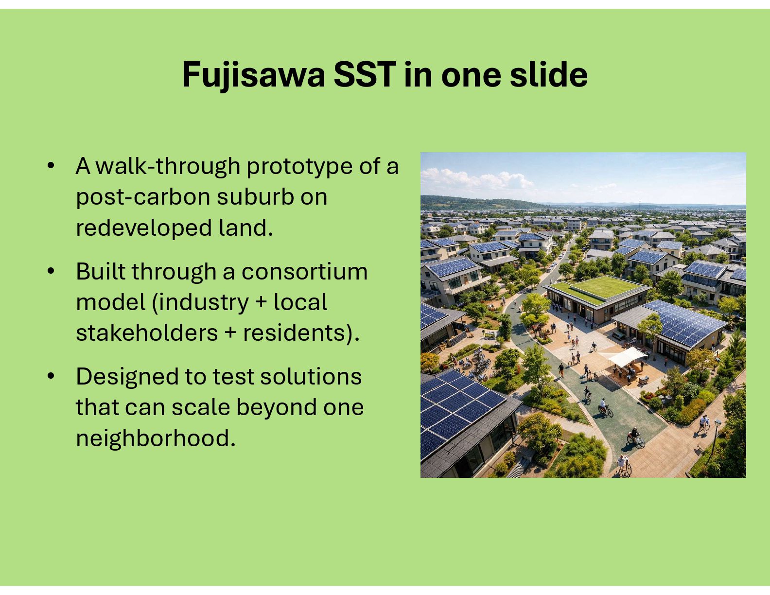For more than a decade, Fujisawa Sustainable Smart Town (Fujisawa SST) has served as a walk-through prototype of a post-carbon suburb. By 2025 the community had already cut household CO₂ emissions by 70 percent compared with 1990 baselines, while trimming domestic water use by 30 percent and boosting renewable self-consumption above 30 percent (Panasonic, 2025: https://news.panasonic.com/global/stories/17225). Those figures are not sketches in a prospectus—they are meter readings collected house-by-house.