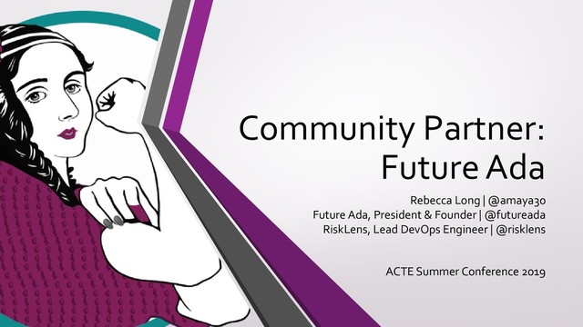 help bring support to gender minorities of all ages in the sciences and tech • Want to encourage and inspire young folks to consider STEAM fields for careers • Want to support those already in these fields so they feel welcomed to stay • The world is stronger when we are all at the problem solving table • No one should feel pushed out of a STEAM program or career before they choose to do so for their own reasons Rebecca Long / Future Ada | @amaya30 / @futureada | ACTE 2019