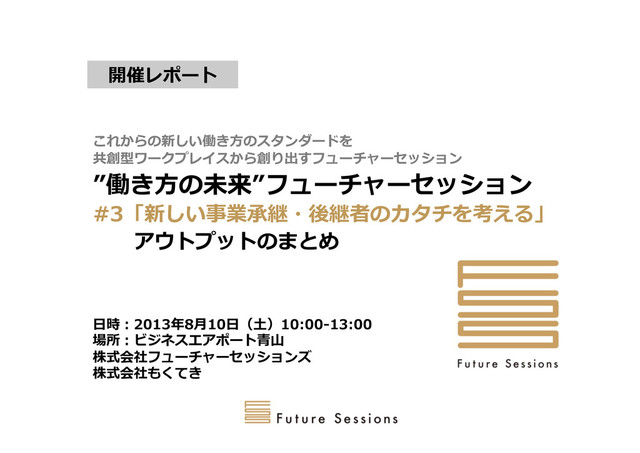 ⽇日時:2013年年8⽉月10⽇日(⼟土)10:00-‐‑‒13:00 場所:ビジネスエアポート⻘青⼭山 株式会社フューチャーセッションズ 株式会社もくてき これからの新しい働き⽅方のスタンダードを 共創型ワークプレイスから創り出すフューチャーセッション ”働き⽅方の未来”フューチャーセッション #3「新しい事業承継・後継者のカタチを考える」 アウトプットのまとめ 開催レポート
