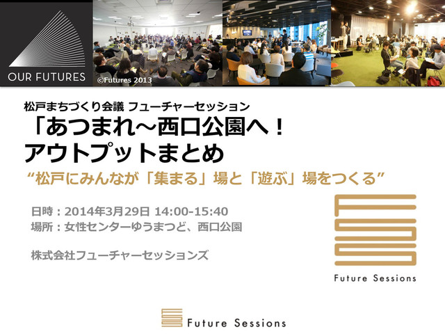 砂ばかりで潤いがない公園に⾒見見える。⽔水があるといいな と思う。 " 「⼤大⼈人の都合」 " 家に⼦子どもを置いておくだけが安全じゃない。外に出て 宿題できるような安全な場所を作りたい。⼤大⼈人が宿題教 えてもいい。旦那が帰ってこないなと思ったら、⻄西⼝口公 園にいるような、コミュニティの中⼼心にしたい。 " 安⼼心安全な場所。お茶茶屋でお茶茶を飲みながら、安全を⾒見見 守れるようにしたい。 " 周りが緑で囲まれている。真ん中には⽔水場がある。全体 を⾒見見守れるような丘にしたい。 " 「グラスひるパーク」 " 芝⽣生と丘と森がキーワード。⼦子どもとピクニックに来て おにぎりを⾷食べられるような場所、いつでも来れる公園 にしたい。 " ごろごろできる芝⽣生や⽔水場、アウトドアができるような スペースを作りたい。 " いま⼦子ども達は公園で輪輪になってゲームしている。そう ではなくて、⼦子供が⾛走り回れるような公園にしたい。芝 ⽣生があれば、転んでも痛くない。 " 松⼾戸には「おっぱい公園」と呼ばれる、丘のある公園が たくさんあり、親⼦子の会話で「おっぱい公園⾏行行ってくる ね」と普通に話されている。⼦子供が好きな丘がある公園 にしたい。 " 都会の⼦子供は⾃自然に関わる機会は少ない。⾃自然に触れら れる場所があれば、⼤大⼈人も⼦子供集まるのではないか。 " 「なんとなーくフリー」 " 「⽊木に登らないでください」という看板があるが、⾃自分 が⼦子どもだったら最低限⽊木登りくらいやりたい!⽊木登 りができる公園にしたい。 " 千葉葉⼤大⽣生で松⼾戸に7年年くらい住んでいたが、あまり松⼾戸 のことを知らなかった。でもMadCityの活動に参加す るようになって、松⼾戸に愛着がわいた。地域の⼈人を知 るための交流流の場がほしい。 " 創造性を発揮できる⼗十分なフリースペースをつくりたい。 新しい⼈人がどんどん⼊入って来れるようにする。 " ⻄西⼝口公園は30年年ほど前に区画整理理をきっかけにできた。 みんなが楽しく使うためのデザインはされていない。 皆で考えて楽しく使える公園にしたい。 " すでに街にある要素を公園に持ってきて、どのように根 付いていくかを実験するような場にしたい。 " 「ごちそうさん公園」 " ⾷食は⼈人をつなげる。公園の活⽤用を考える時に、⼤大⼈人と⼦子供 が⼀一緒に作戦を⽴立立てるような場も作りたい。 " ⾷食イベントやマルシェを通して、松⼾戸の地元野菜などを使 い、松⼾戸を知るきっかけにもなればいいな。 " ⾷食に関連するアイデアが集まった。教材園や防災訓練でた き⽕火など、公共の⽬目的を組み合わせて⾊色々な取り組みを やっていきたい。 " 公共財として役割を果たしていない公園に憤りを感じてい た。⾷食はみんなが関⼼心のあるテーマ。⾷食で⼈人がつなげられ たらいいな。 " 桜とたき⽕火に⼈人は⾃自然と集まる。都市型の公園として活か していきたい。 " 短い時間でたくさんのアイデアが出たのは、普段からみん なが問題意識識を持っているから。これから住⺠民のアイデア を実現するために市役所は動いていかないといけない。 " ⾊色々なアイデアをもとに、形になっていくところが⾯面⽩白い。 芋煮があるので、アイデアを出した公園を⼀一緒に体験でき れば。