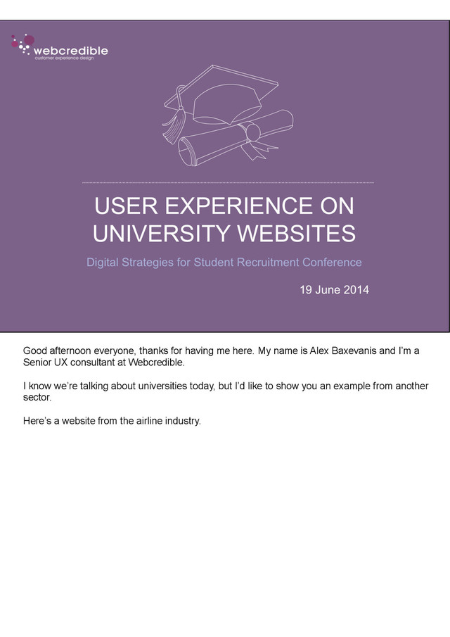 is Alex Baxevanis and I’m a Senior UX consultant at Webcredible. I know we’re talking about universities today, but I’d like to show you an example from another sector. Here’s a website from the airline industry.