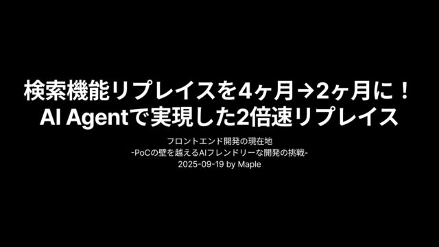 検索機能リプレイスを4ヶ月→2ヶ月に! AI Agentで実現した2倍速リプレイス フロントエンド開発の現在地 -PoCの壁を越えるAIフレンドリーな開発の挑戦- 2025-09-19 by Maple